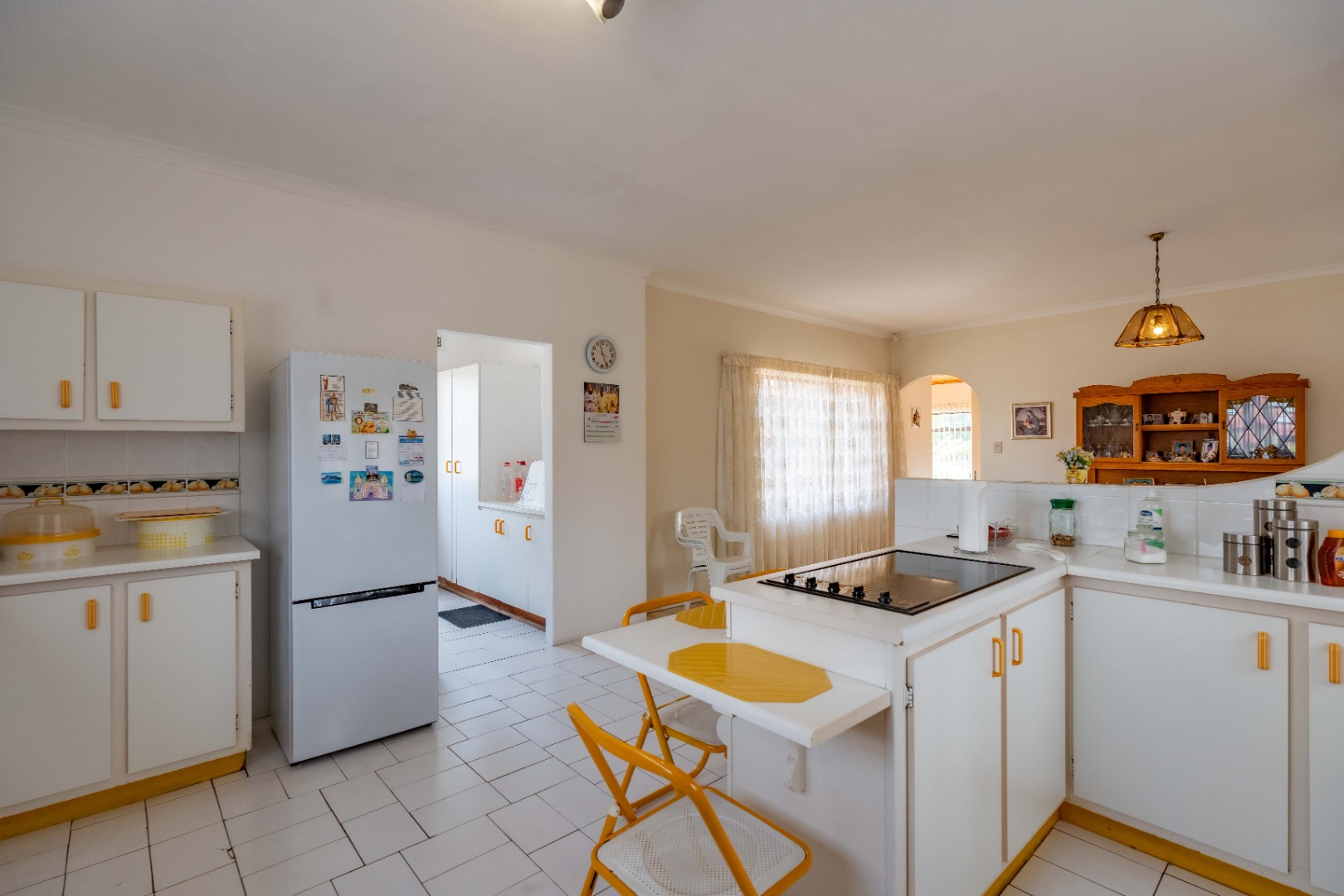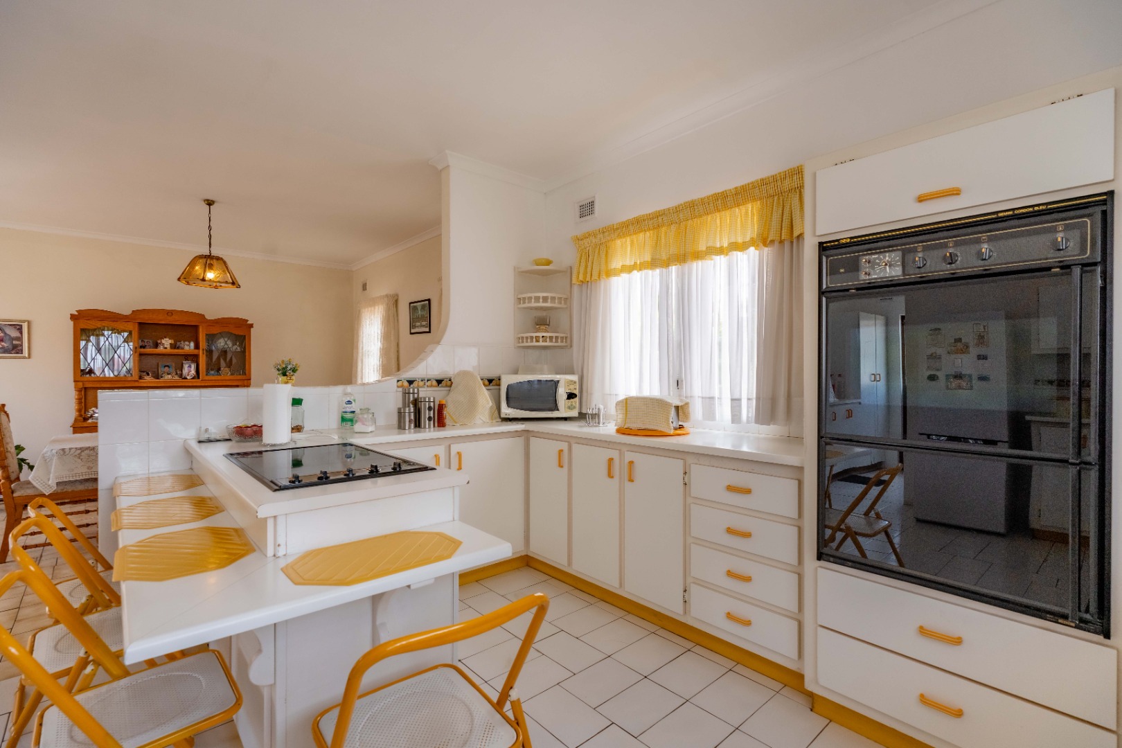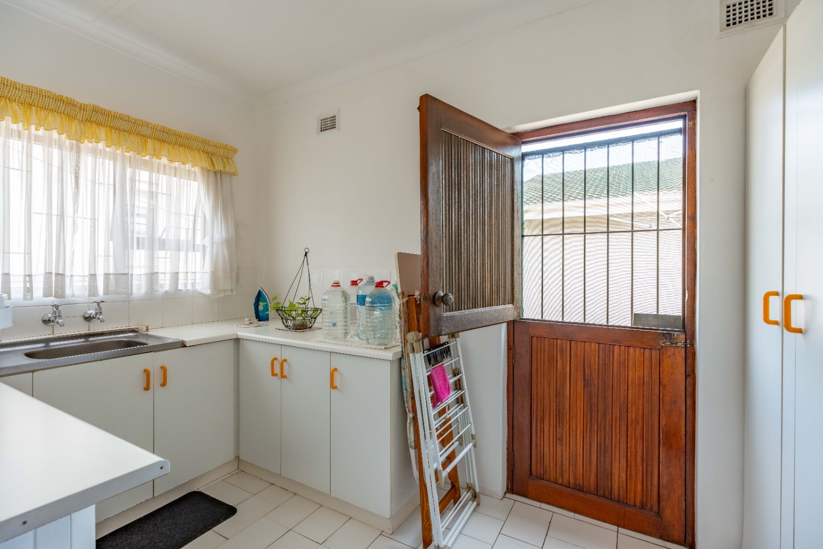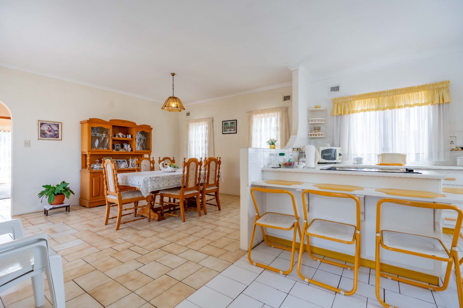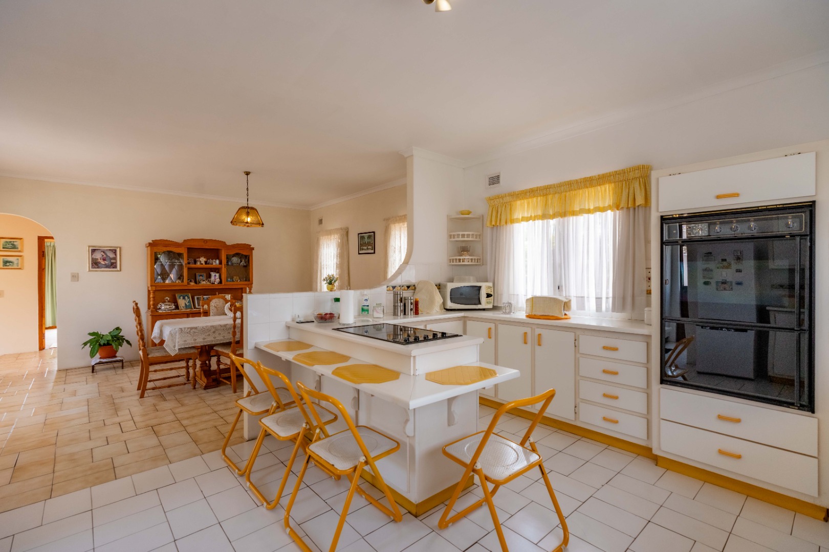This spacious family home offers generously sized rooms and high ceilings, creating a wonderful sense of light and openness throughout. A welcoming entrance hall leads to the lounge and formal dining room or TV room, both of which open through doors to the lovely garden, perfect for indoor-outdoor living. The family dining room is conveniently positioned next to the kitchen, making entertaining effortless. The bright, well-designed kitchen features ample cupboards and counter space, a hob, double ovens, a double sink and a breakfast counter – ideal for relaxed, informal meals. A large scullery keeps the kitchen clutter-free and is plumbed for a washing machine, offering additional counter space, a double sink and plenty storage. From either the lounge or the scullery, you can access a charming courtyard – a delightful spot to soak up the winter sun.
