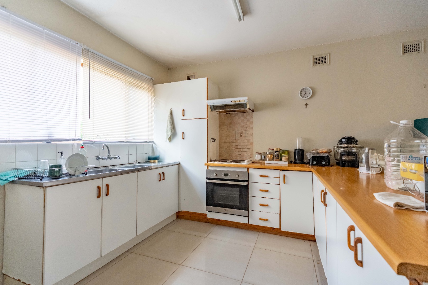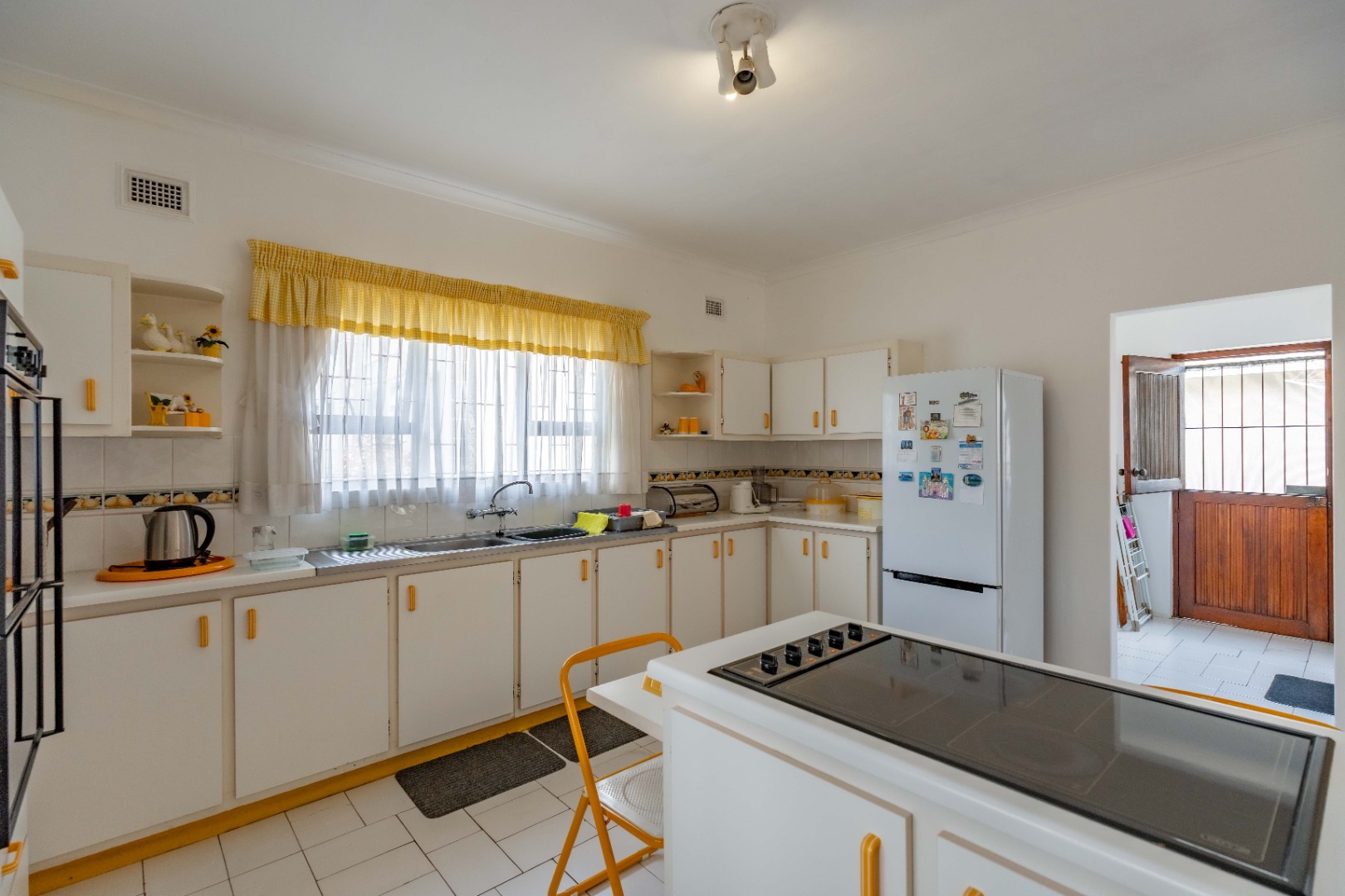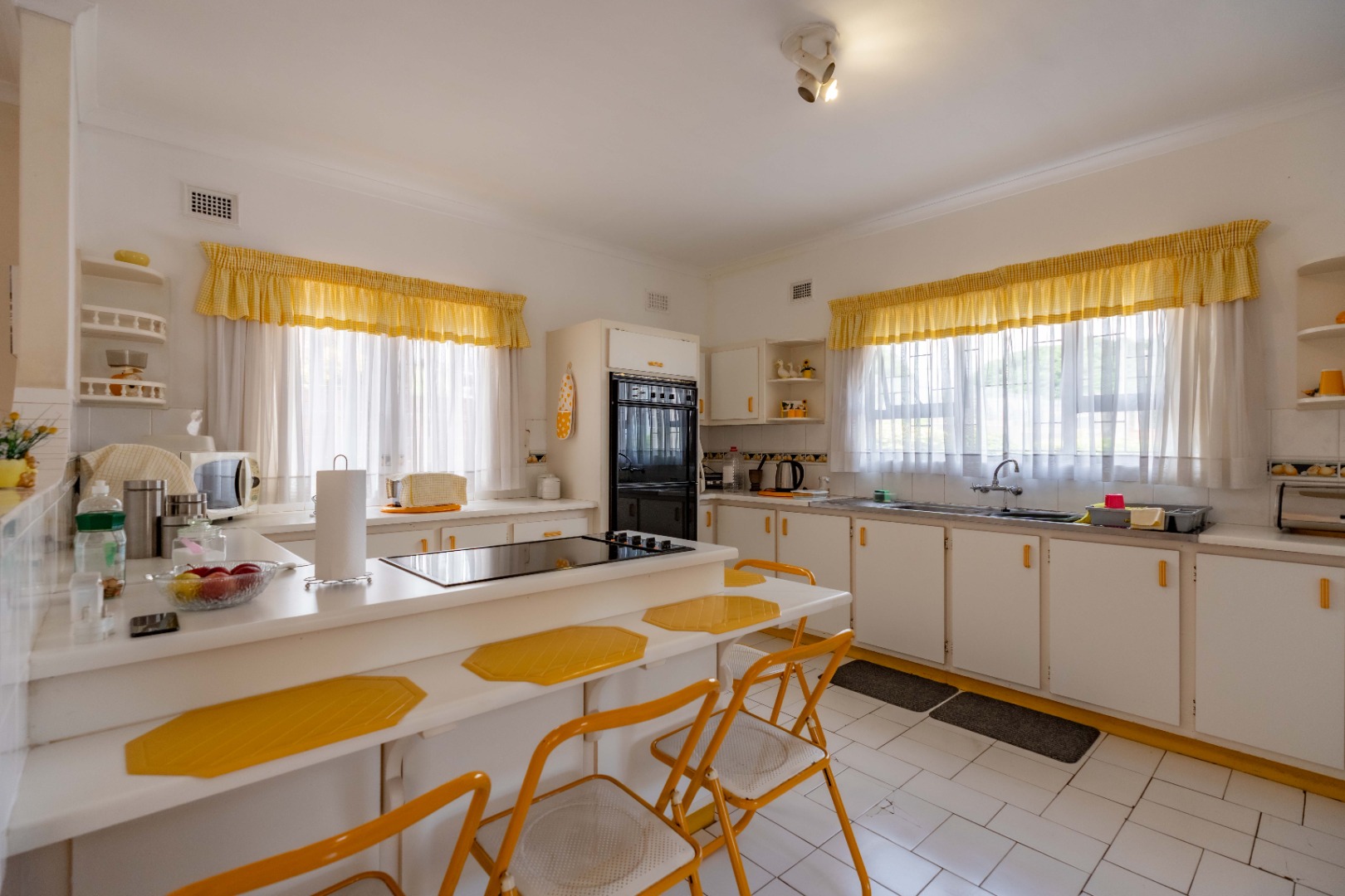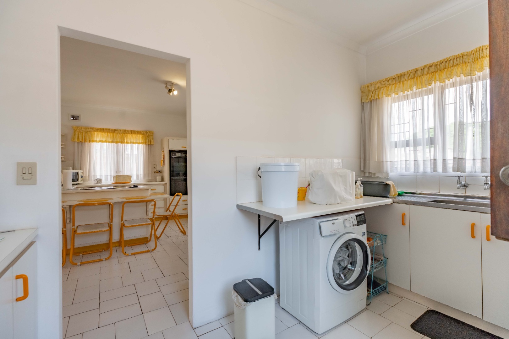 This spacious family home offers generously sized rooms and high ceilings, creating a wonderful sense of light and openness throughout. A welcoming entrance hall leads to the lounge and formal dining room or TV room, both of which open through doors to the lovely garden, perfect for indoor-outdoor living. The family dining room is conveniently positioned next to the kitchen, making entertaining effortless. The bright, well-designed kitchen features ample cupboards and counter space, a hob, double ovens, a double sink and a breakfast counter – ideal for relaxed, informal meals. A large scullery keeps the kitchen clutter-free and is plumbed for a washing machine, offering additional counter space, a double sink and plenty storage. From either the lounge or the scullery, you can access a charming courtyard – a delightful spot to soak up the winter sun.