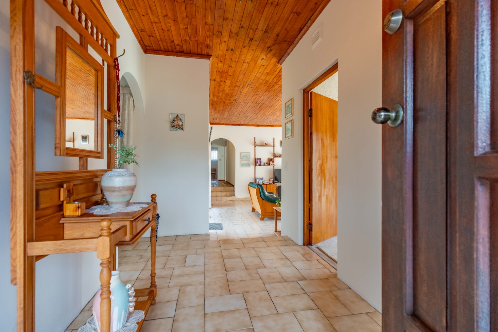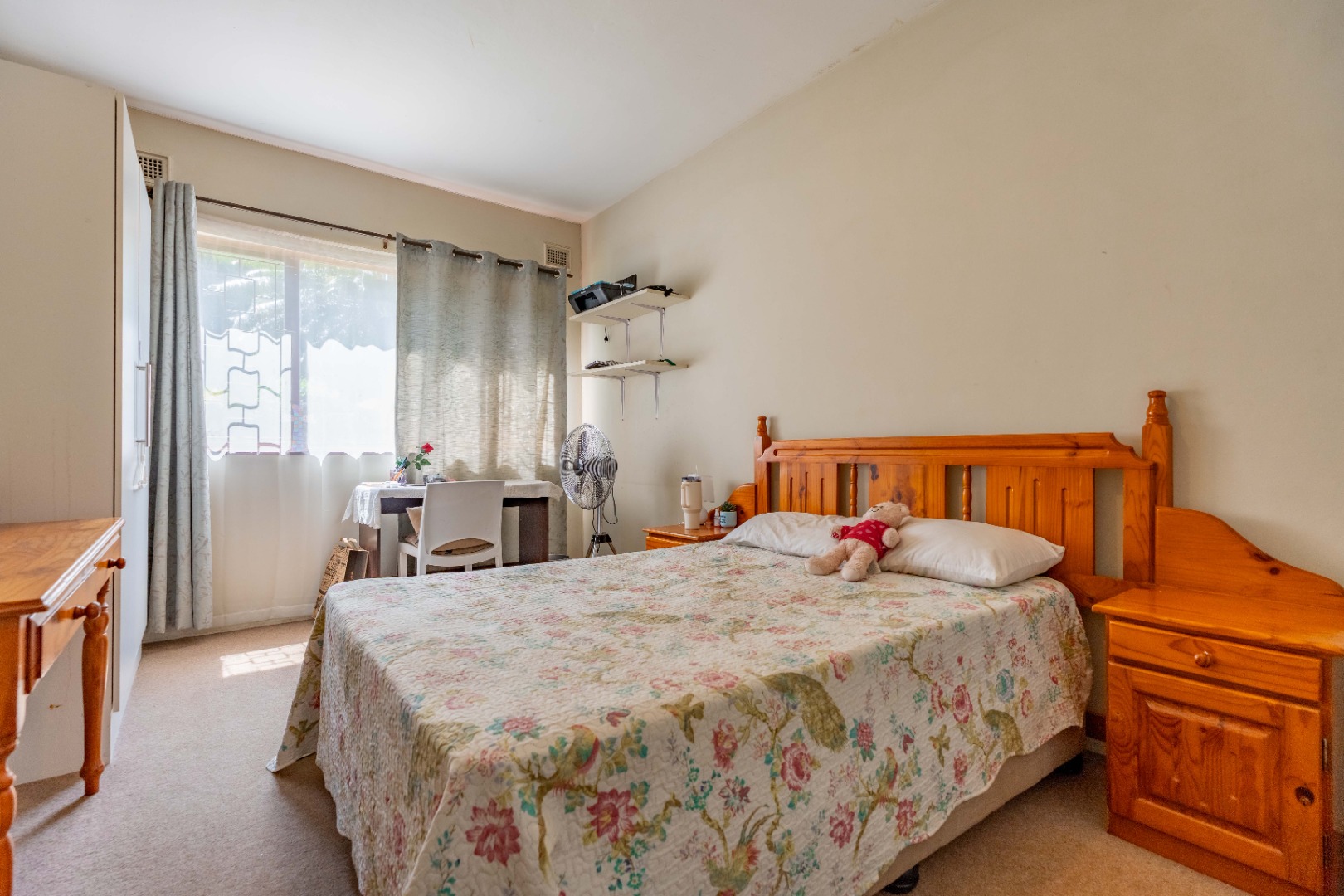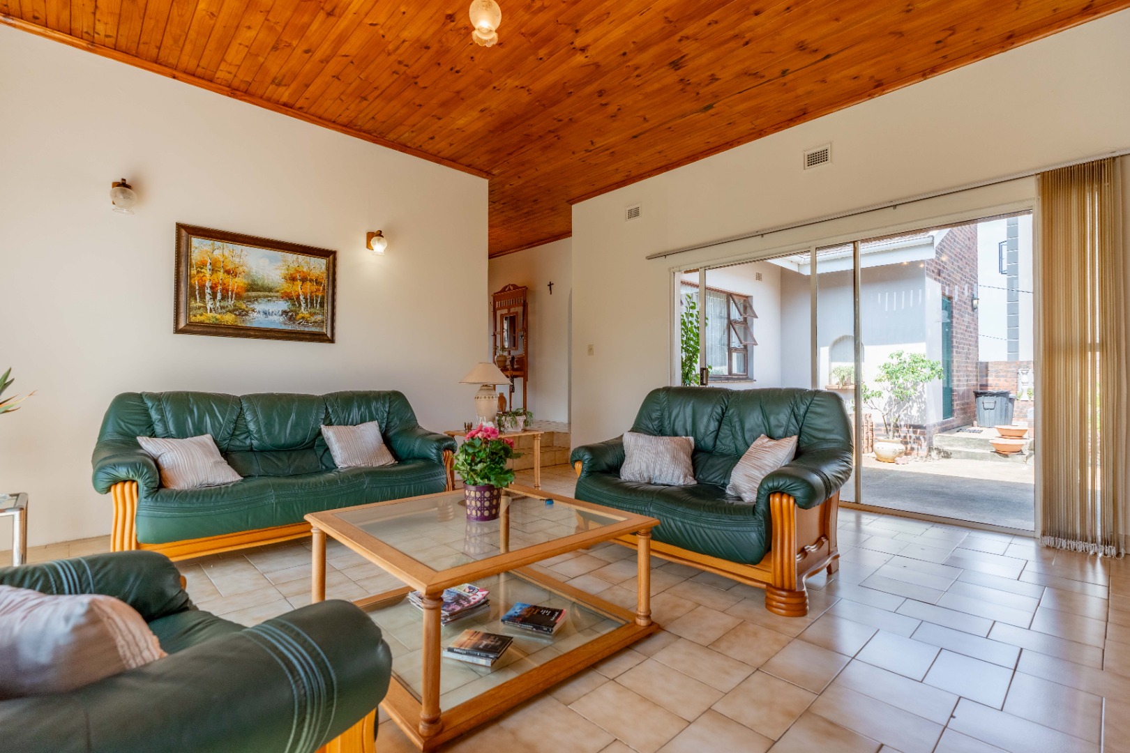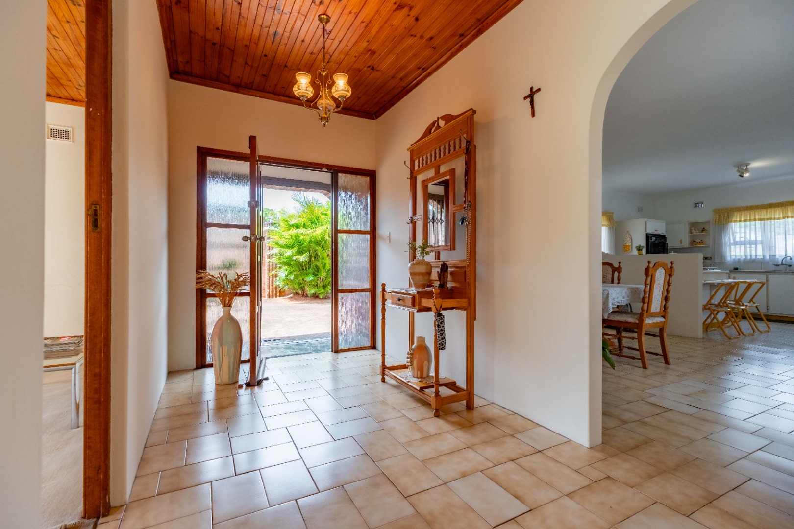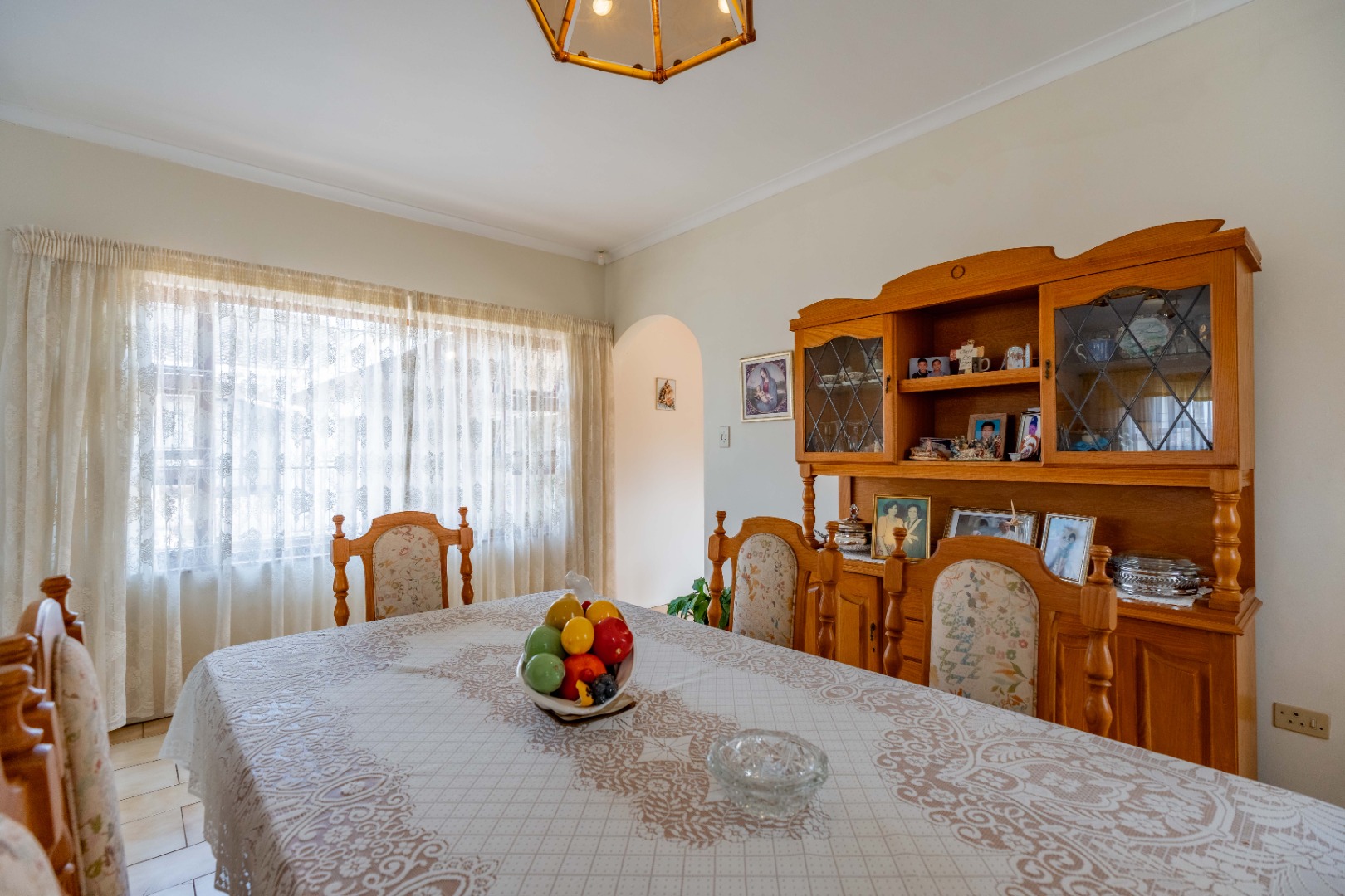 This spacious family home offers generously sized rooms and high ceilings, creating a wonderful sense of light and openness throughout. A welcoming entrance hall leads to the lounge and formal dining room or TV room, both of which open through doors to the lovely garden, perfect for indoor-outdoor living. The family dining room is conveniently positioned next to the kitchen, making entertaining effortless. The bright, well-designed kitchen features ample cupboards and counter space, a hob, double ovens, a double sink and a breakfast counter – ideal for relaxed, informal meals. A large scullery keeps the kitchen clutter-free and is plumbed for a washing machine, offering additional counter space, a double sink and plenty storage. From either the lounge or the scullery, you can access a charming courtyard – a delightful spot to soak up the winter sun.