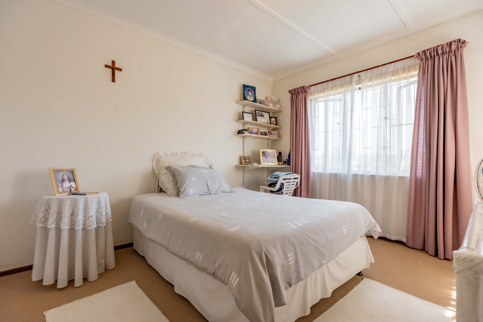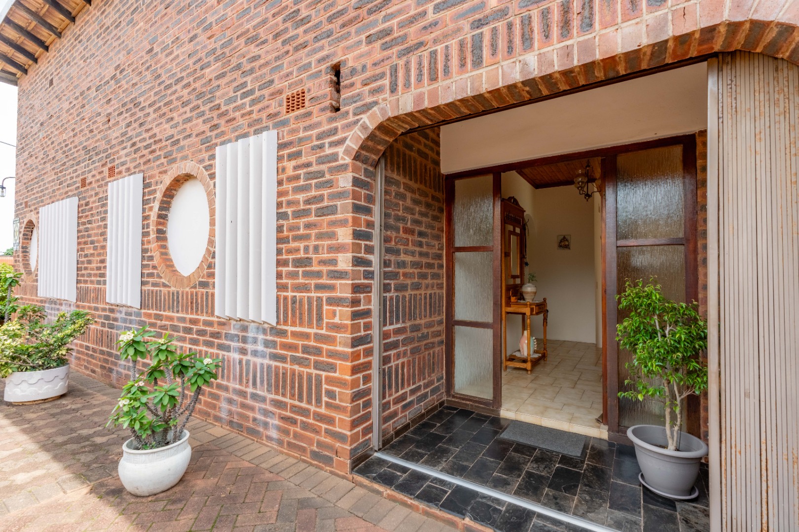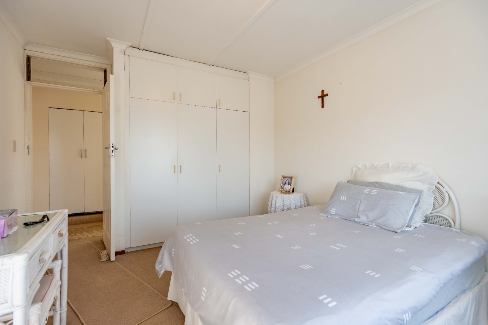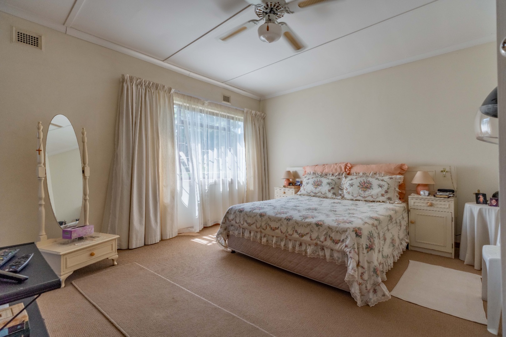 This spacious family home offers generously sized rooms and high ceilings, creating a wonderful sense of light and openness throughout. A welcoming entrance hall leads to the lounge and formal dining room or TV room, both of which open through doors to the lovely garden, perfect for indoor-outdoor living. The family dining room is conveniently positioned next to the kitchen, making entertaining effortless. The bright, well-designed kitchen features ample cupboards and counter space, a hob, double ovens, a double sink and a breakfast counter – ideal for relaxed, informal meals. A large scullery keeps the kitchen clutter-free and is plumbed for a washing machine, offering additional counter space, a double sink and plenty storage. From either the lounge or the scullery, you can access a charming courtyard – a delightful spot to soak up the winter sun.