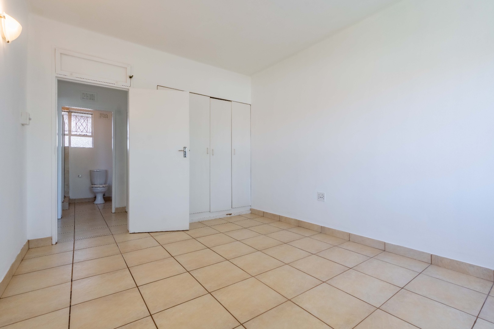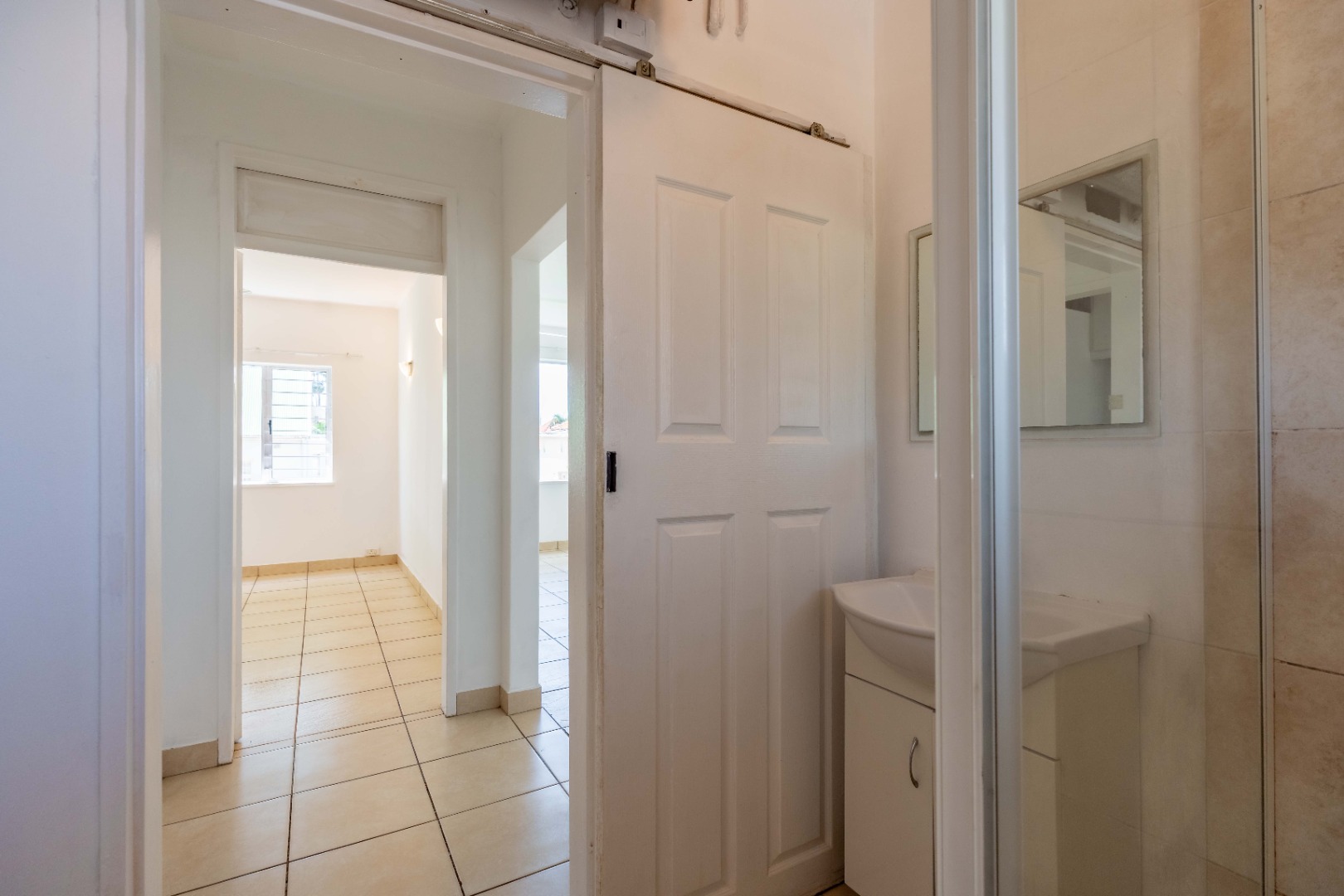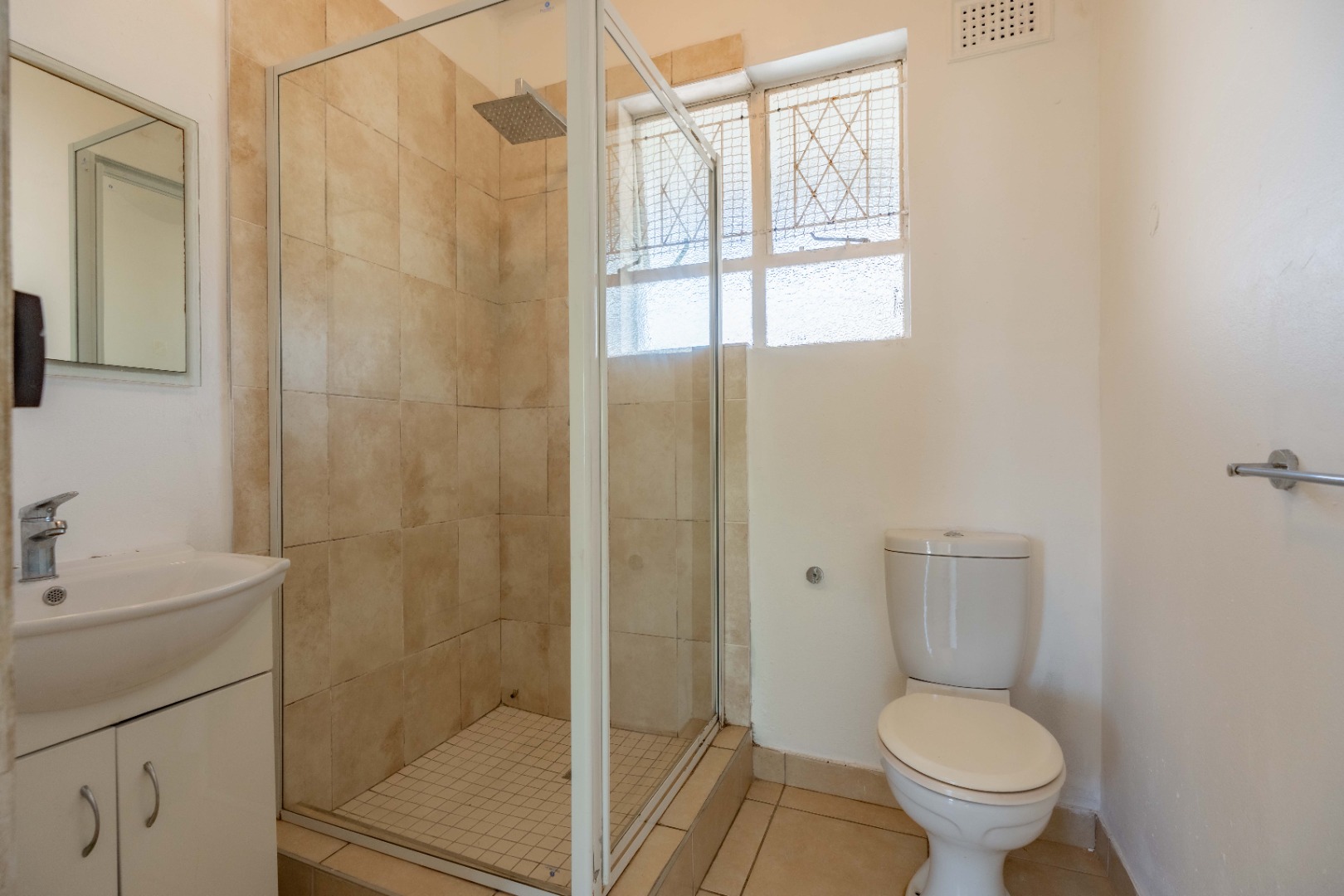 The generously sized bedroom is bathed in natural light and features built-in cupboards for seamless storage. A neat, modern bathroom with a shower completes this inviting home.