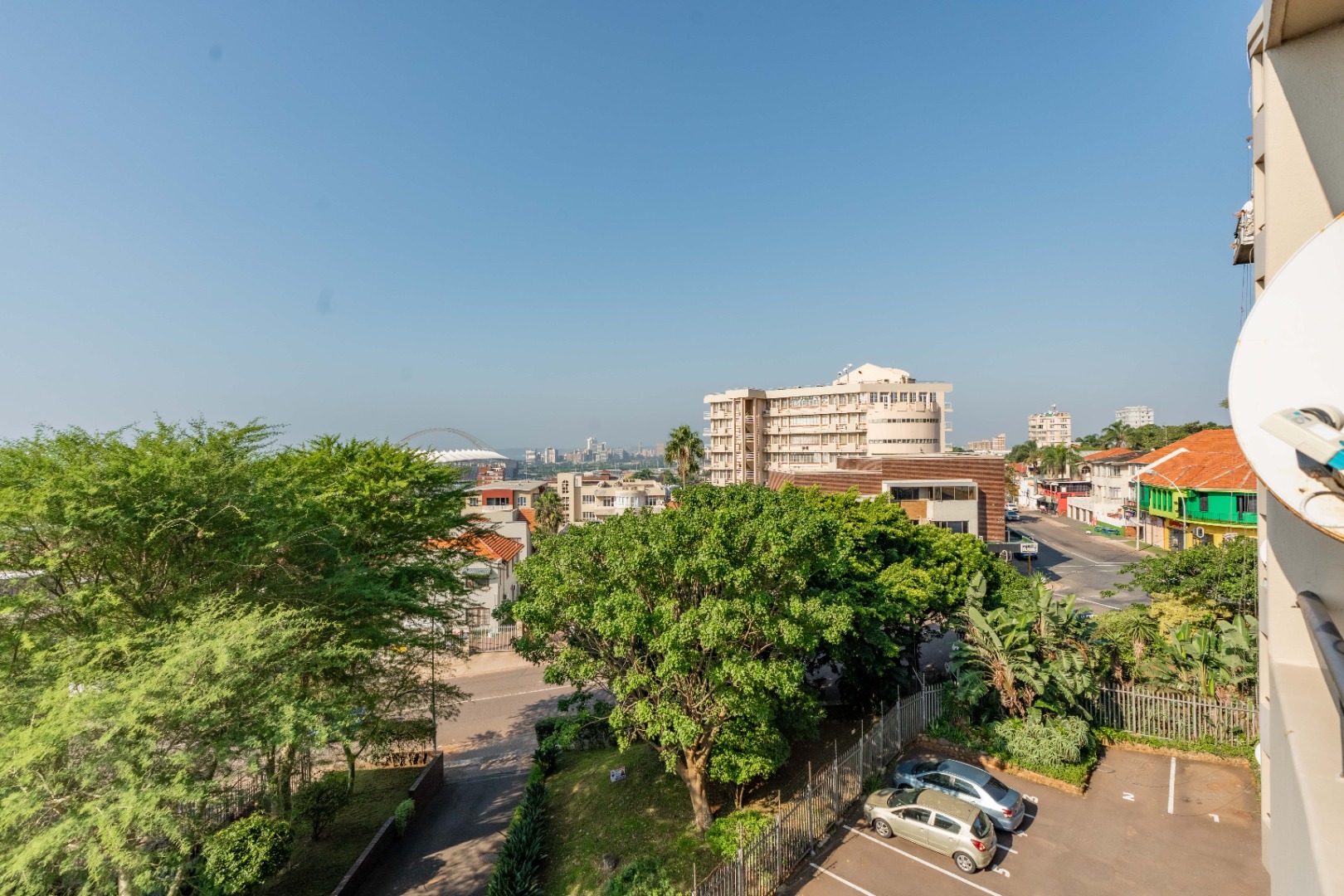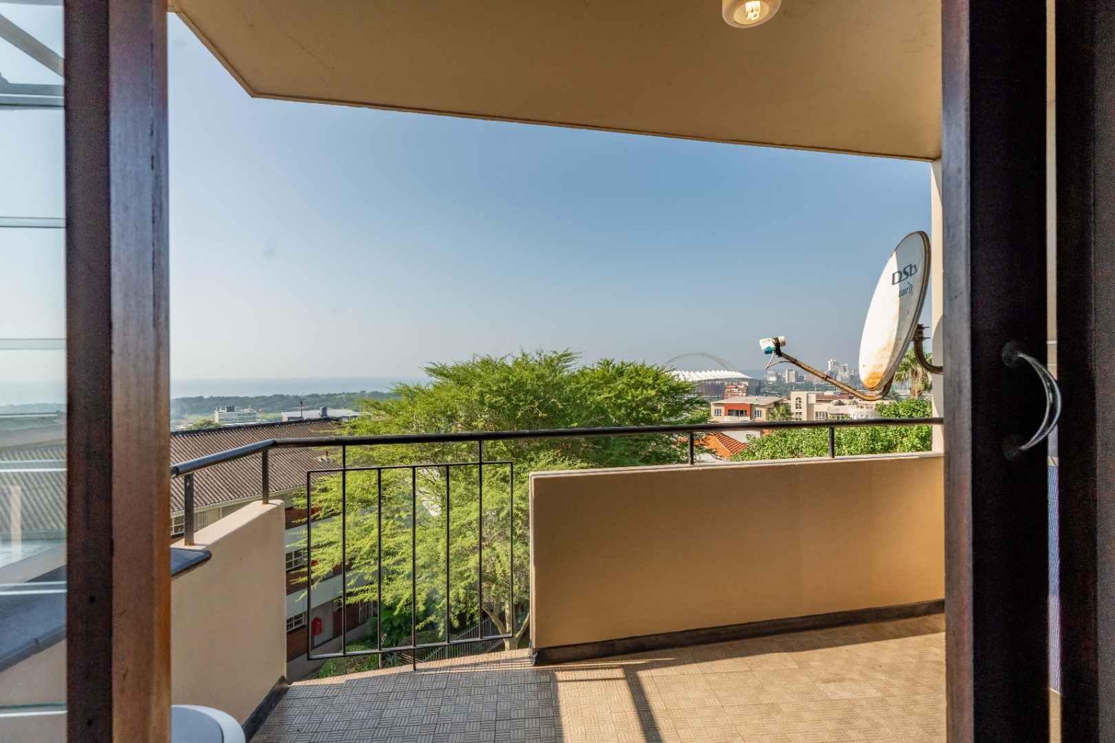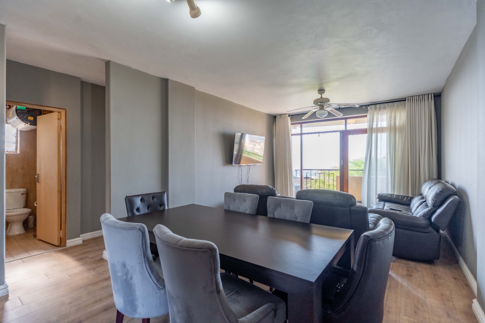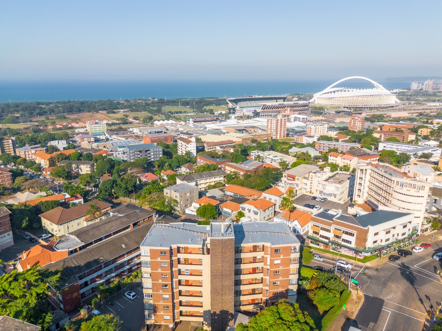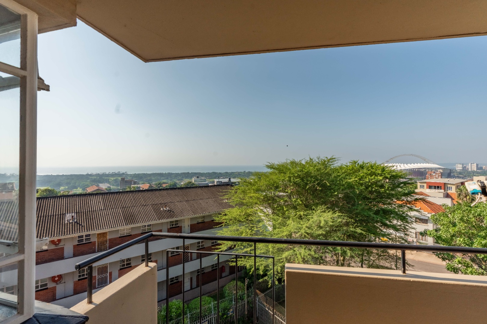 Step through a stylish wooden entrance door with a glass feature into a bright, open-plan living space. The modern kitchen is beautifully finished with granite countertops, an eye-level oven, and ample cupboard space—perfect for both everyday cooking and entertaining. The open-plan dining and living area features laminated flooring, a ceiling fan, and leads seamlessly onto a private balcony offering breathtaking views of Durban, the stadium, and the sea.
