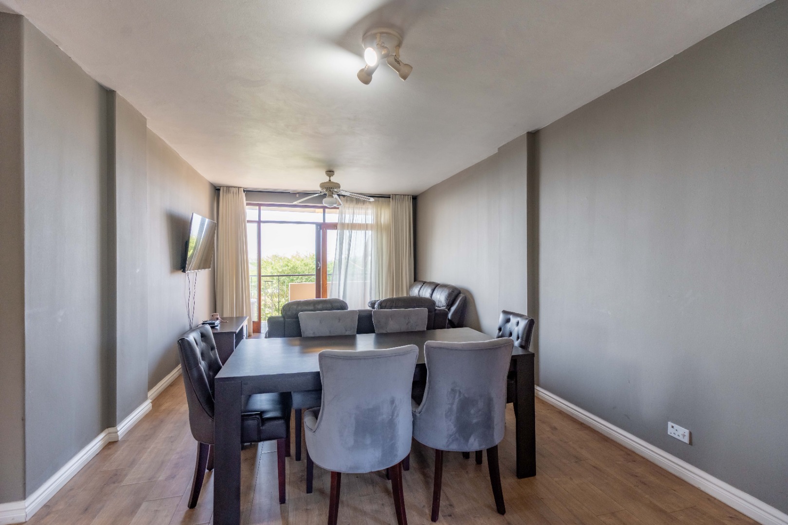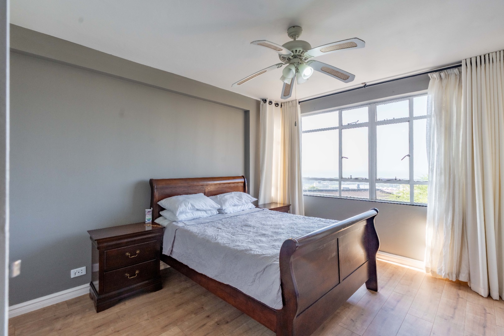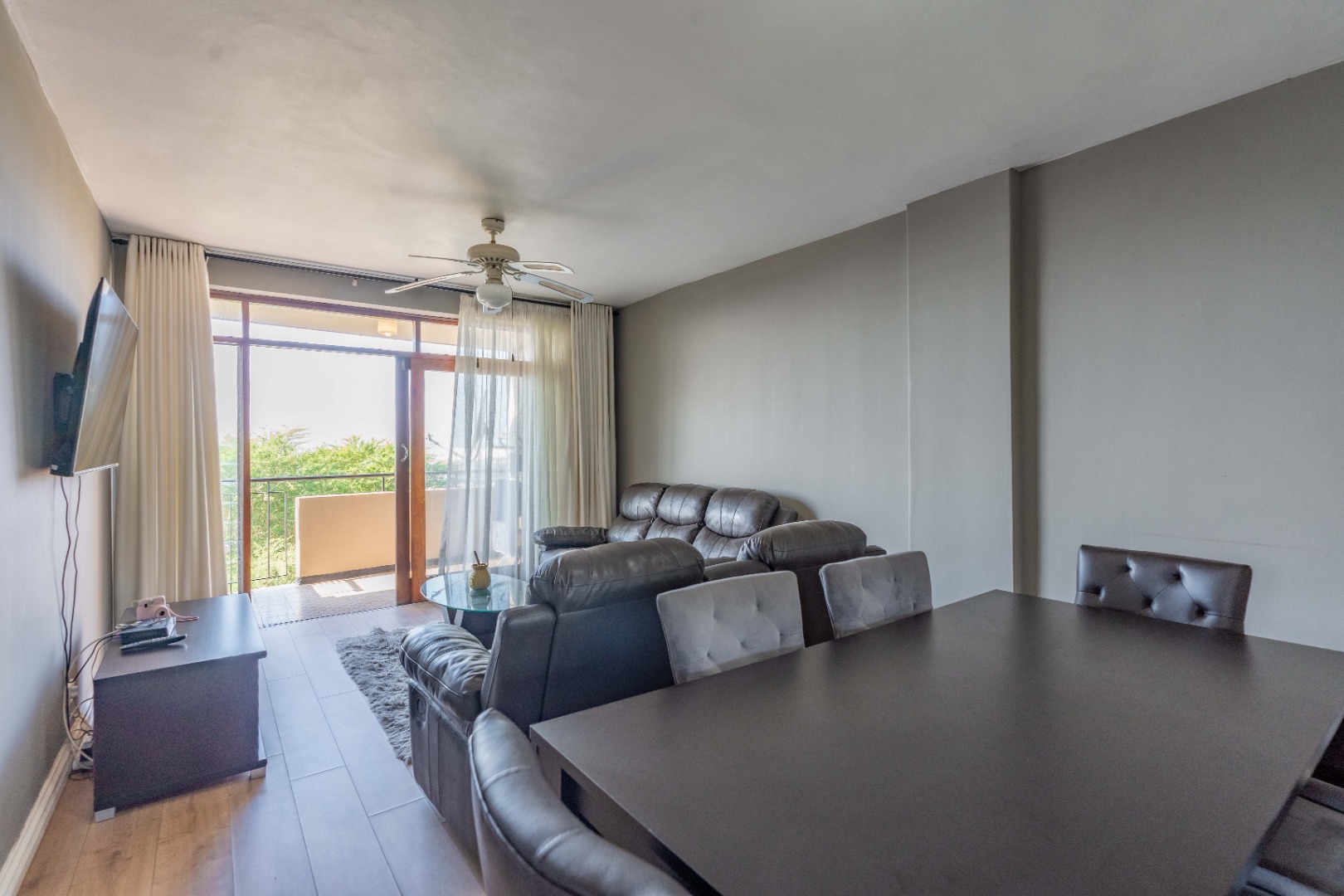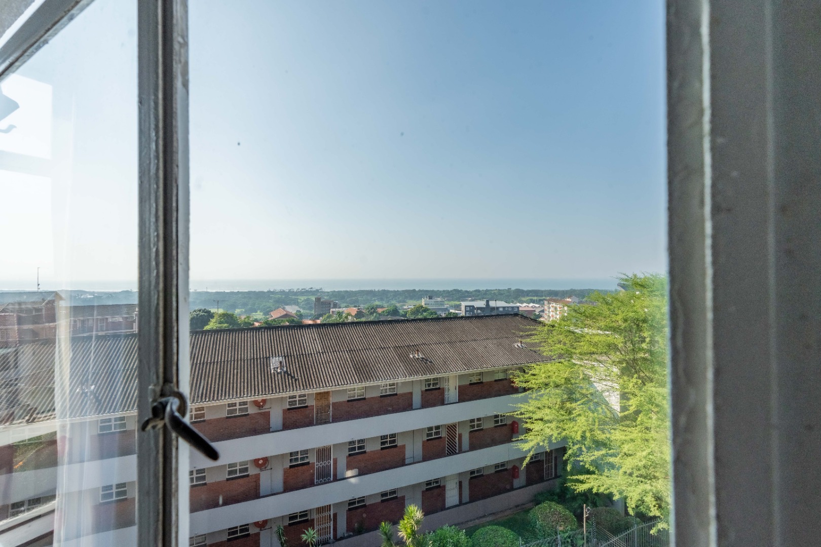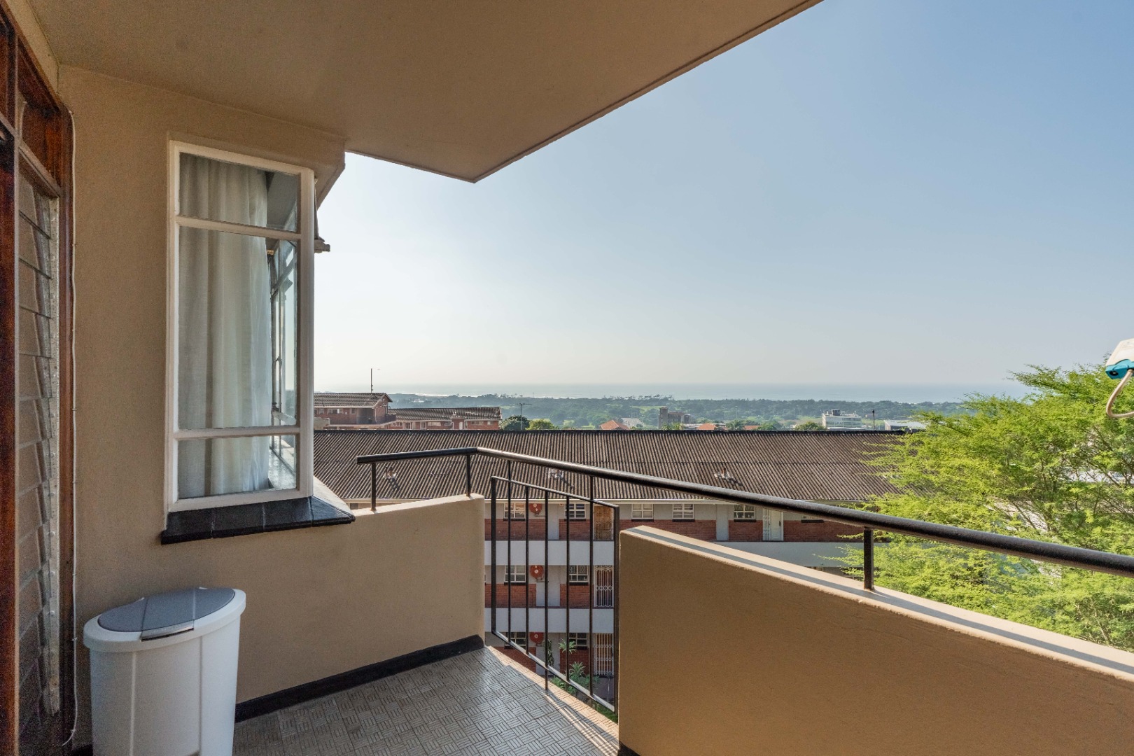 Step through a stylish wooden entrance door with a glass feature into a bright, open-plan living space. The modern kitchen is beautifully finished with granite countertops, an eye-level oven, and ample cupboard space—perfect for both everyday cooking and entertaining. The open-plan dining and living area features laminated flooring, a ceiling fan, and leads seamlessly onto a private balcony offering breathtaking views of Durban, the stadium, and the sea.