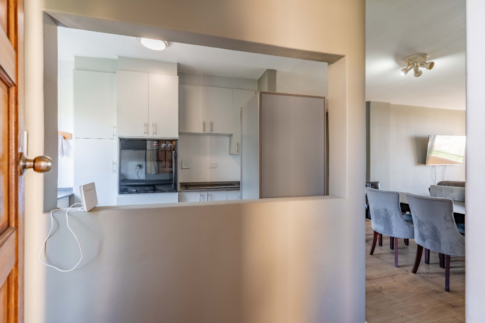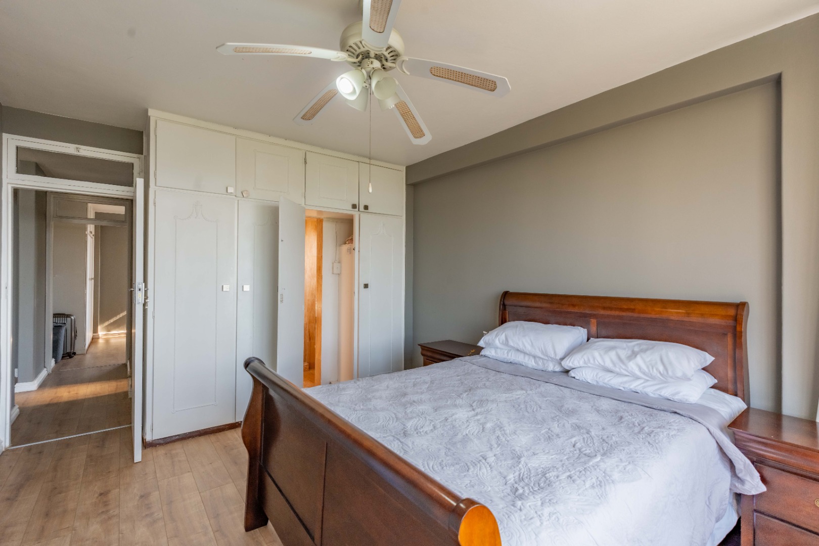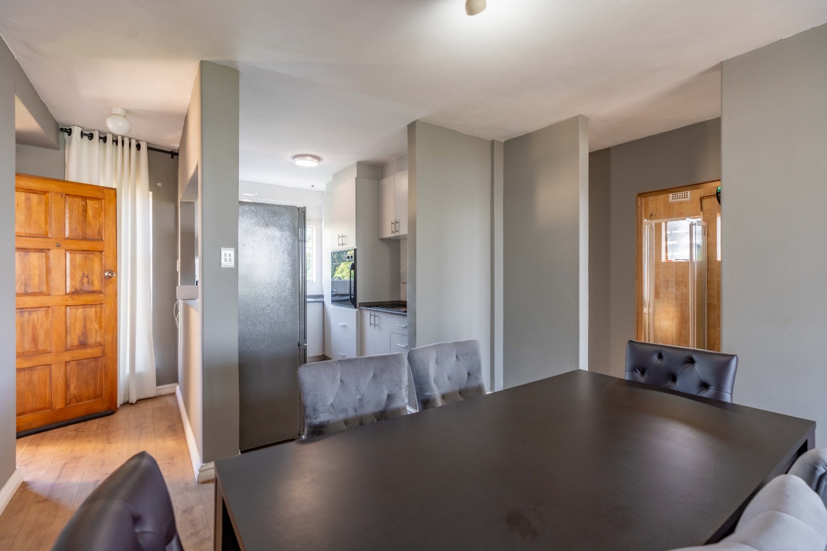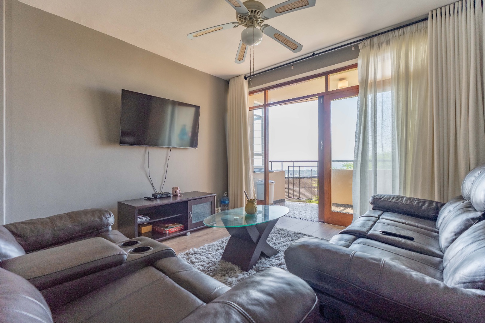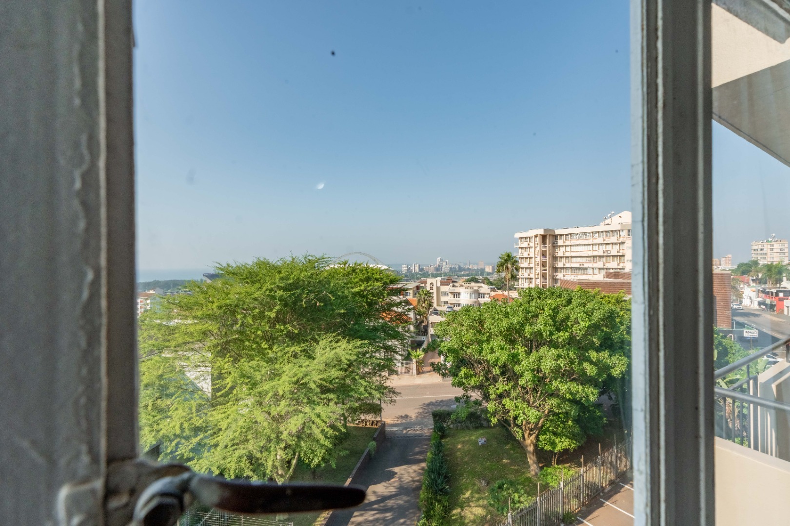 Step through a stylish wooden entrance door with a glass feature into a bright, open-plan living space. The modern kitchen is beautifully finished with granite countertops, an eye-level oven, and ample cupboard space—perfect for both everyday cooking and entertaining. The open-plan dining and living area features laminated flooring, a ceiling fan, and leads seamlessly onto a private balcony offering breathtaking views of Durban, the stadium, and the sea.