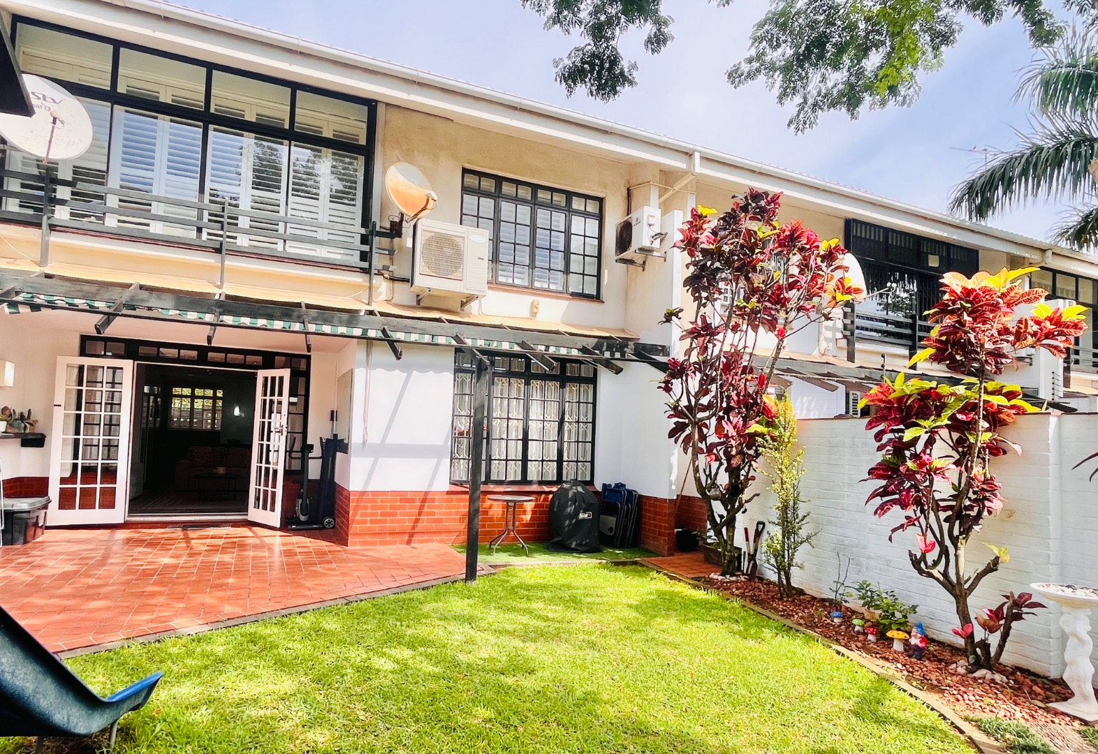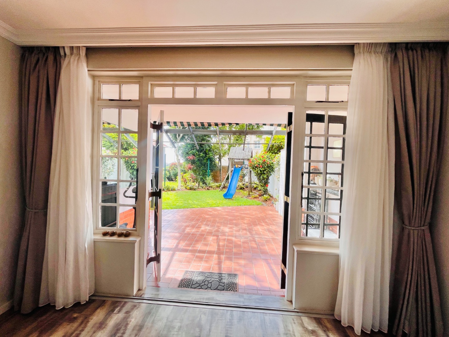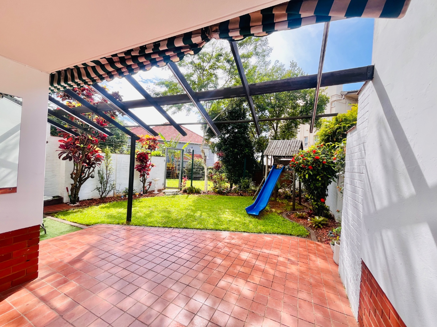 French doors lead out onto a private patio with a retractable awning, creating the perfect space for entertaining or relaxing while overlooking a neat garden.