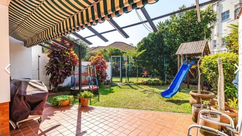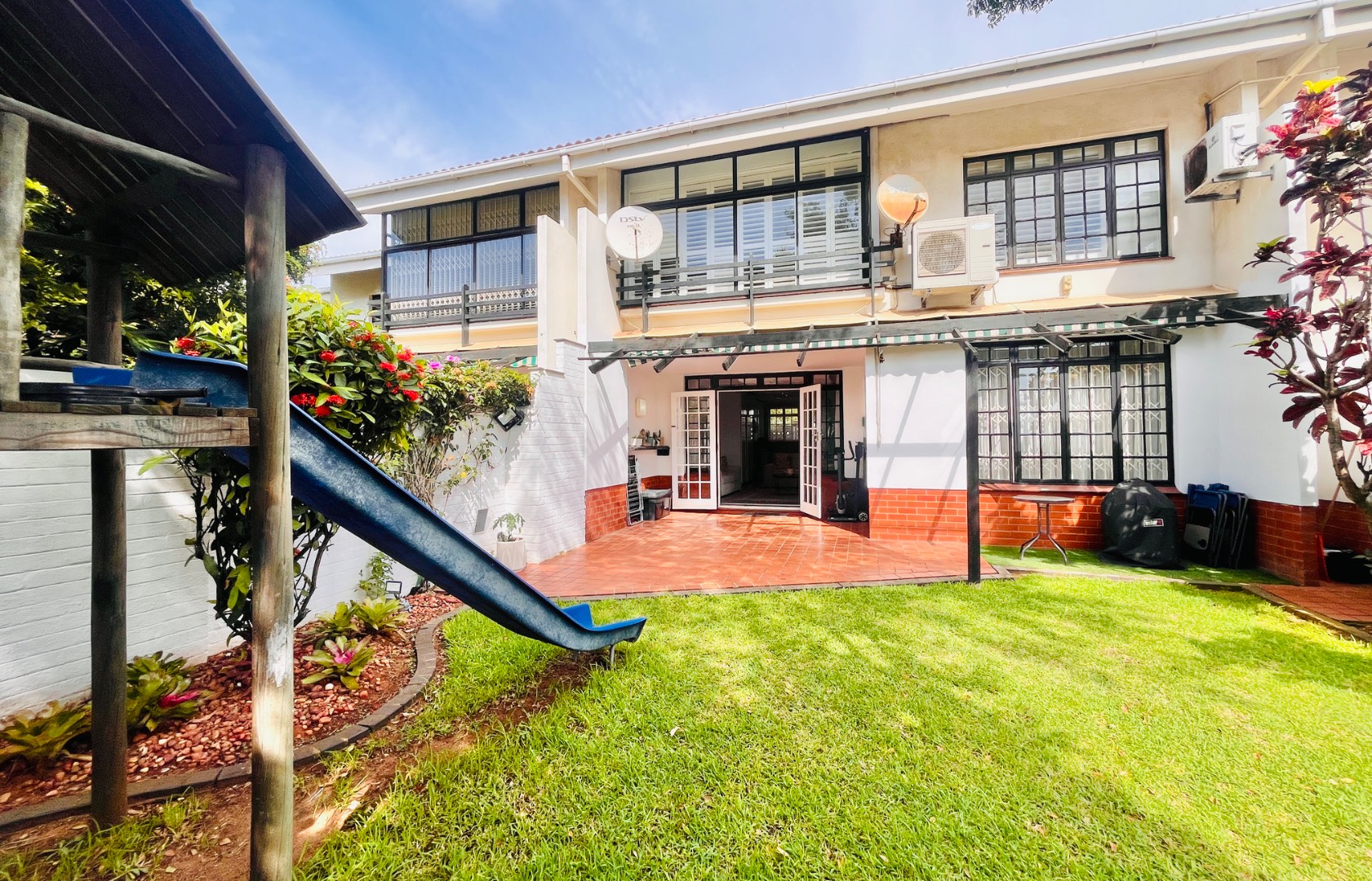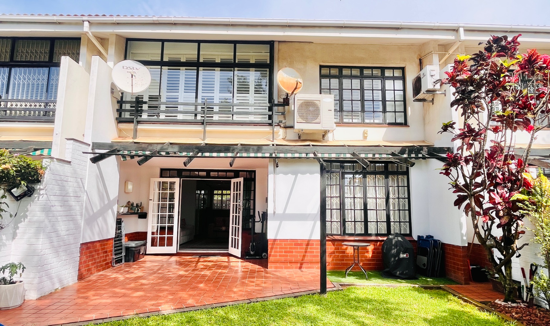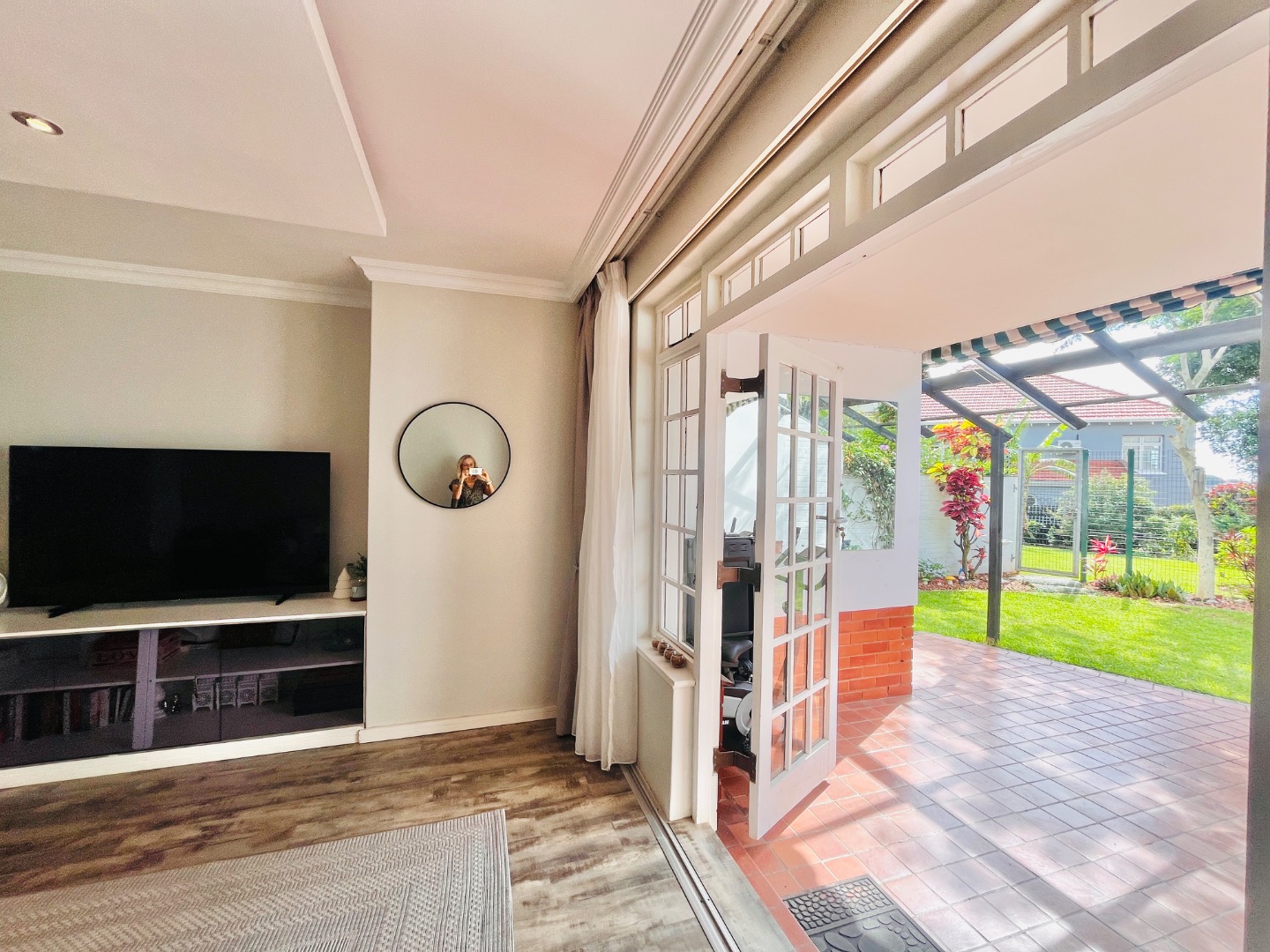 French doors lead out onto a private patio with a retractable awning, creating the perfect space for entertaining or relaxing while overlooking a neat garden.