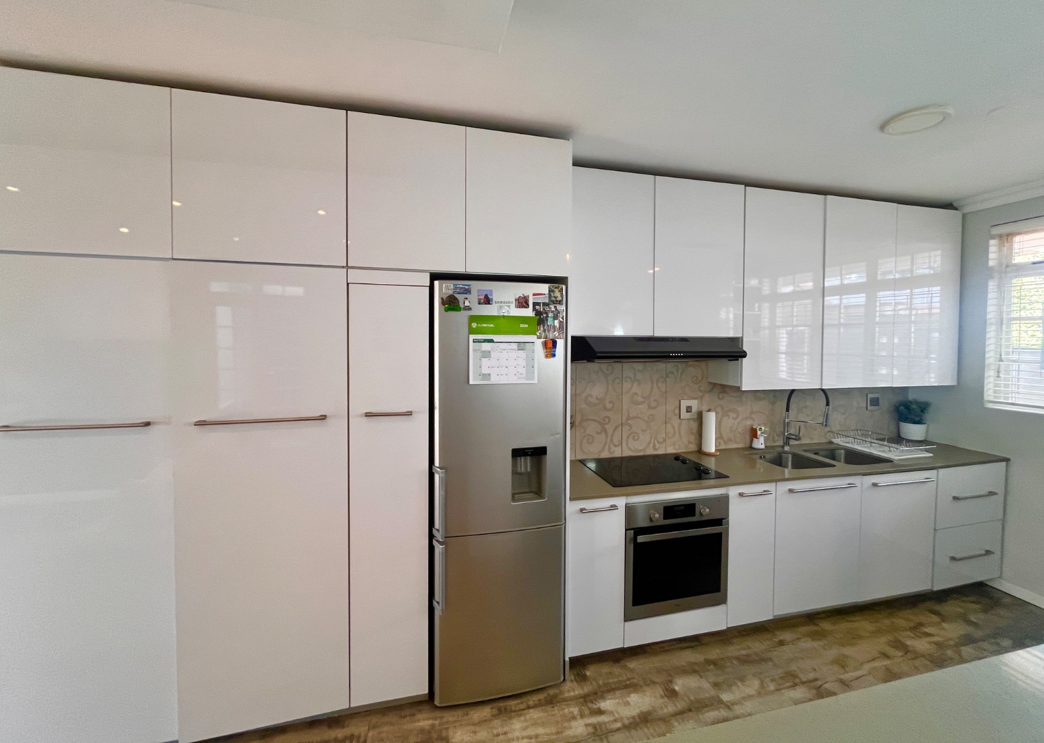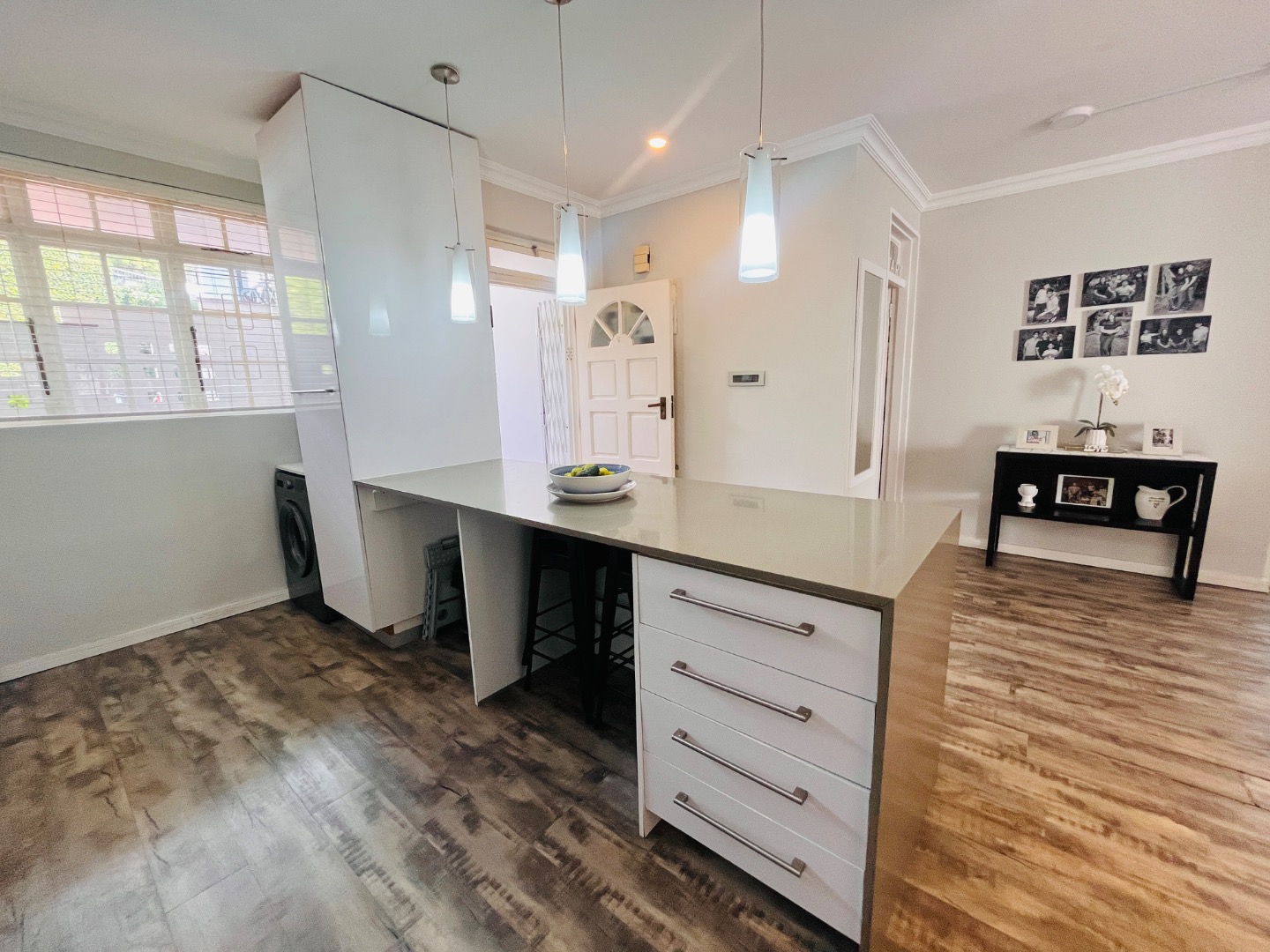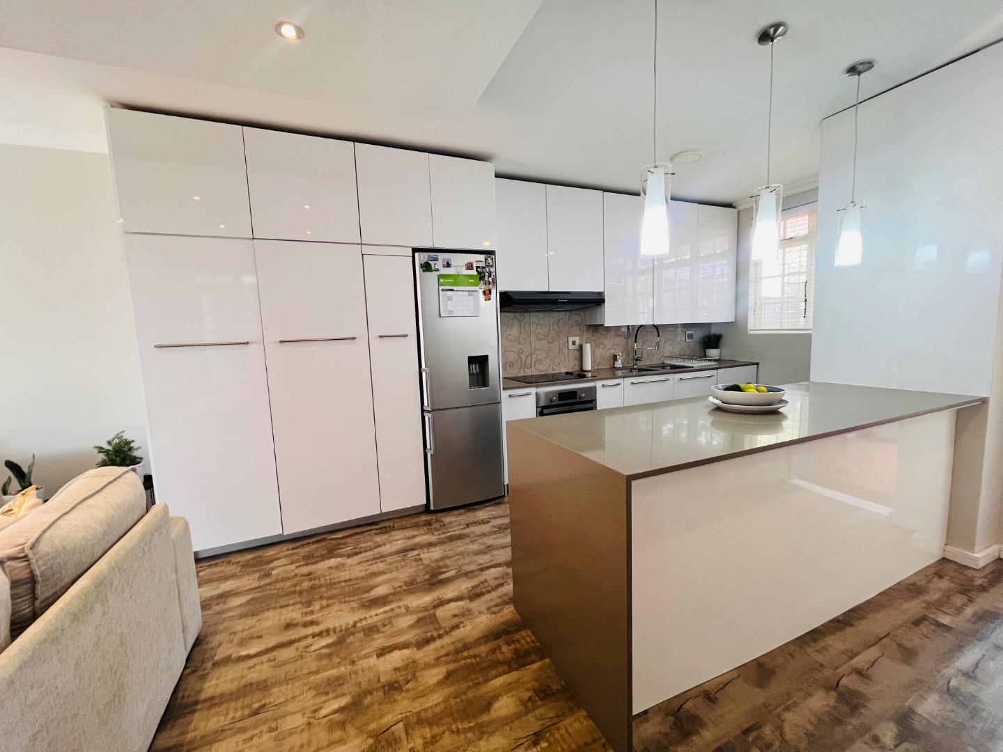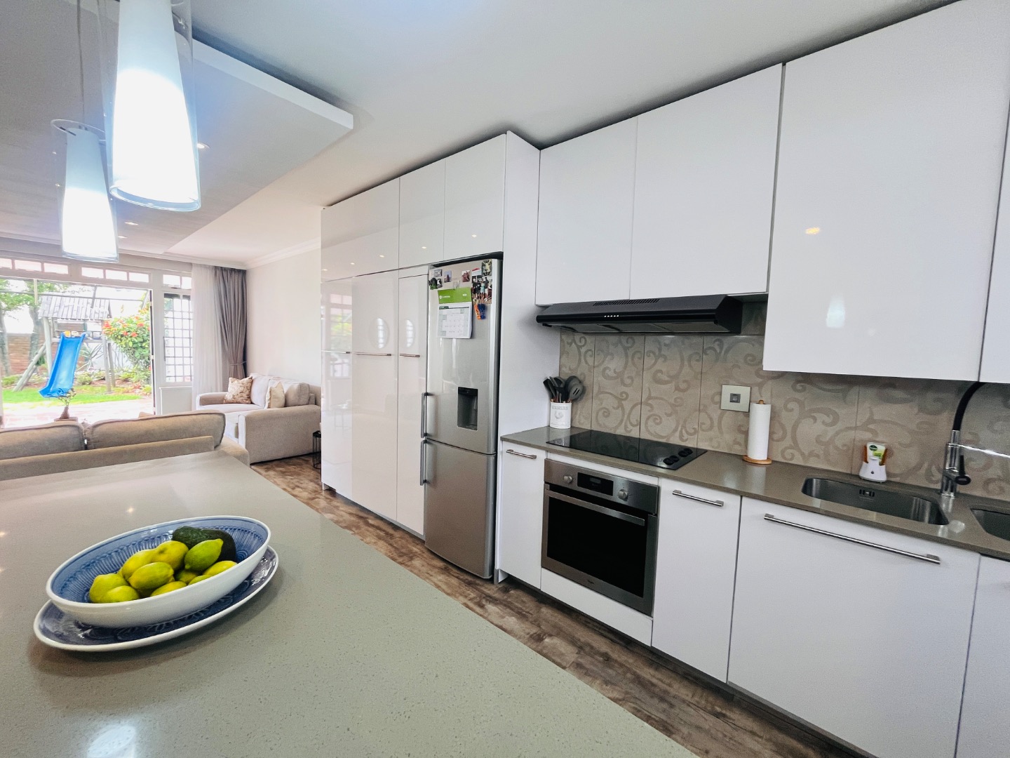 The light-filled, open-plan living area flows seamlessly between the lounge, dining space, and a sleek modern kitchen. Finished with granite countertops and fully fitted with glossy built-in cupboards, the kitchen is both stylish and practical – plumbed for both a washing machine and dishwasher.