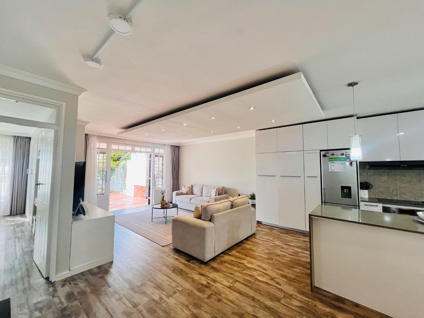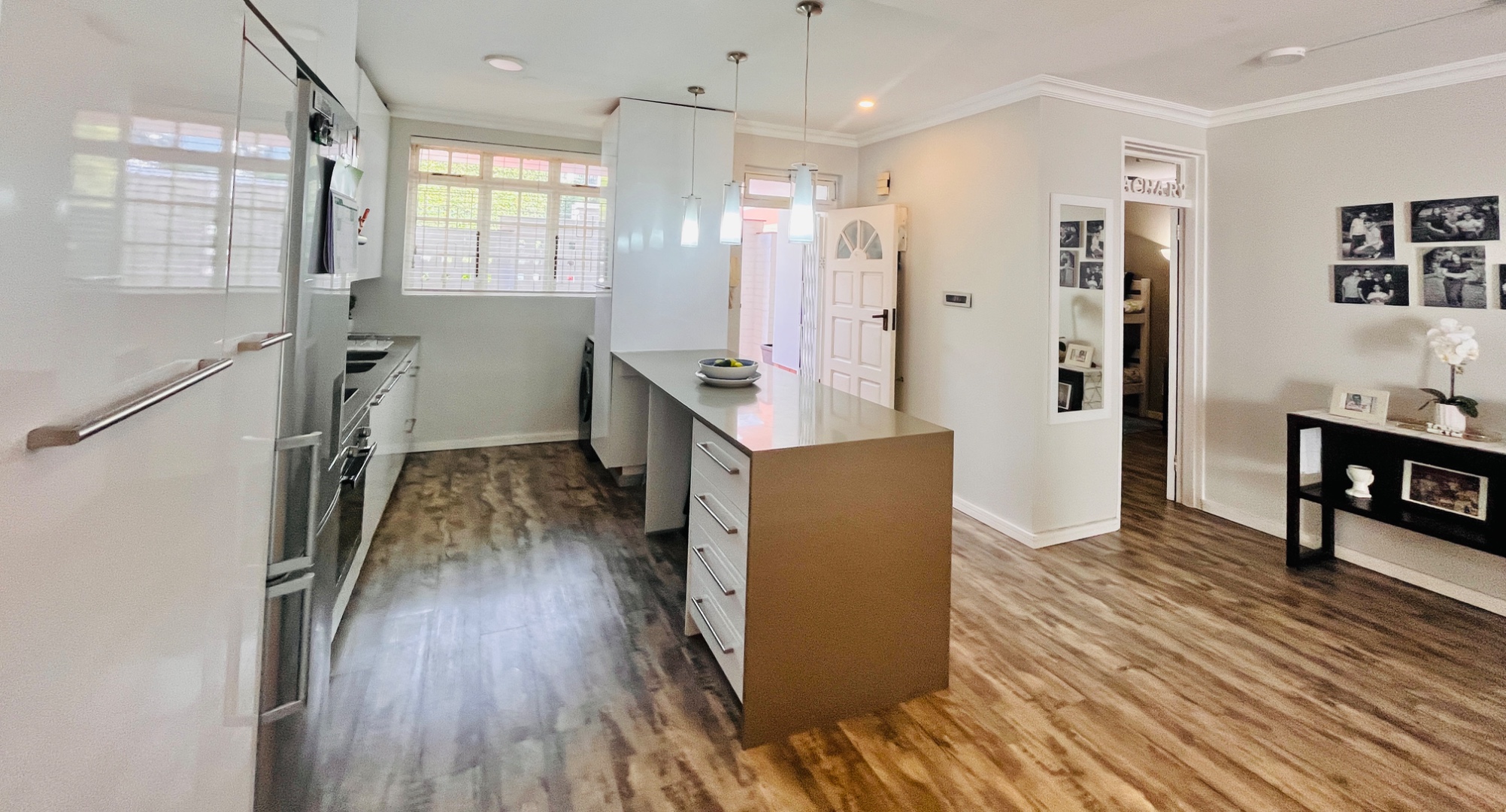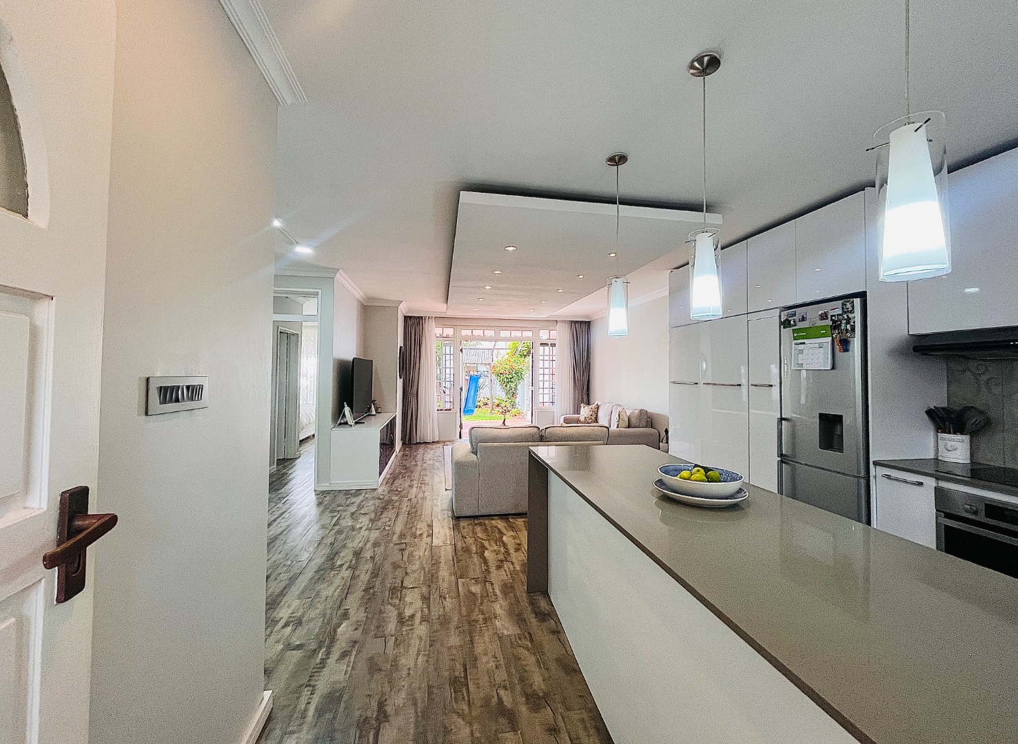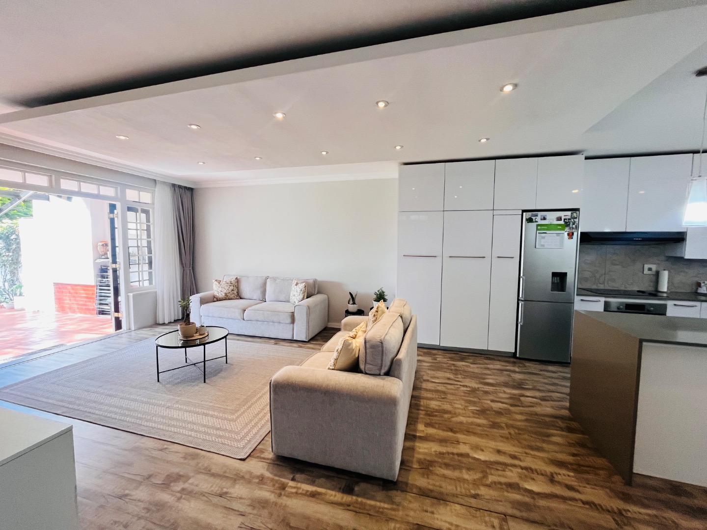 The light-filled, open-plan living area flows seamlessly between the lounge, dining space, and a sleek modern kitchen. Finished with granite countertops and fully fitted with glossy built-in cupboards, the kitchen is both stylish and practical – plumbed for both a washing machine and dishwasher.