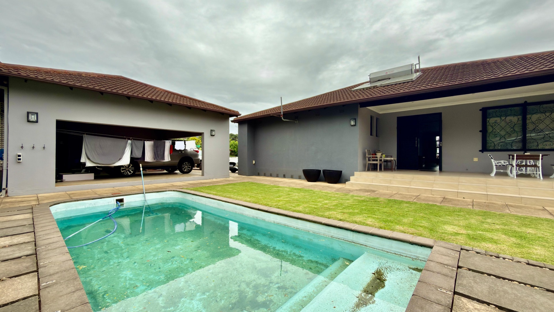 The property boasts its own private pool, an excellent outdoor entertainment area, and additional features such as extra storage space and a dedicated servants' quarters. With parking for up to 12 vehicles, it's ideal for large families or those who love hosting guests.