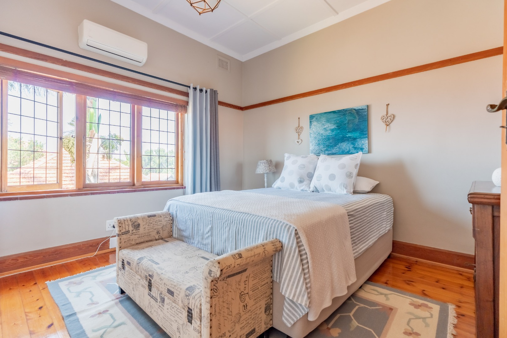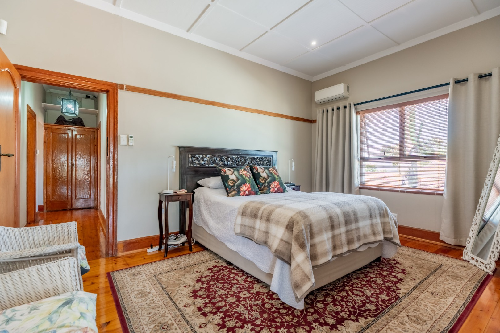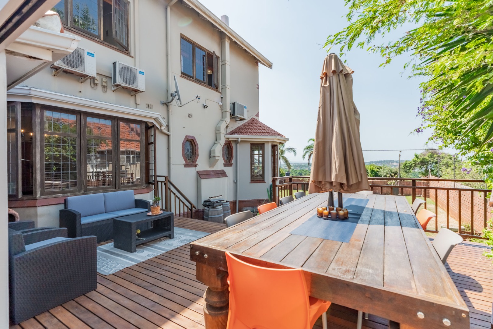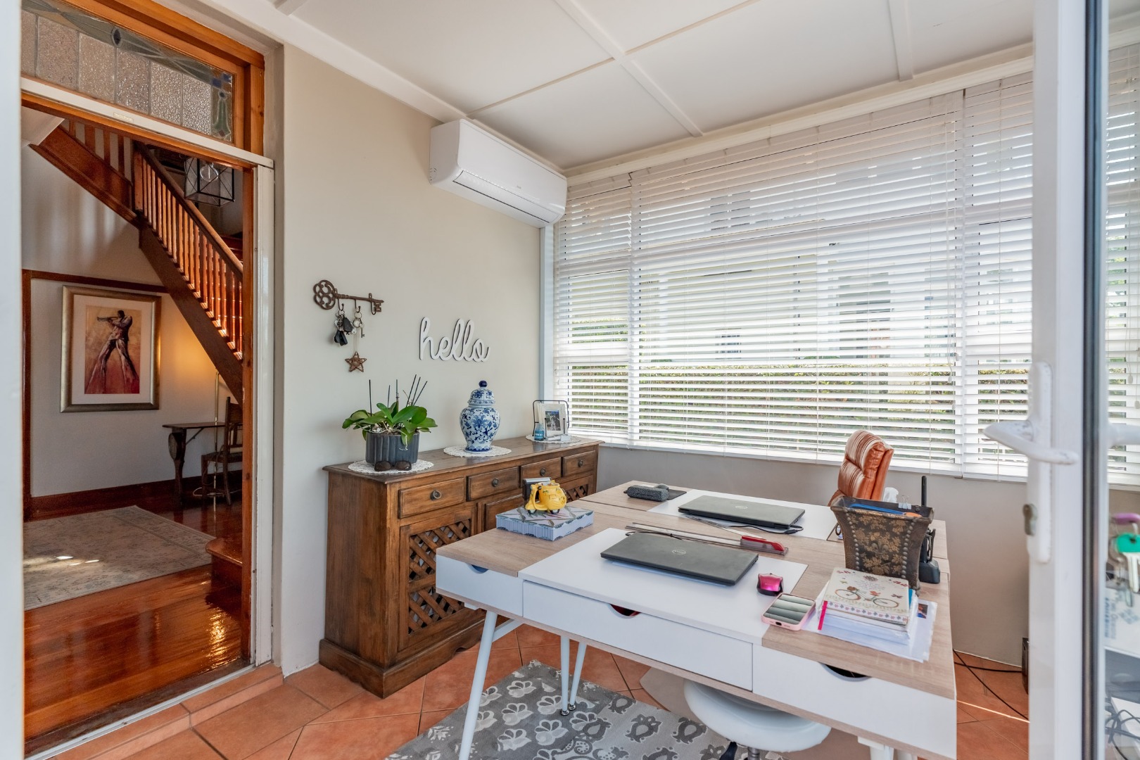 Upstairs, four generously proportioned bedrooms offer comfort and tranquillity, each filled with natural light. Two bedrooms boast en-suite bathrooms, while the remaining two bedrooms share a family bathroom. Each room has an air-conditioner.