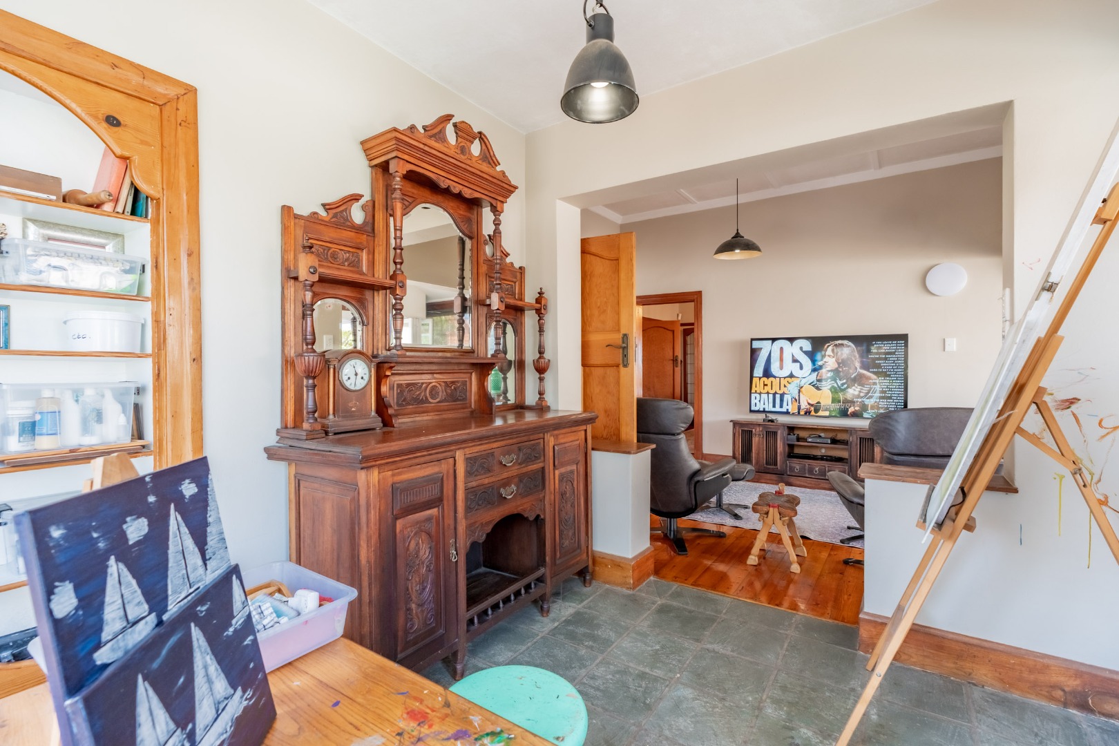 The expansive formal lounge is bathed in natural light, enhanced by exquisite stained-glass windows, and opens seamlessly into an impressive,