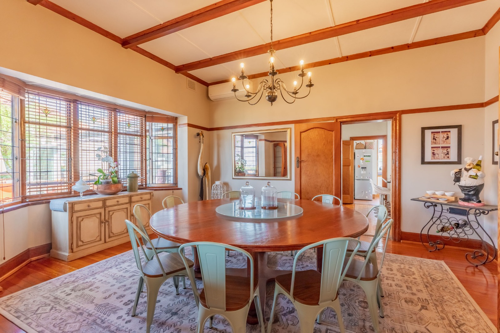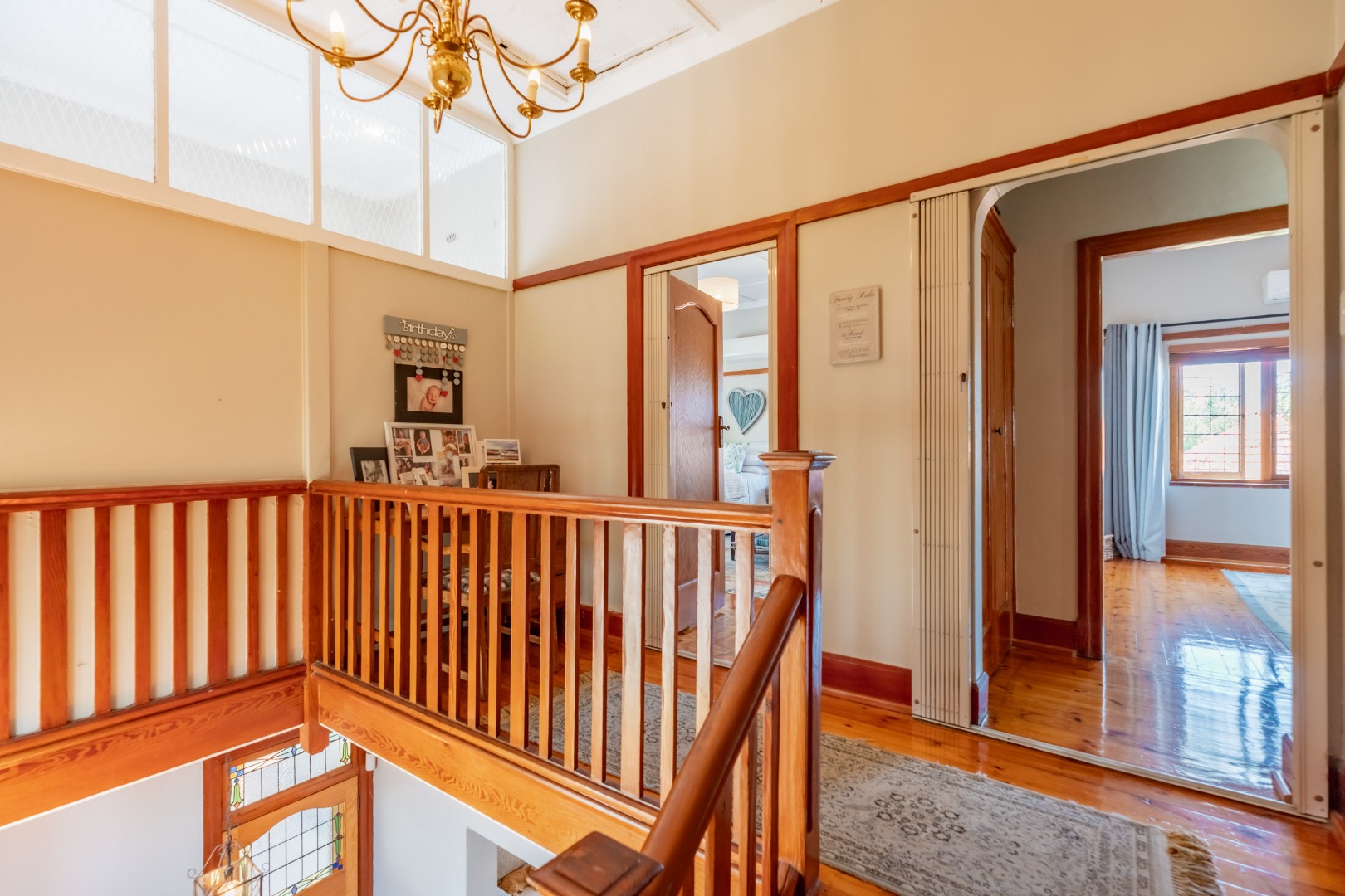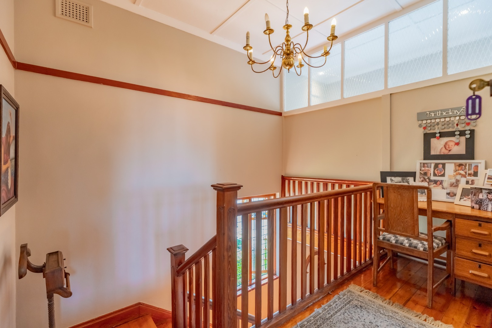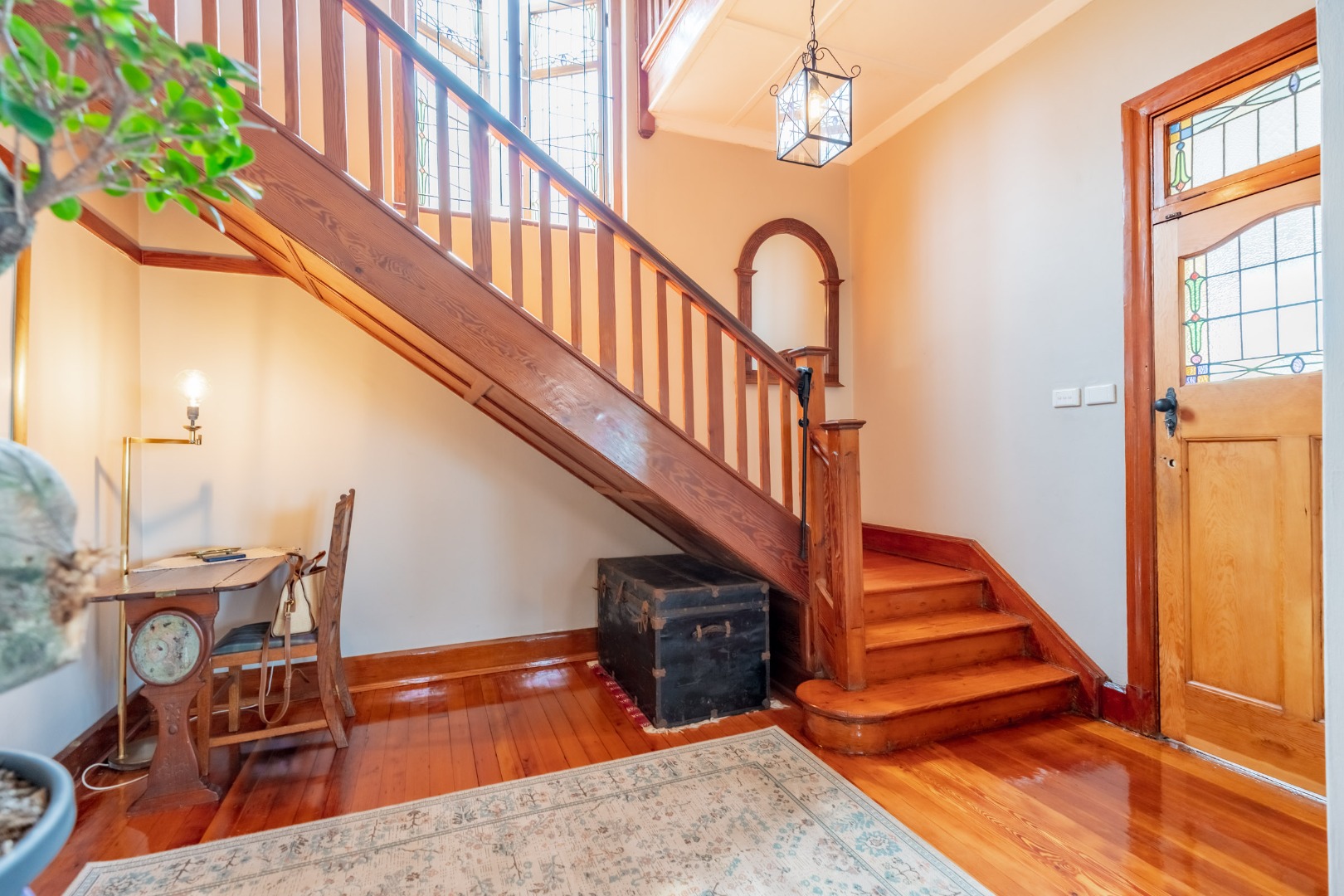 The expansive formal lounge is bathed in natural light, enhanced by exquisite stained-glass windows, and opens seamlessly into an impressive,