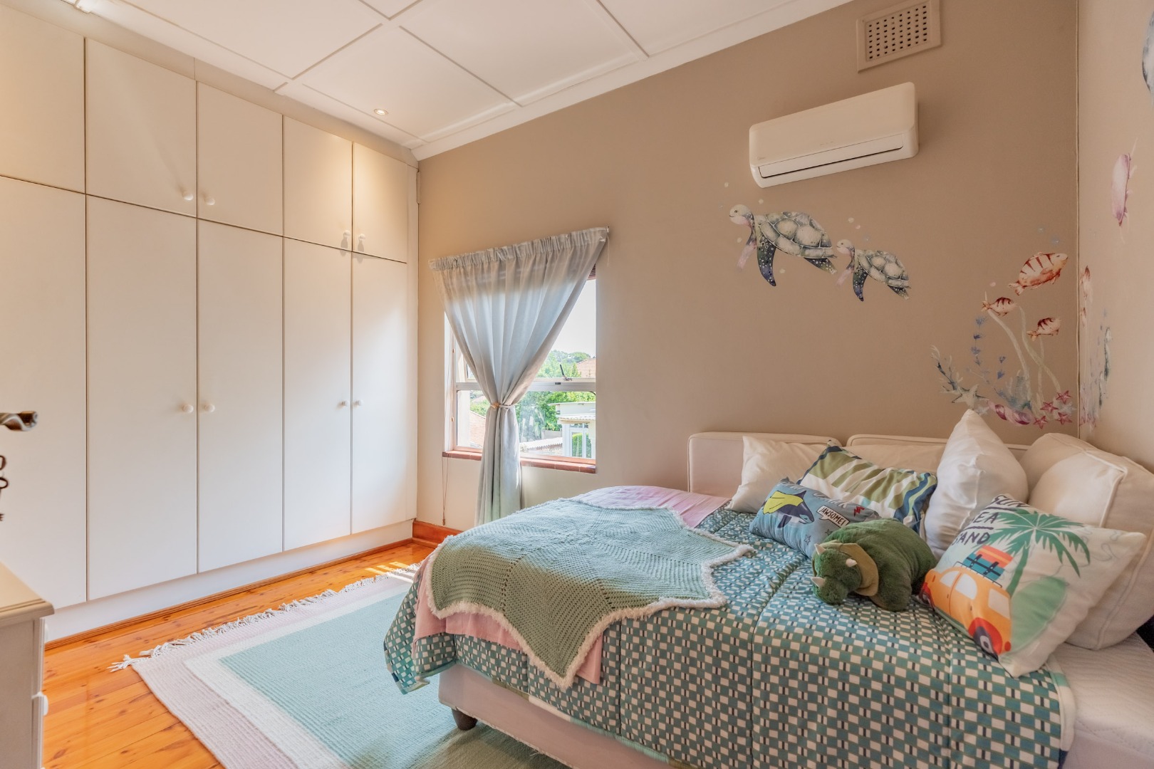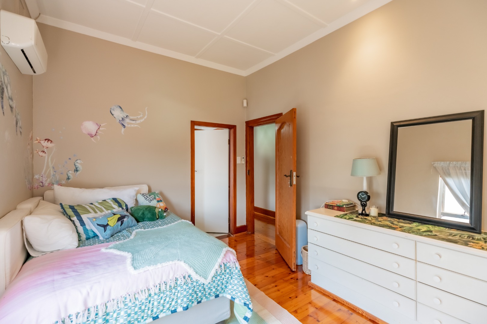 Upstairs, four generously proportioned bedrooms offer comfort and tranquillity, each filled with natural light. Two bedrooms boast en-suite bathrooms, while the remaining two bedrooms share a family bathroom. Each room has an air-conditioner.