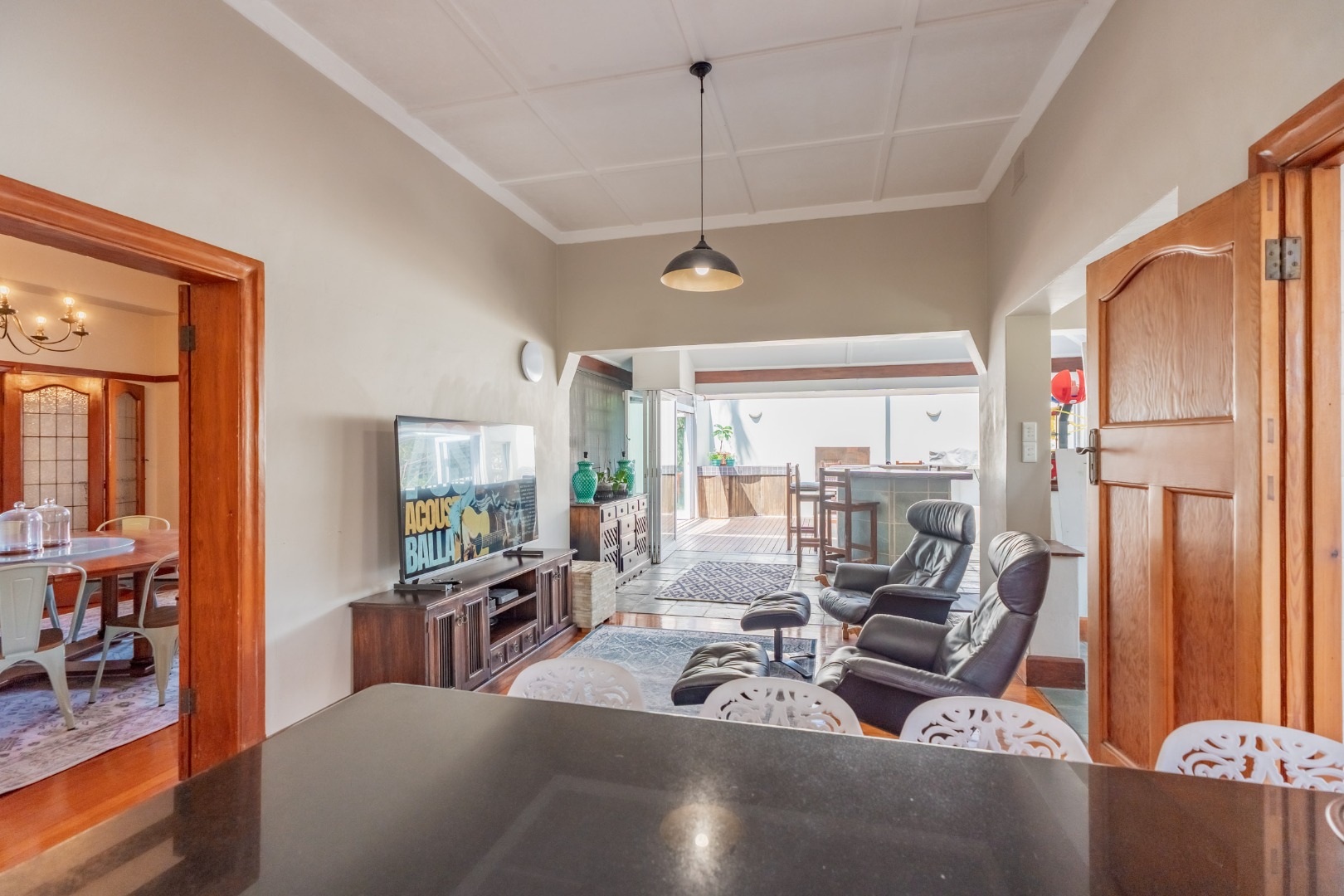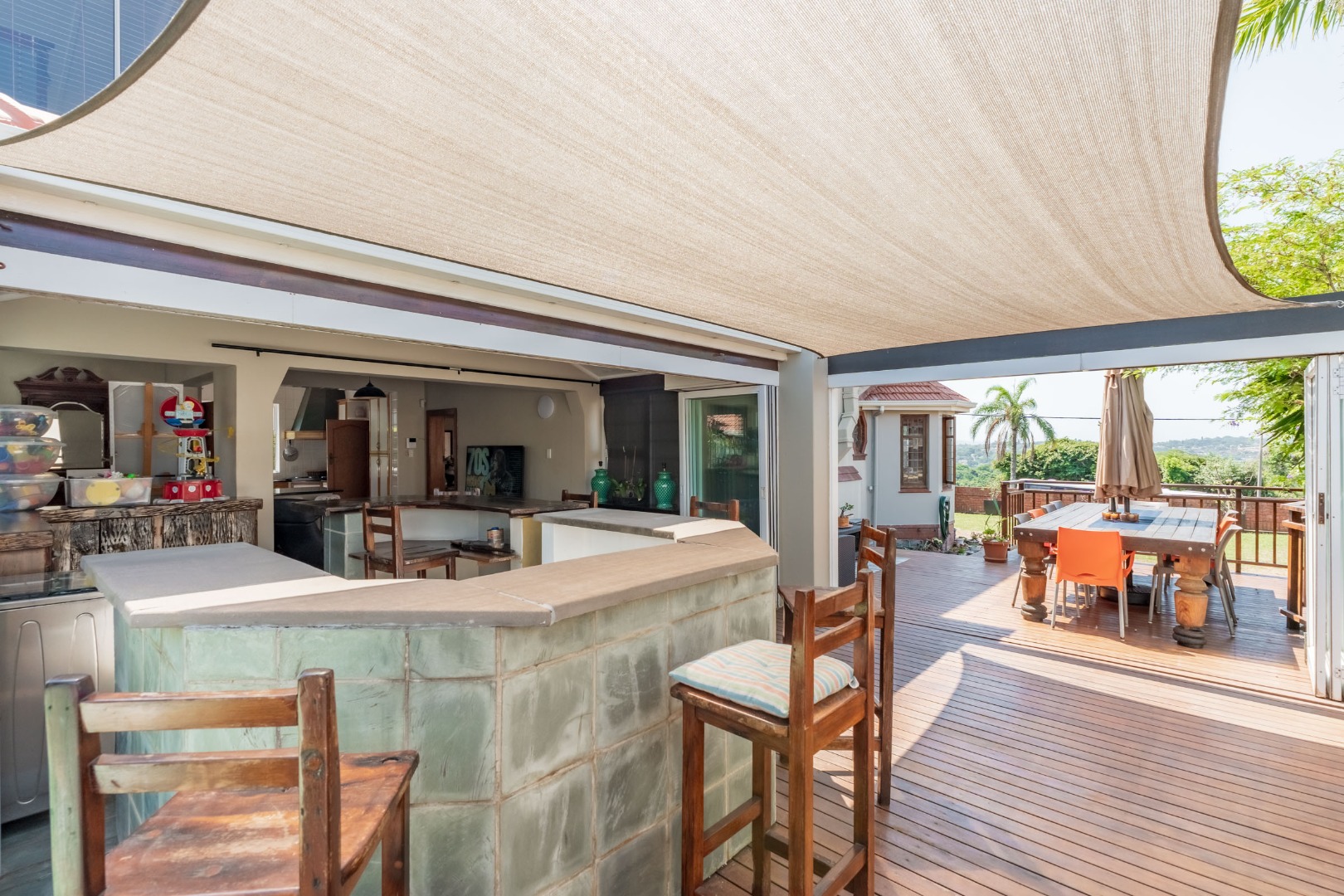 generously proportioned dining room – ideal for both intimate family dinners or grand-scale entertaining. The well-appointed kitchen is thoughtfully designed with abundant cupboard space and extensive countertops, catering perfectly to the needs of the modern family. A separate scullery, plumbed for both washing machine and dishwasher, ensures practicality without compromising on style. The TV lounge extends effortlessly to the magnificent outdoor entertainment area – an entertainers dream! Here, a substantial circular bar and a built in braai take centre stage, overlooking a sparkling pool and lush garden setting. This exceptional space has been designed for relaxed gatherings, memorable celebrations and year-round enjoyment. A conveniently located guest toilet completes the lower level.