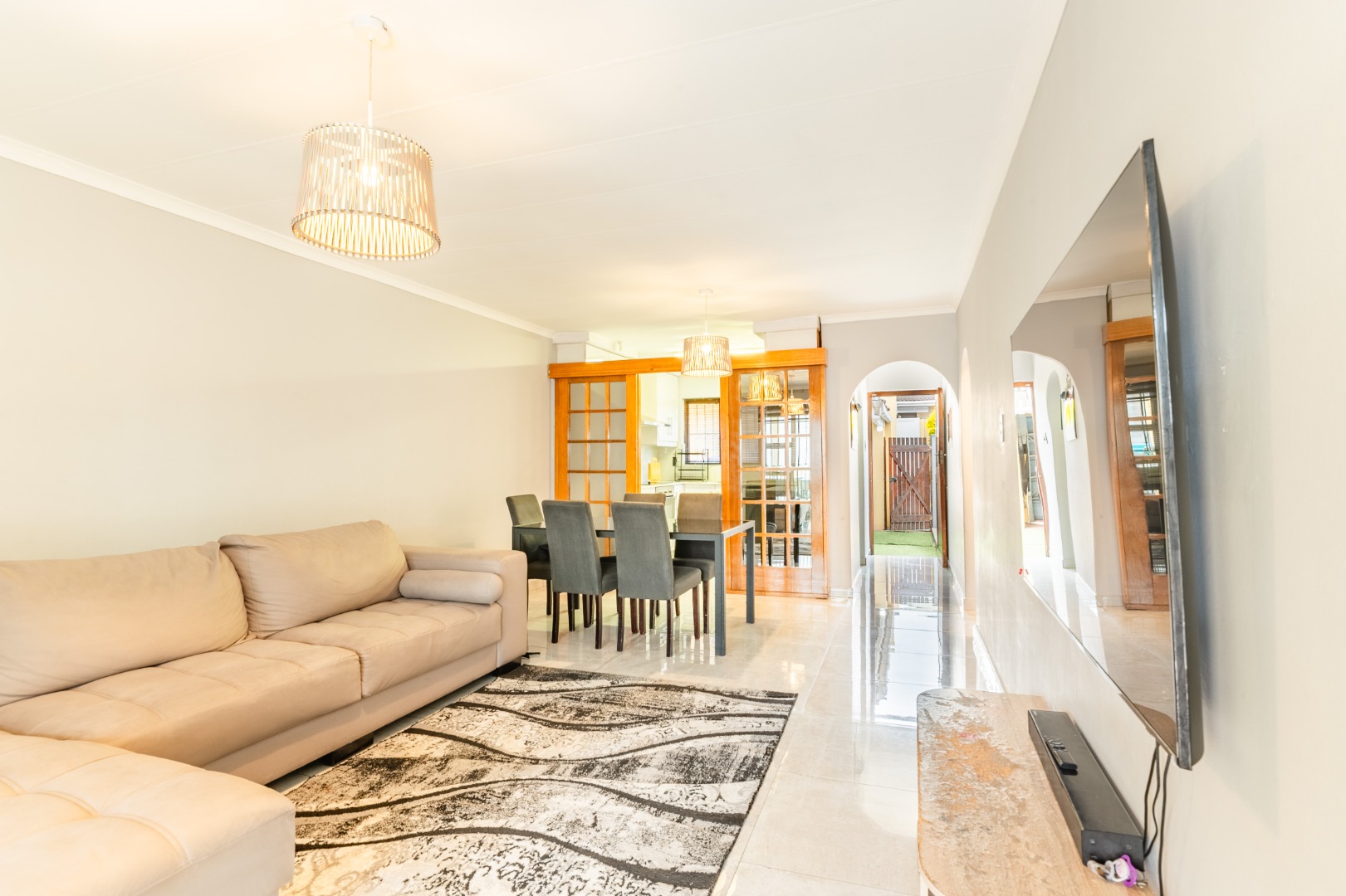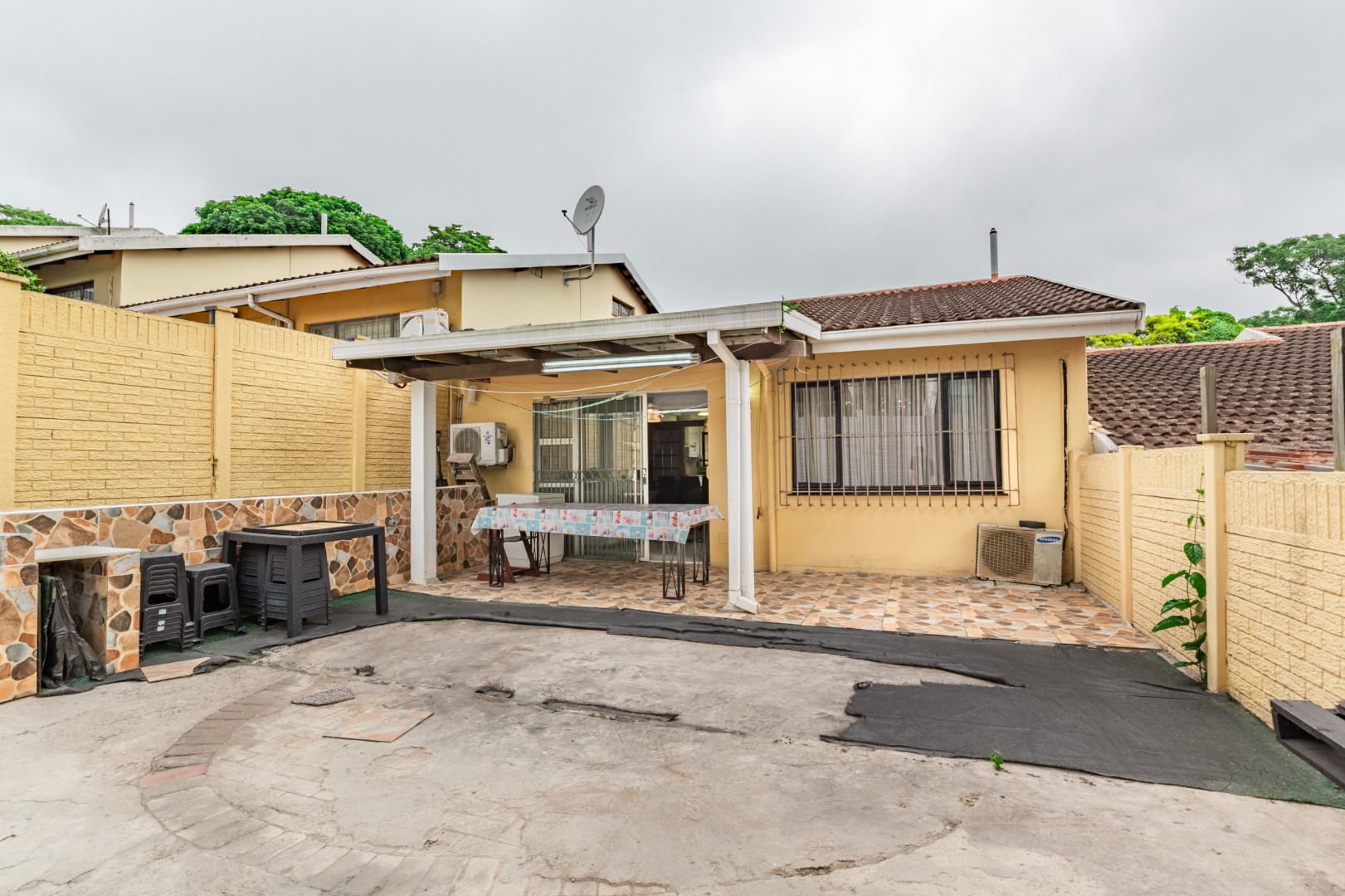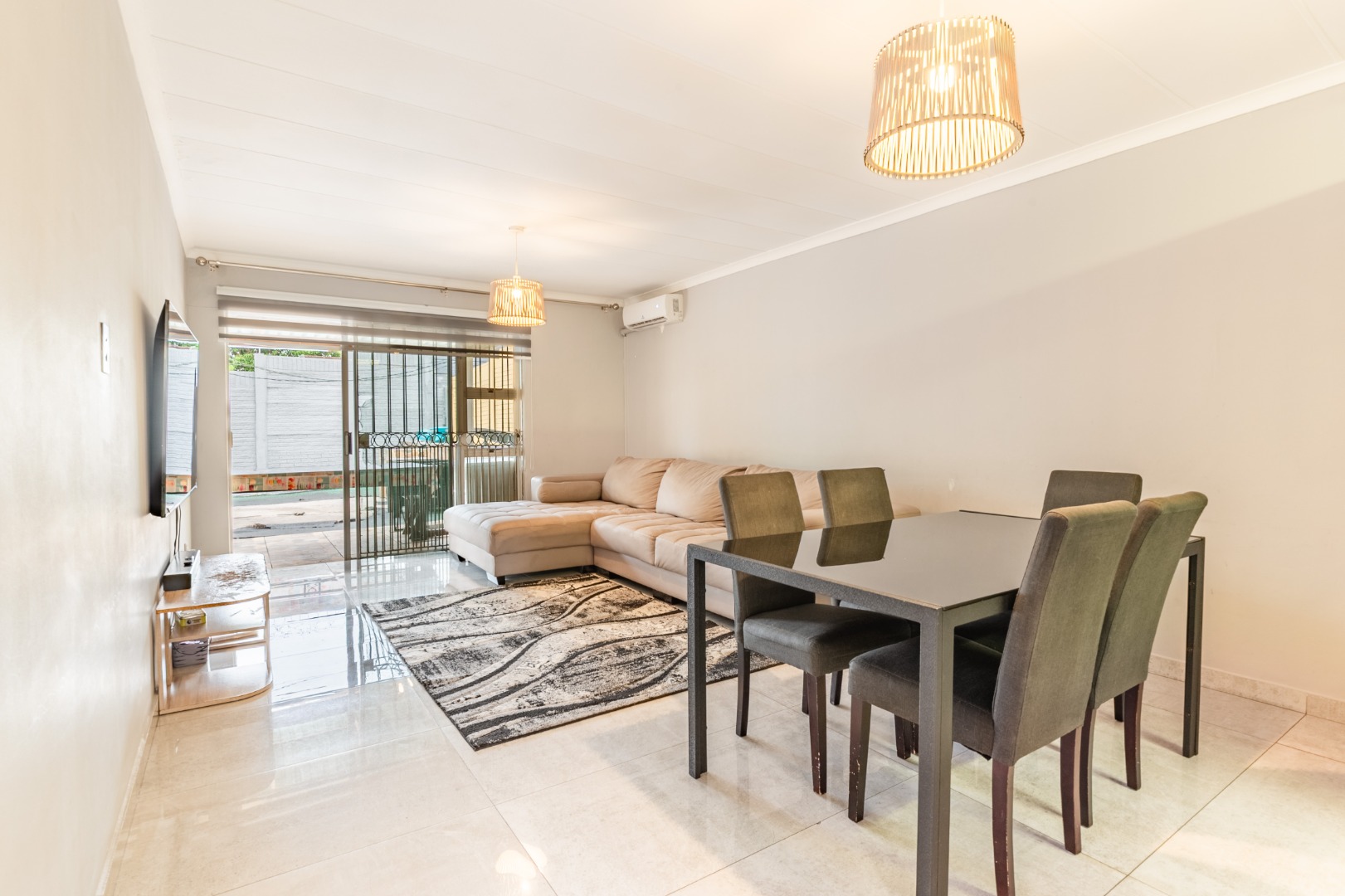 The open living space from kitchen -dining - lounge leads onto the a private courtyard with a covered patio, ideal for outdoor braais/ entertaining or for kids to play.