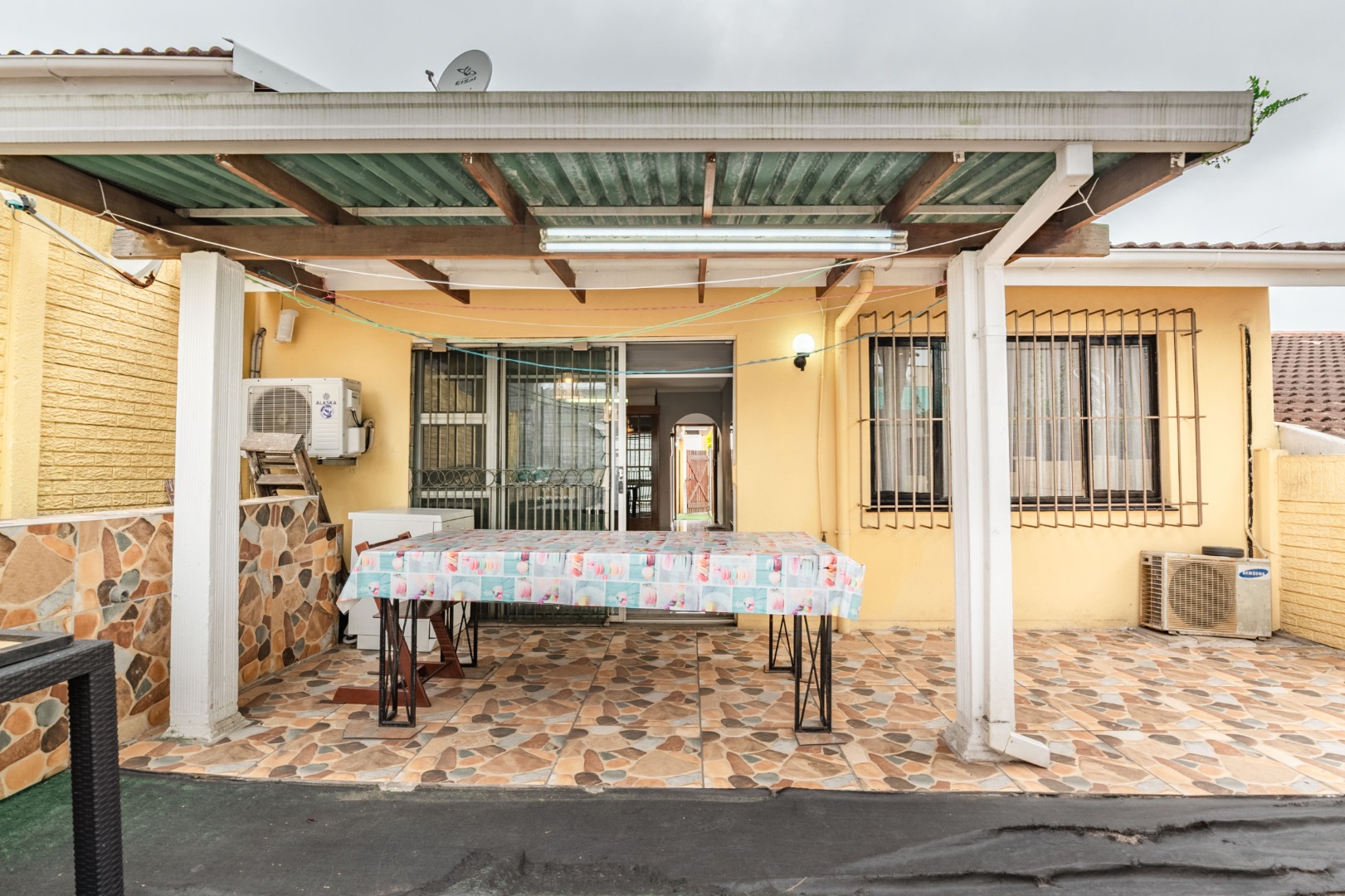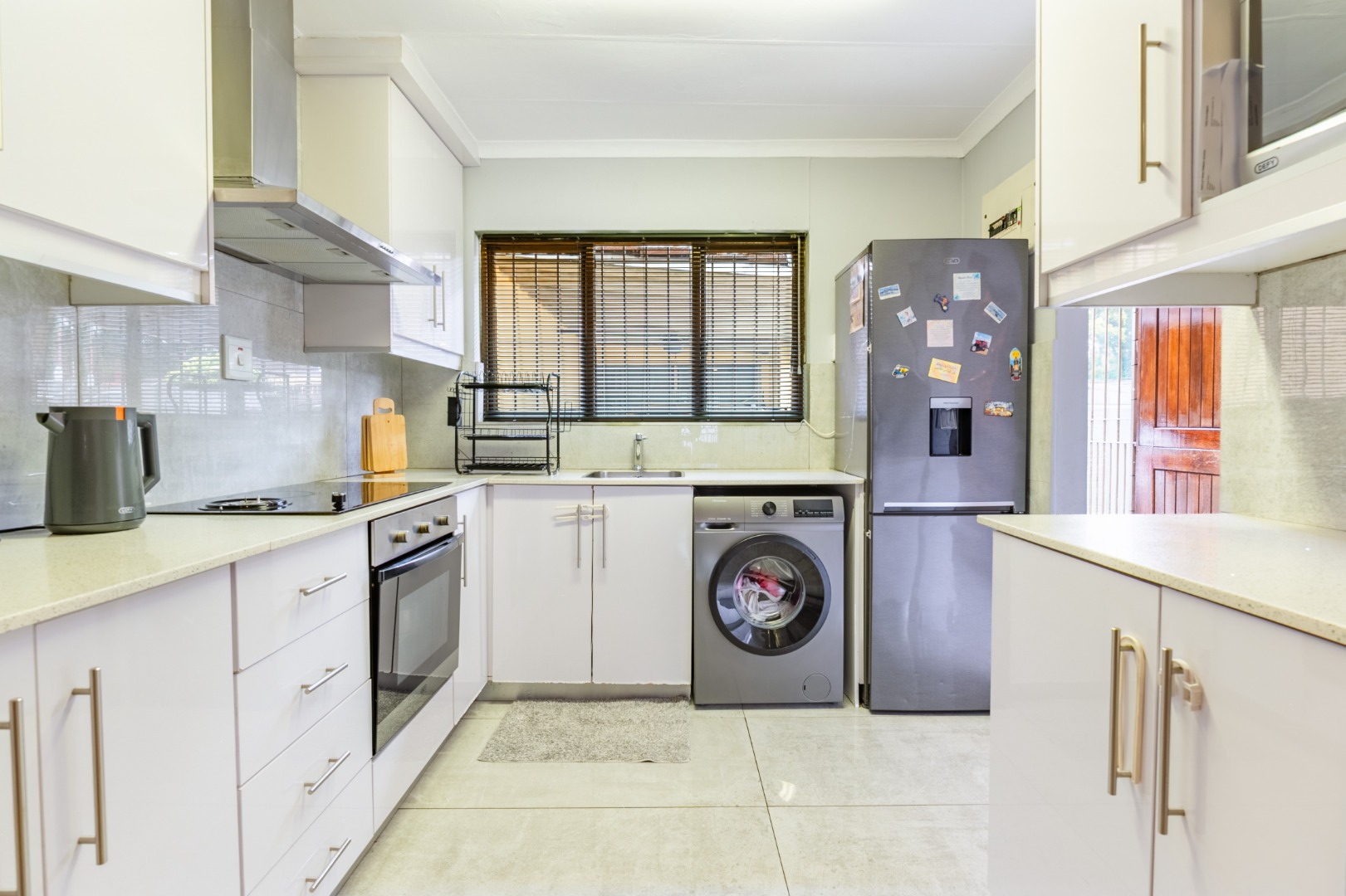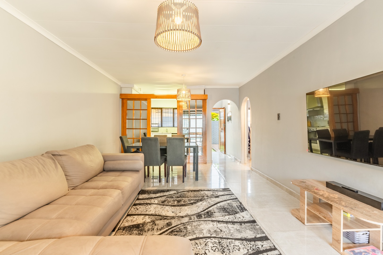 The open living space from kitchen -dining - lounge leads onto the a private courtyard with a covered patio, ideal for outdoor braais/ entertaining or for kids to play.