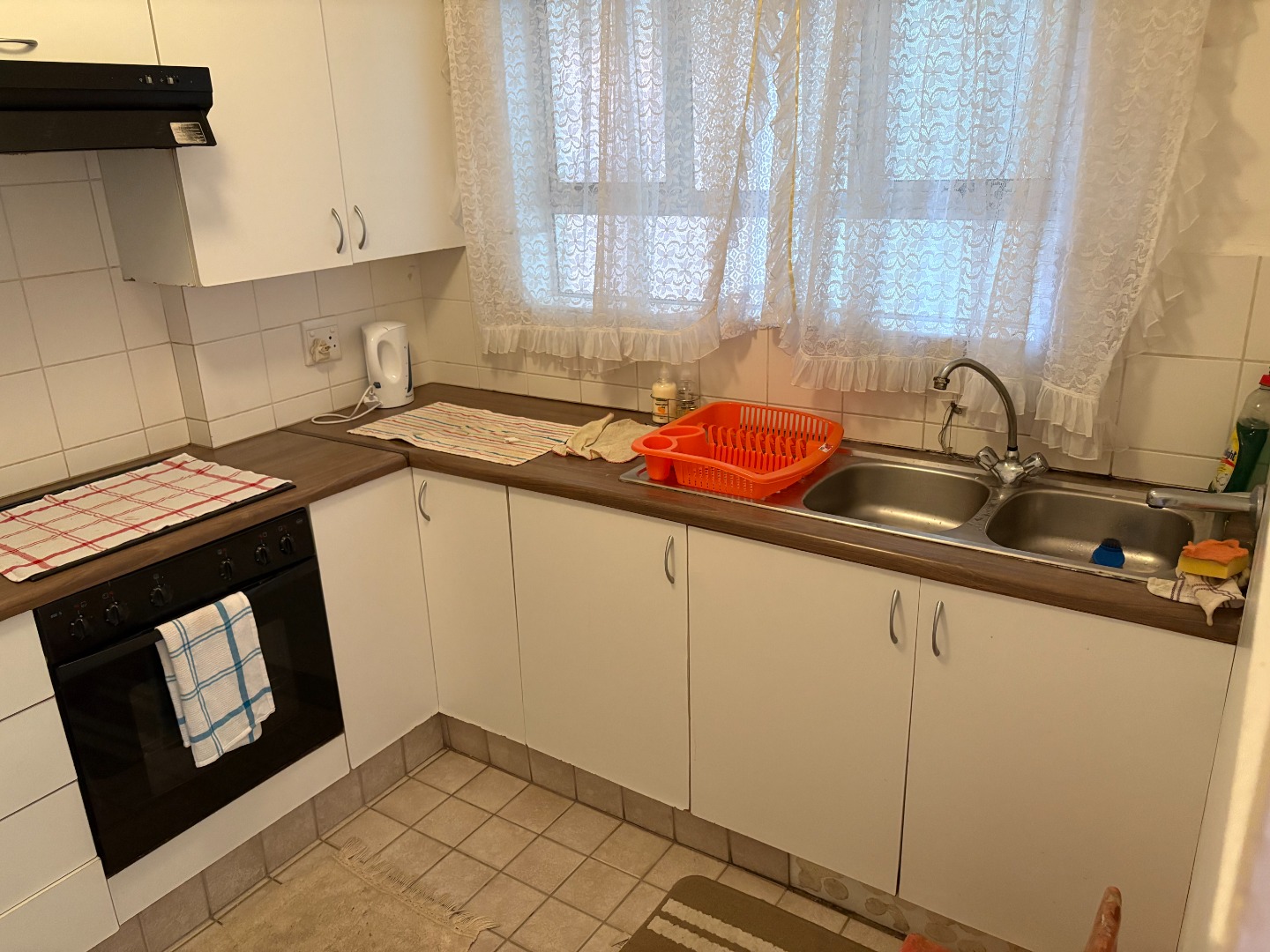 Large bedroom with built in cupboards, fitted kitchen with under counter oven, hob and extractor, bathroom with shower and separate recess dining area.