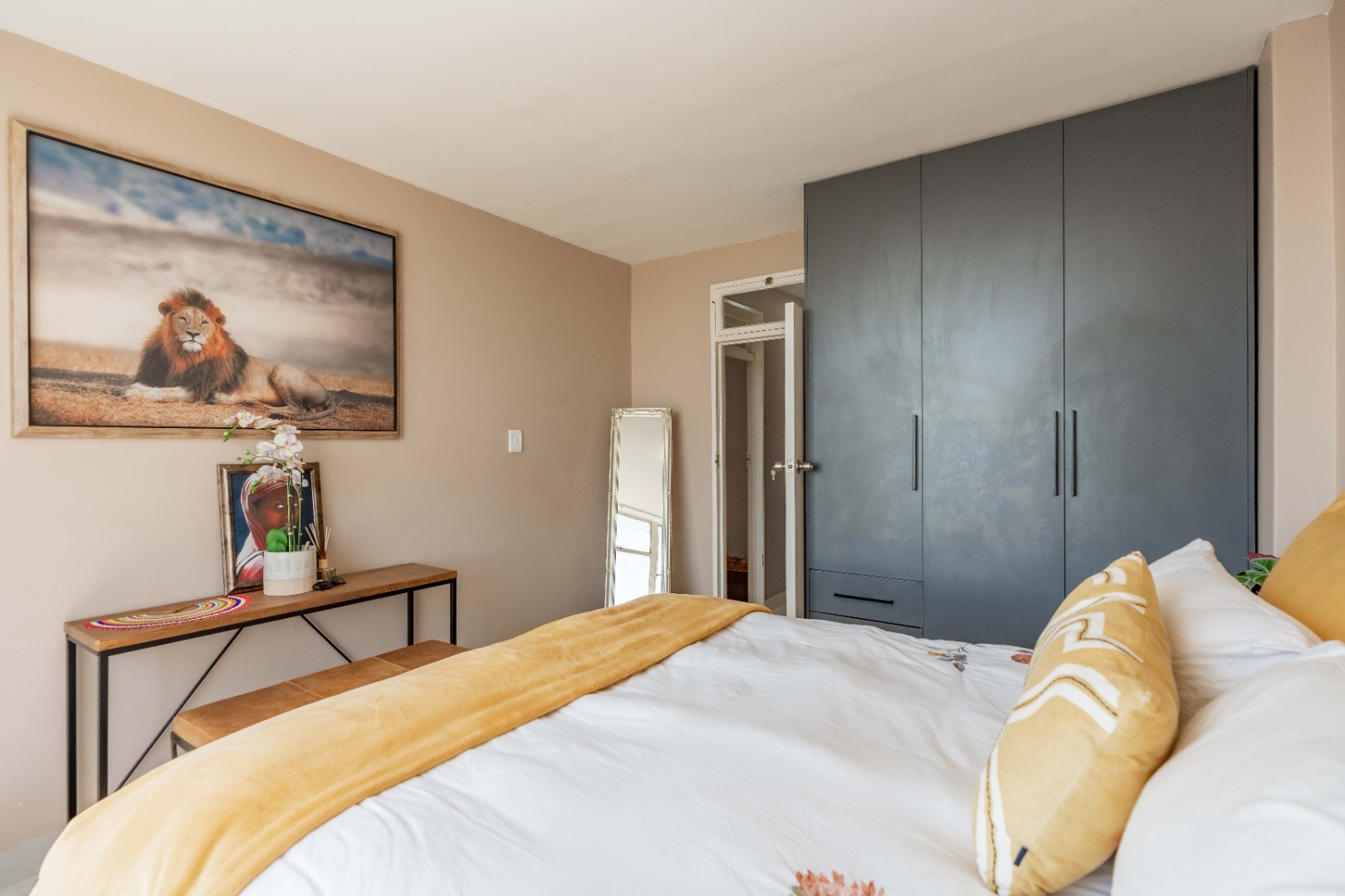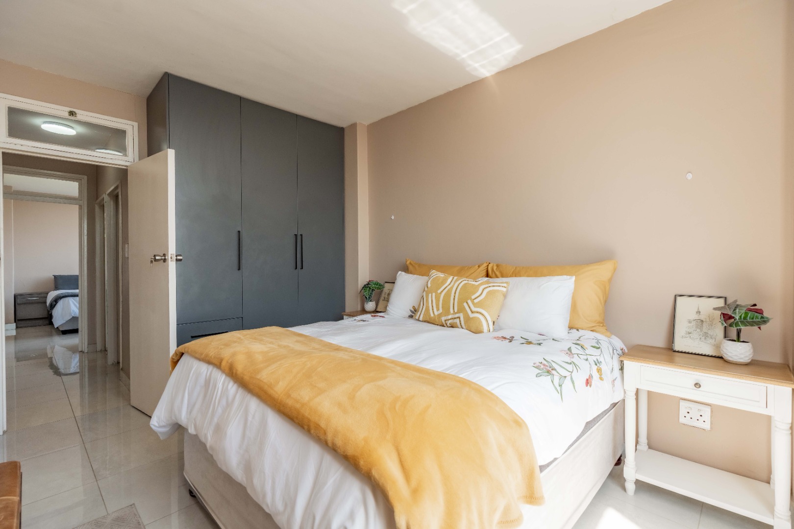 Spacious main and second bedrooms, both with built-in cupboards