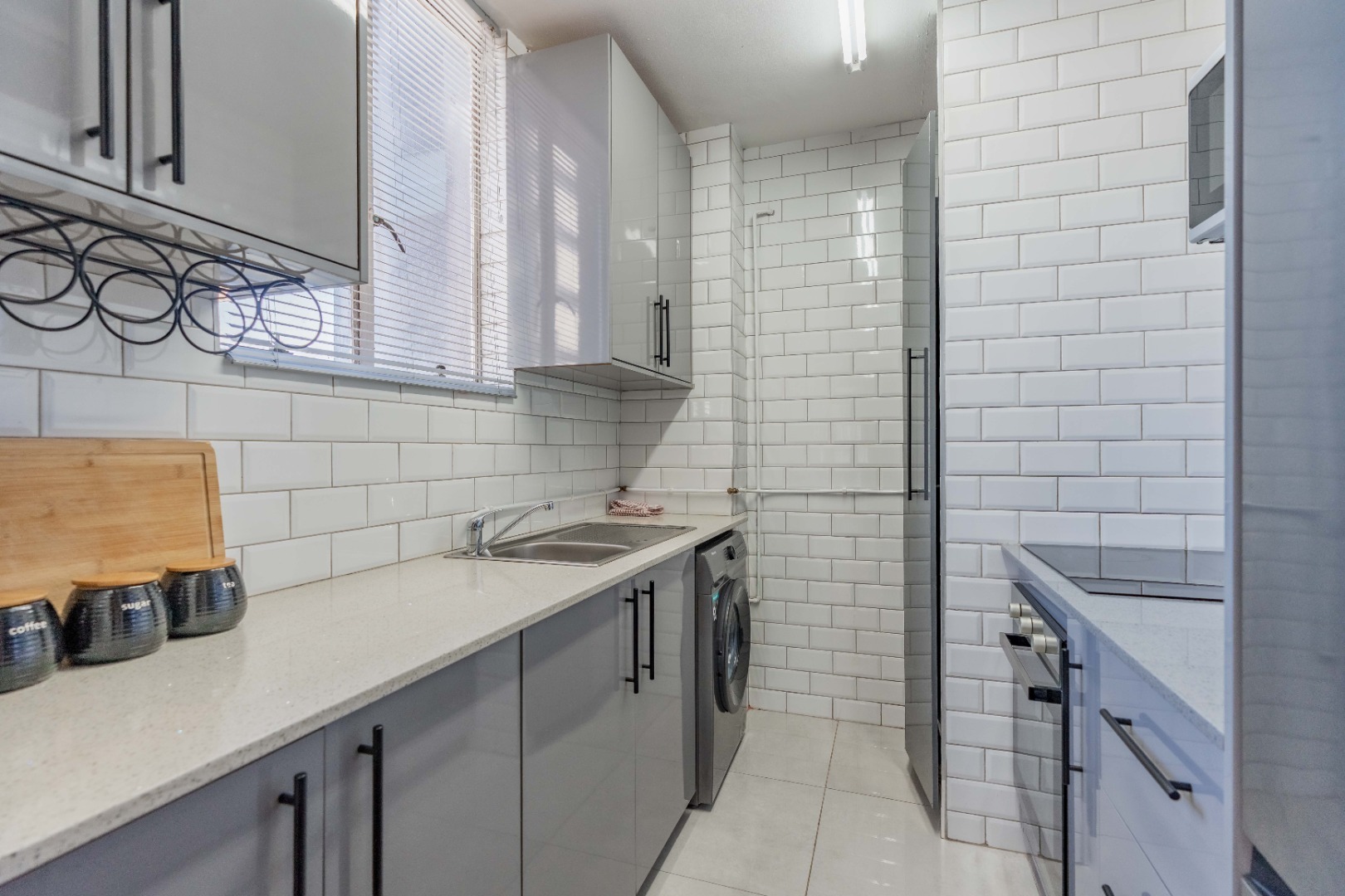 Contemporary kitchen with built-in stove, oven, and space for a washing machine
