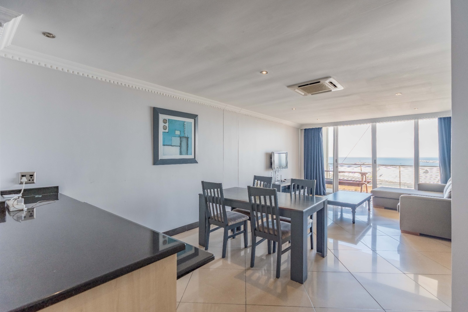 Enjoy the expansive outdoor balcony, a true highlight, offering panoramic ocean and canal views, alongside vistas of the surrounding coastal development and distant hills. This private outdoor space is perfect for enjoying Durban's sunny weather. The property also includes one dedicated parking bay, adding to the convenience of this complex living environment.