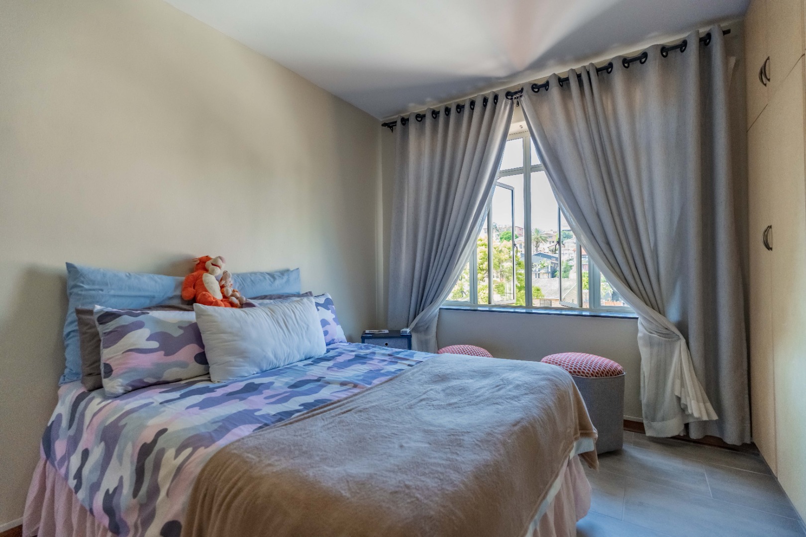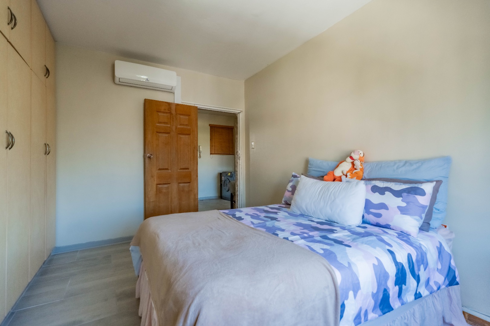 The large bedroom features brand new built-in cupboards and air conditioning for year-round comfort. A neat, modern bathroom boasts a large