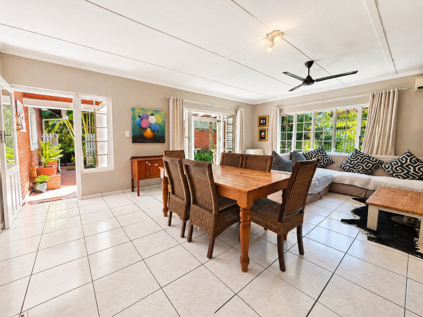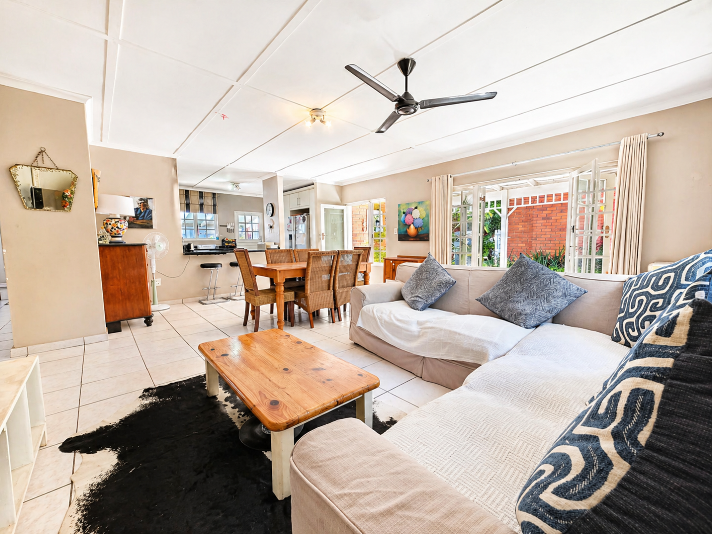 Light-filled open-plan living areas flow seamlessly from lounge to dining and into the kitchen, creating a cohesive, easy-living space. French doors extend the living area outdoors onto a covered patio and level, manicured garden — private, usable, and ideal for everyday living and relaxed entertaining.