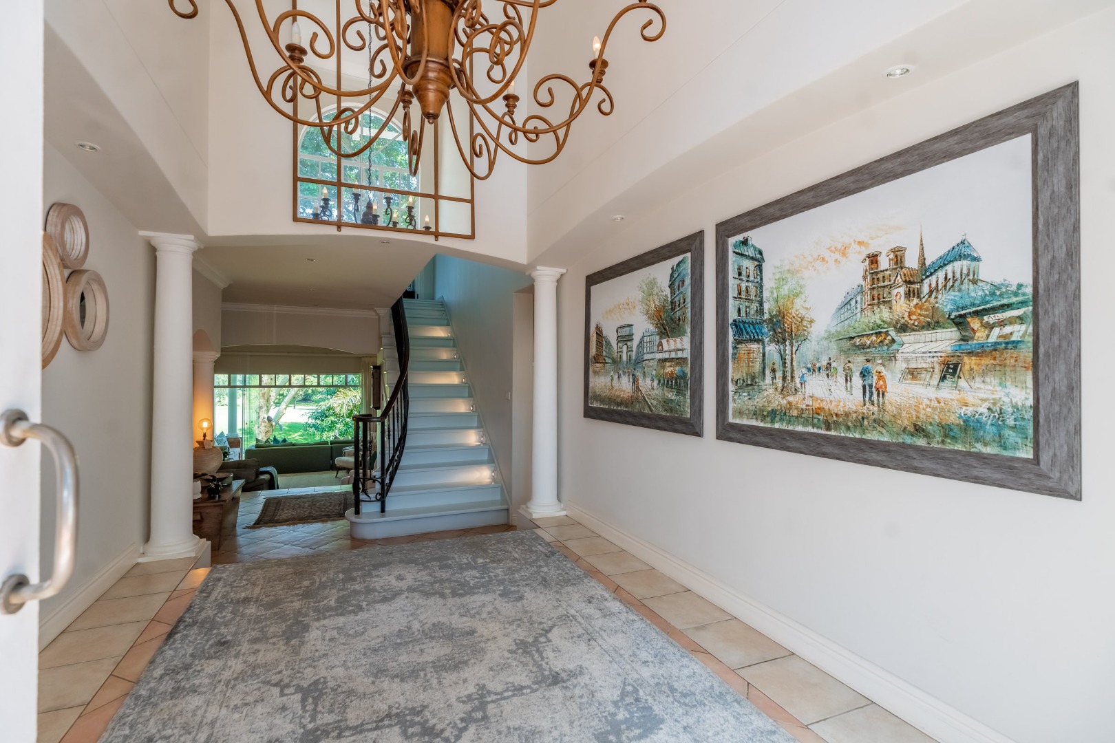 A dramatic double volume entrance hall unfolds beneath a sweeping curved staircase, softly illuminated and undeniably impressive. The