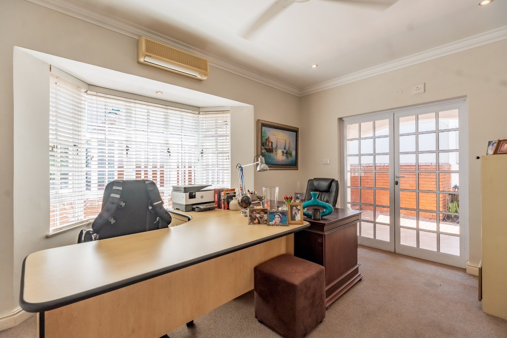 Downstairs offers two spacious bedrooms, a full family bathroom, a guest cloakroom, a private study, a laundry and ample storage. Air