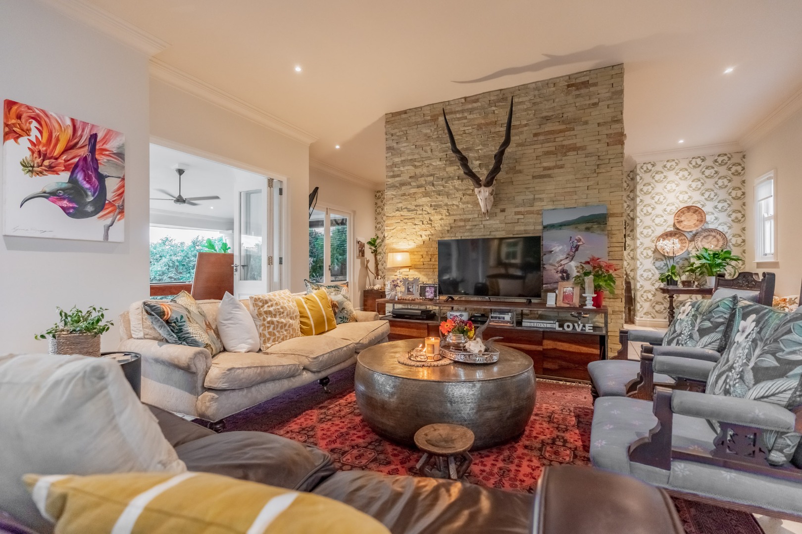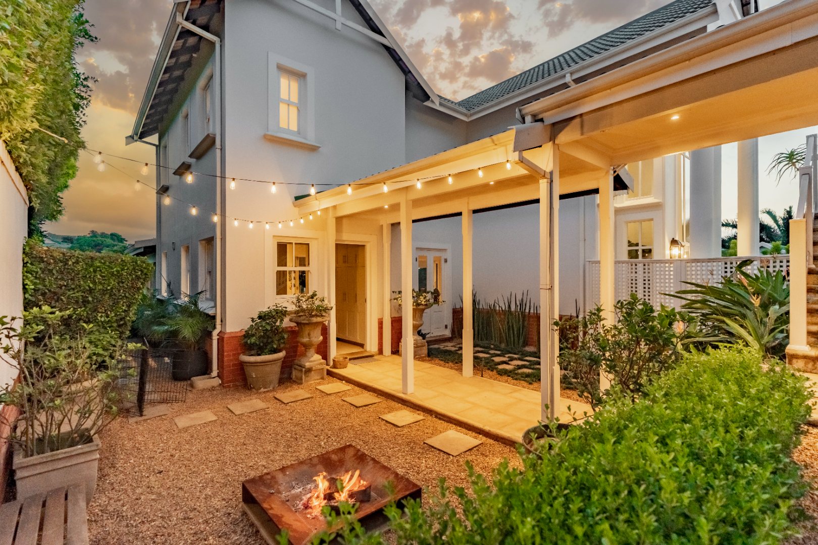 Off the front of the home, a separate entertainment space offers a more intimate atmosphere. A beautifully stoned firepit area with soft sparkling lights creates the perfect setting for evening gatherings, adding another layer to the home’s relaxed yet refined lifestyle.