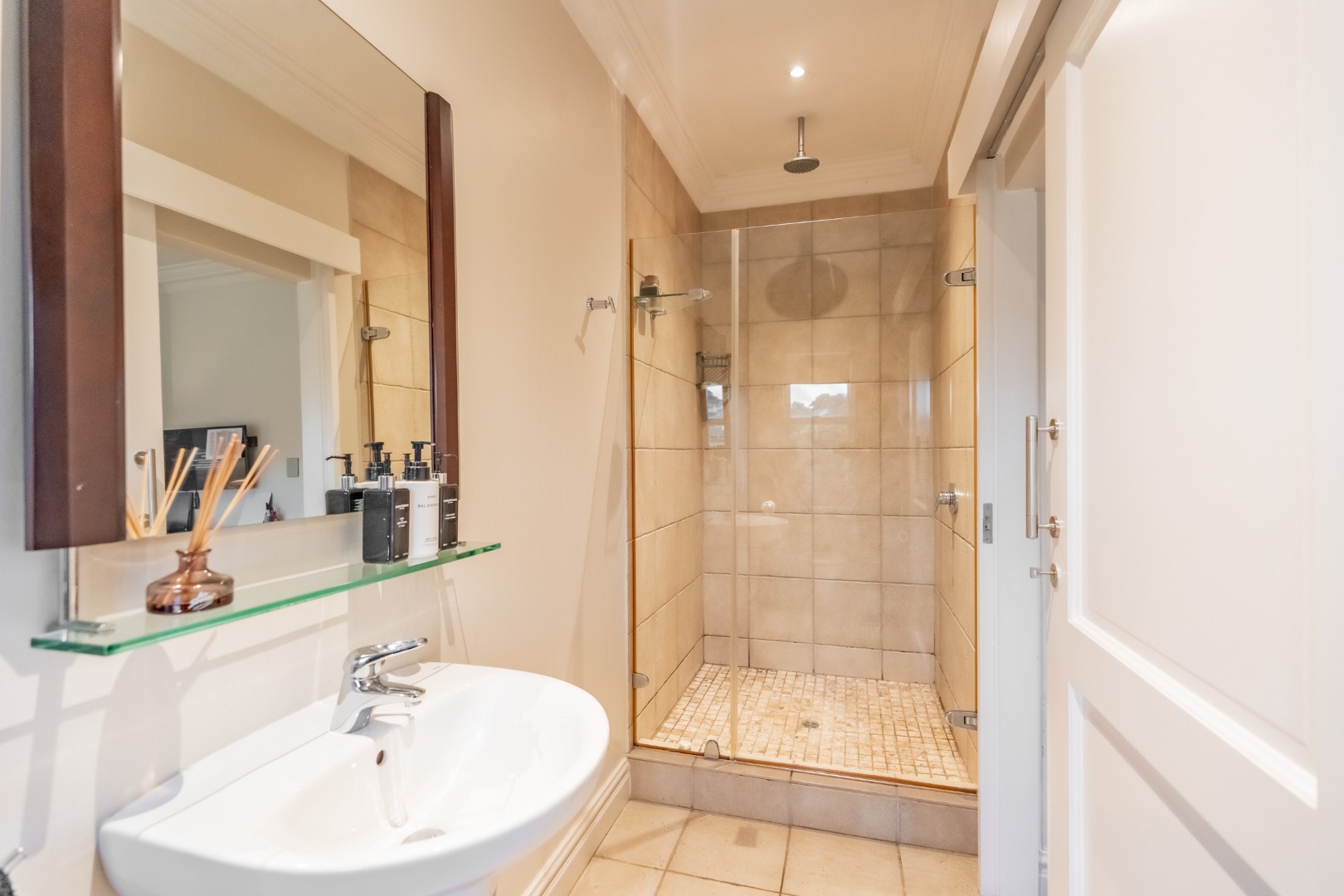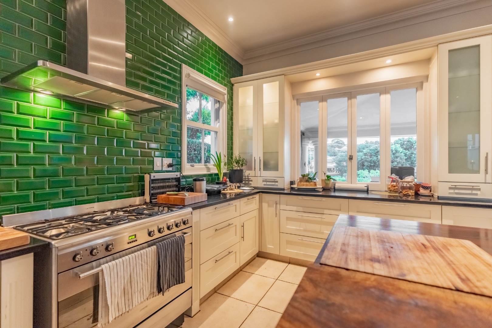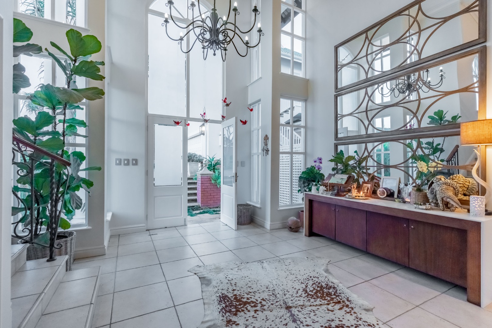 A striking double volume entrance immediately sets the tone, welcoming you into expansive open plan living and dining areas filled with natural light. Floor to ceiling windows frame the outlook while a sophisticated feature wall subtly defines the space without interrupting the open flow. The bespoke kitchen is both generous and beautifully considered, finished with Caesarstone countertops, a statement wooden island and premium appliances. A separate scullery and laundry are tucked away to maintain clean lines, while a guest loo is conveniently positioned for entertaining.