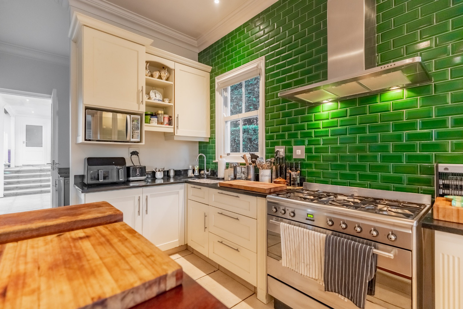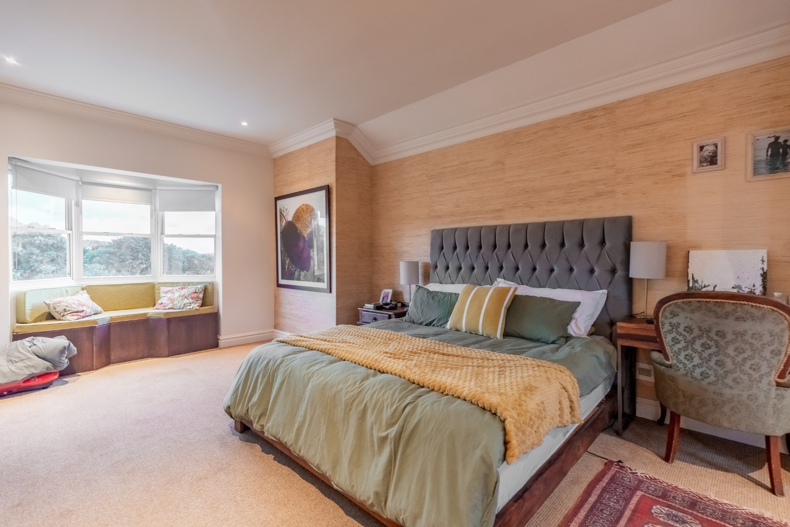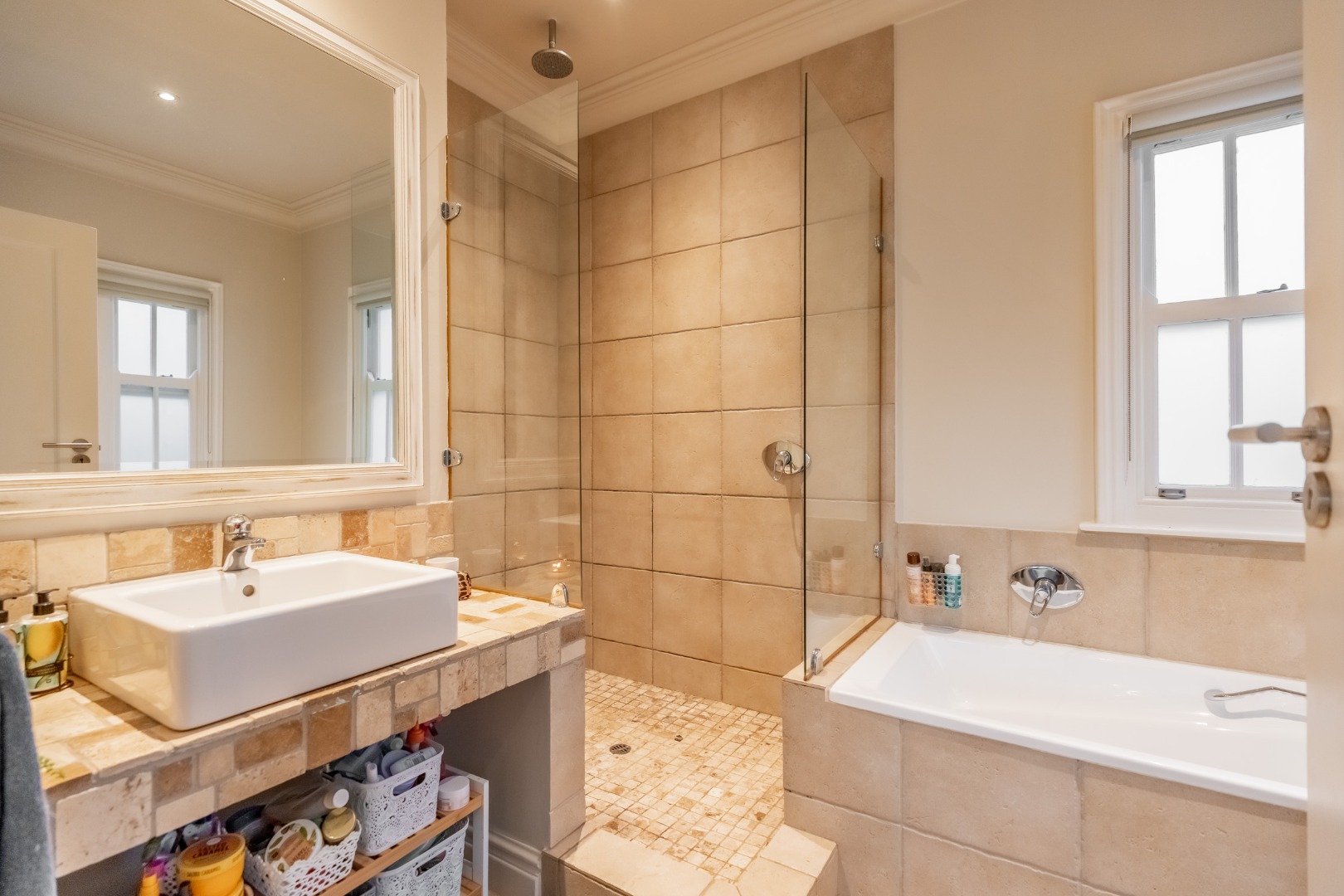 A striking double volume entrance immediately sets the tone, welcoming you into expansive open plan living and dining areas filled with natural light. Floor to ceiling windows frame the outlook while a sophisticated feature wall subtly defines the space without interrupting the open flow. The bespoke kitchen is both generous and beautifully considered, finished with Caesarstone countertops, a statement wooden island and premium appliances. A separate scullery and laundry are tucked away to maintain clean lines, while a guest loo is conveniently positioned for entertaining.