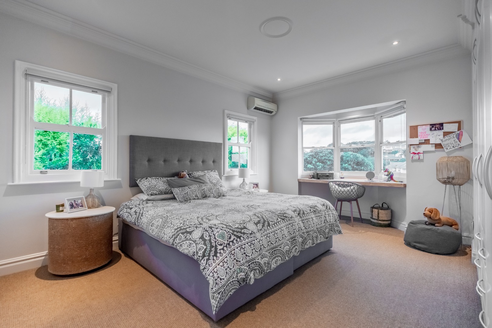 Upstairs, the accommodation comprises three spacious en suite bedrooms, each well appointed and thoughtfully positioned. The main suite is a tranquil retreat featuring a walk through dressing area, a full en suite bathroom and large windows that capture the golf course outlook and morning light.