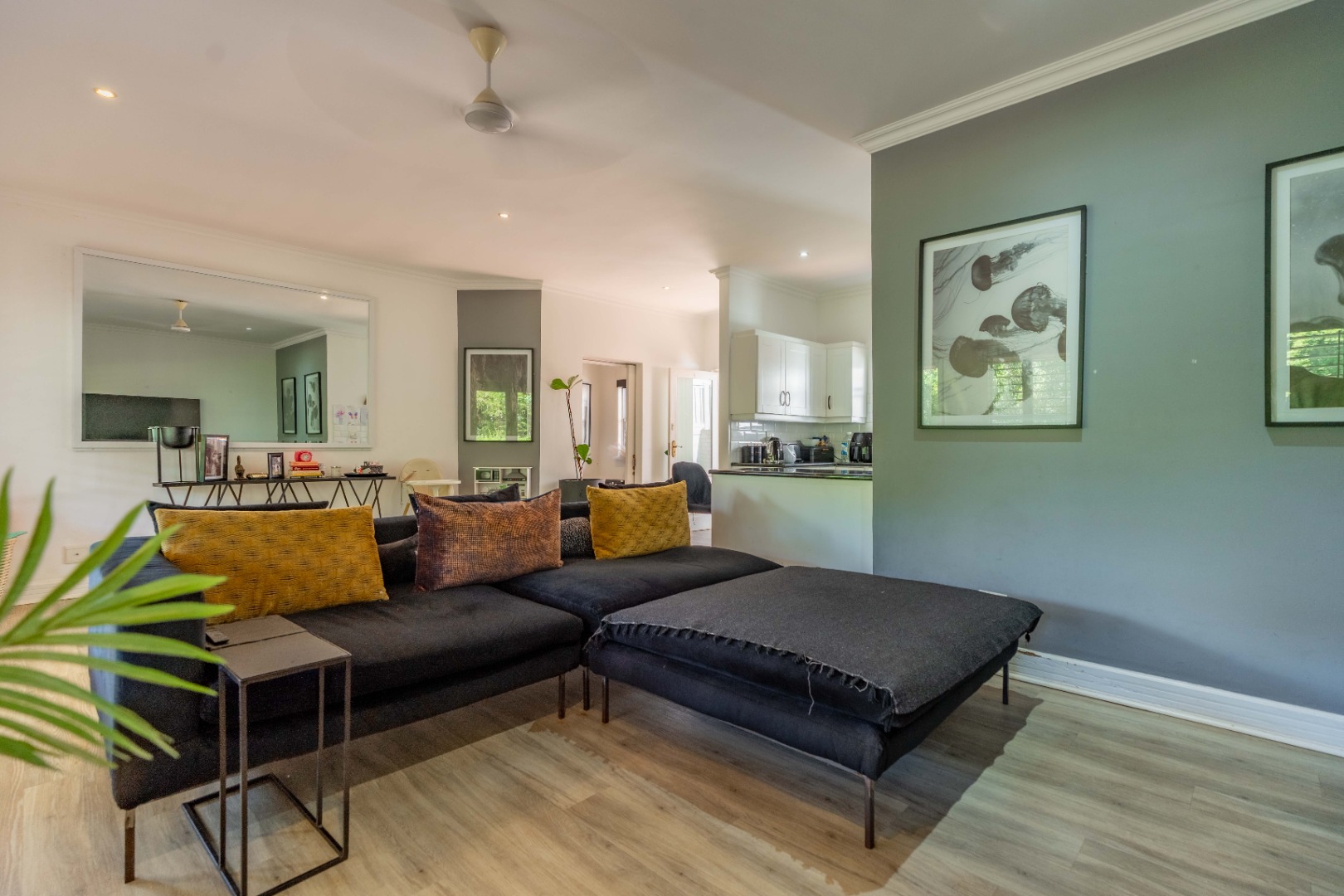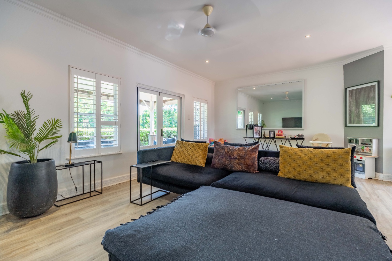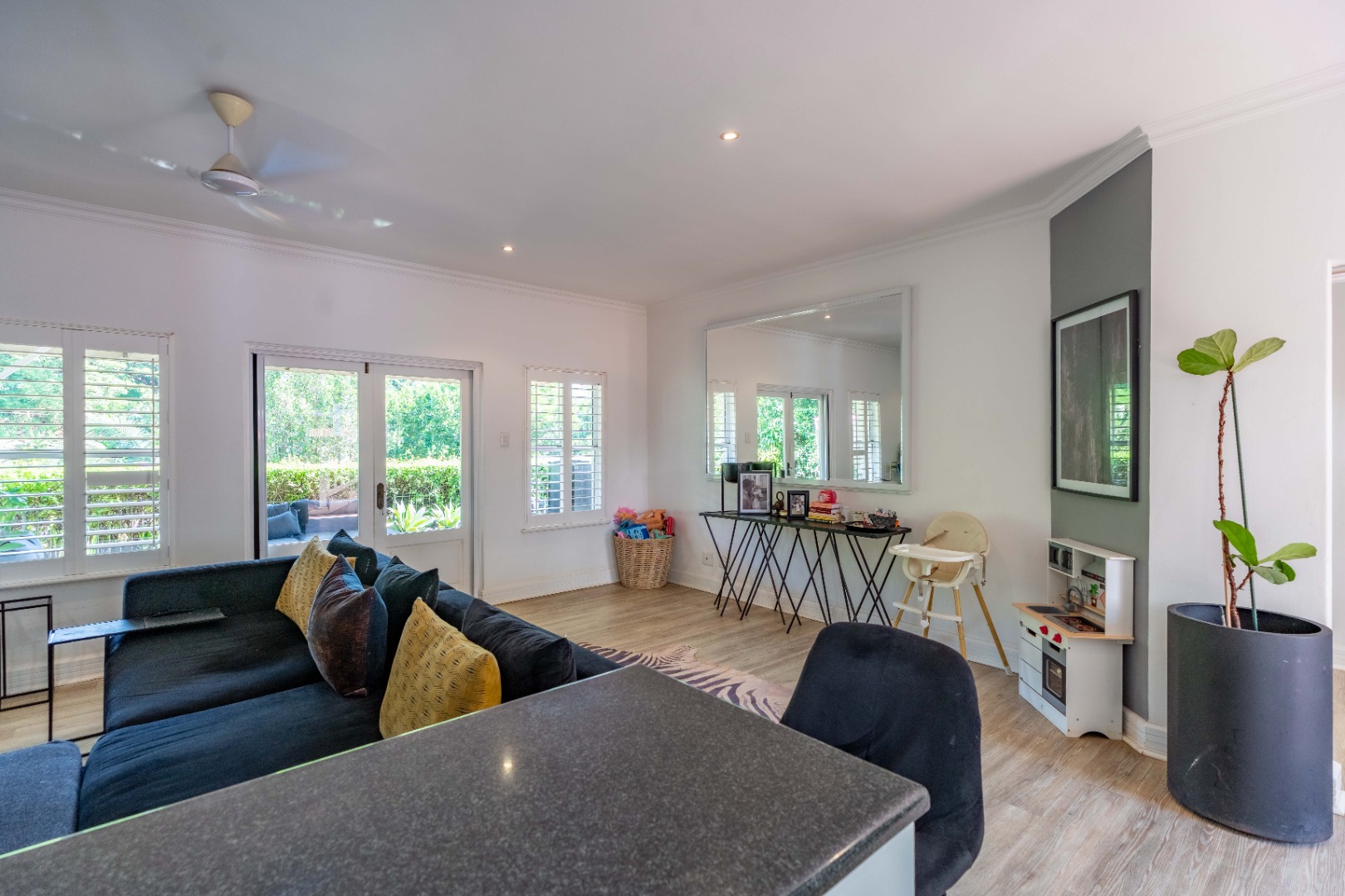 Stylish interiors begin with a spacious, light-filled open-plan lounge and dining area that flows seamlessly to a covered patio and a manicured, low-maintenance garden—an ideal setting for private entertaining or quiet outdoor enjoyment.