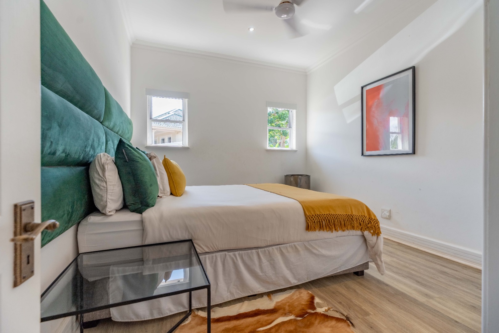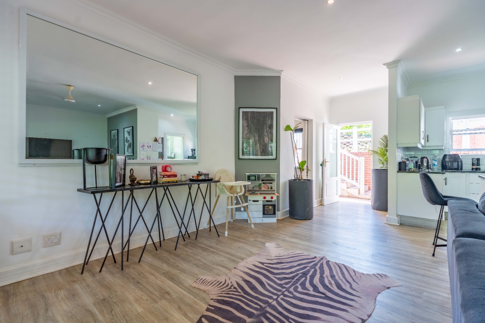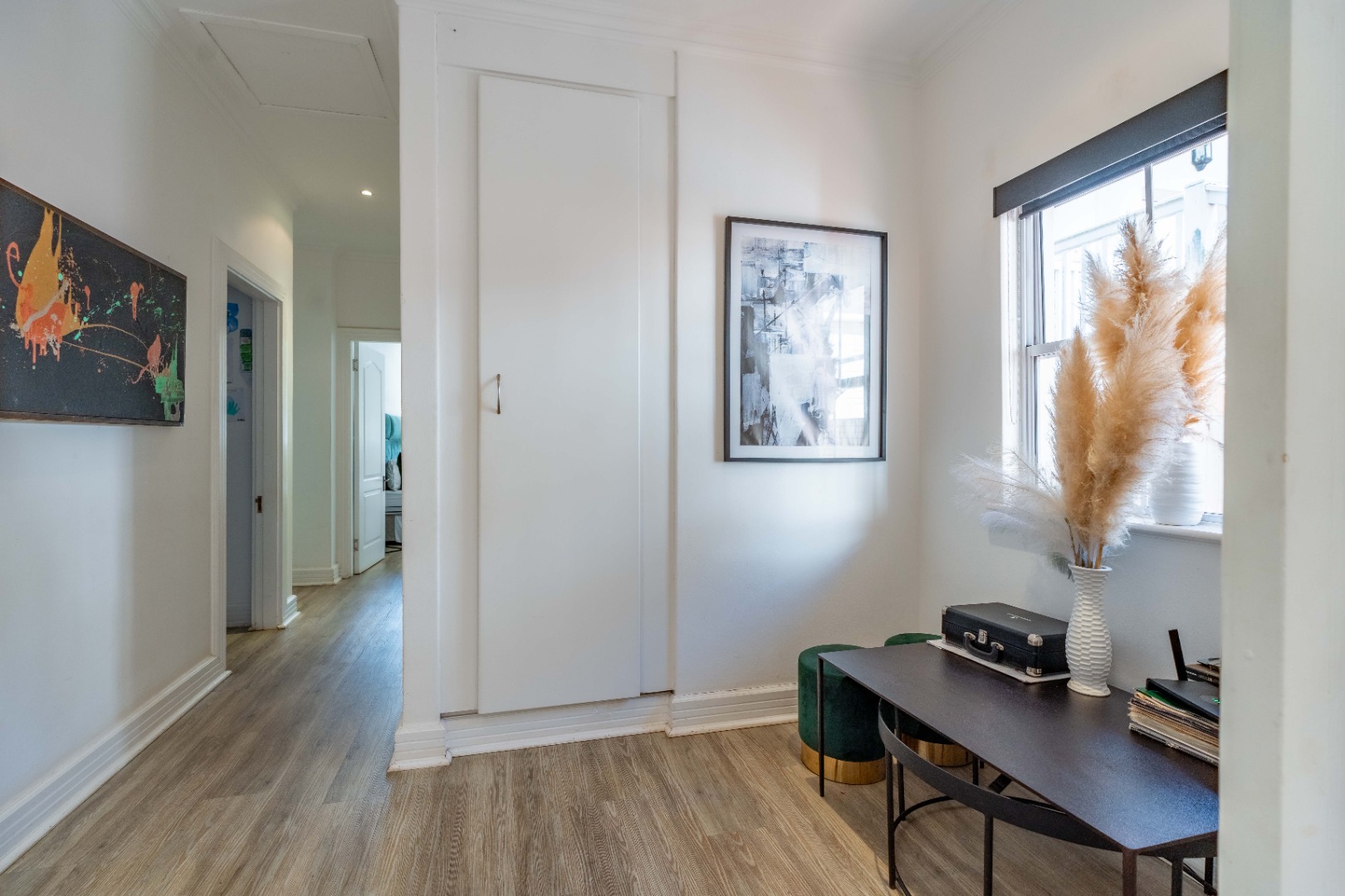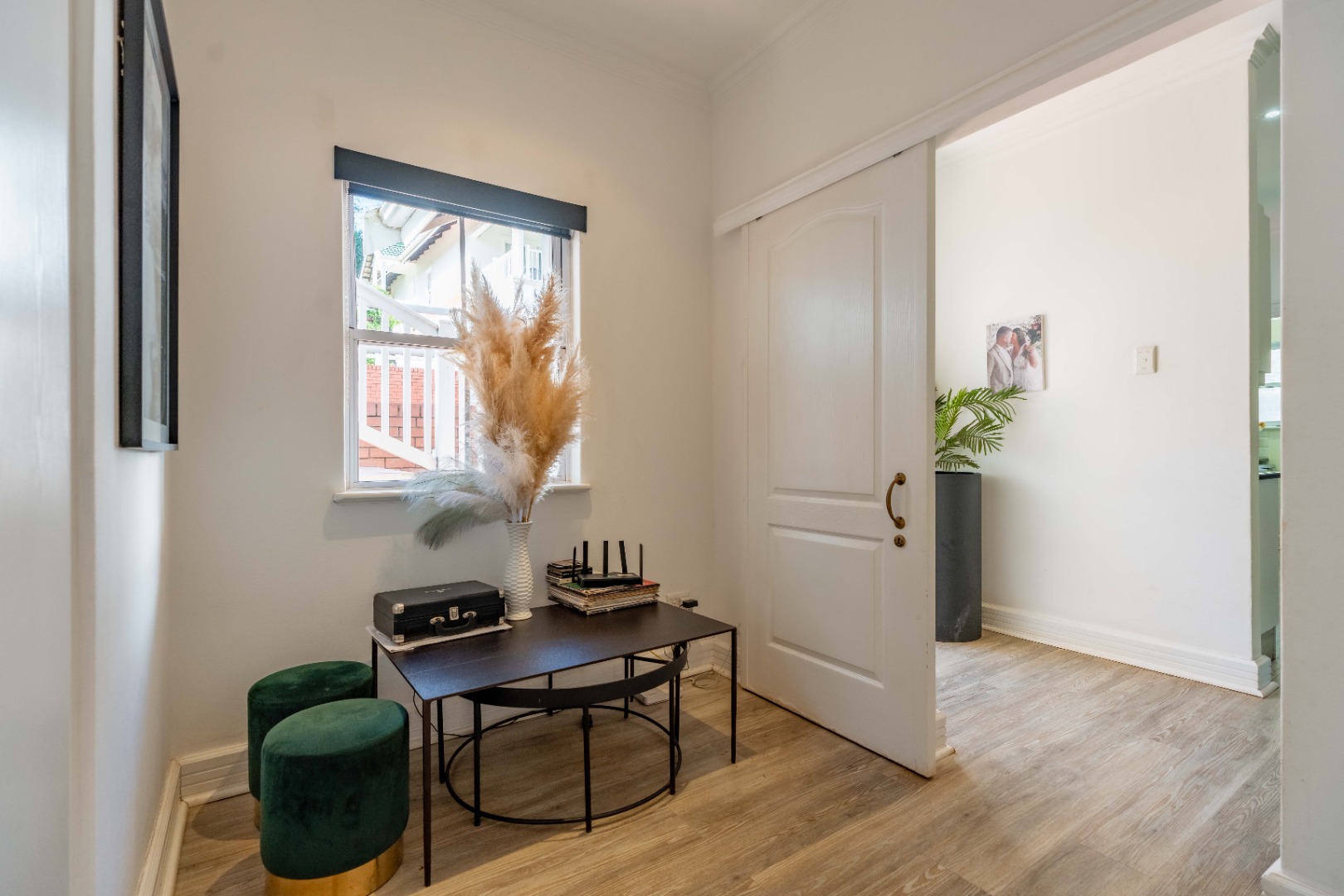A dedicated study area offers a practical workspace or quiet corner, perfectly positioned between the living zones and the bedroom wing. Three generously proportioned bedrooms offer comfort and privacy, including a refined main suite with a well-appointed en-suite bathroom. The remaining bedrooms are served by a sleek second bathroom with contemporary finishes.