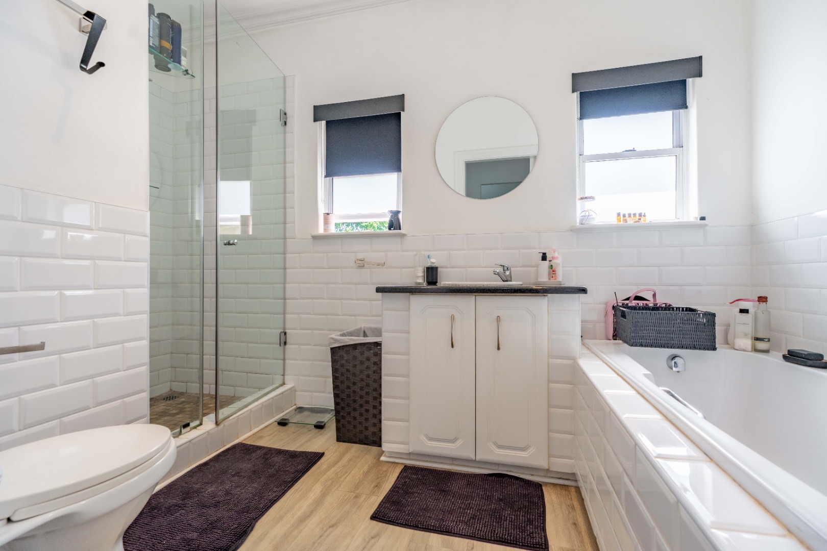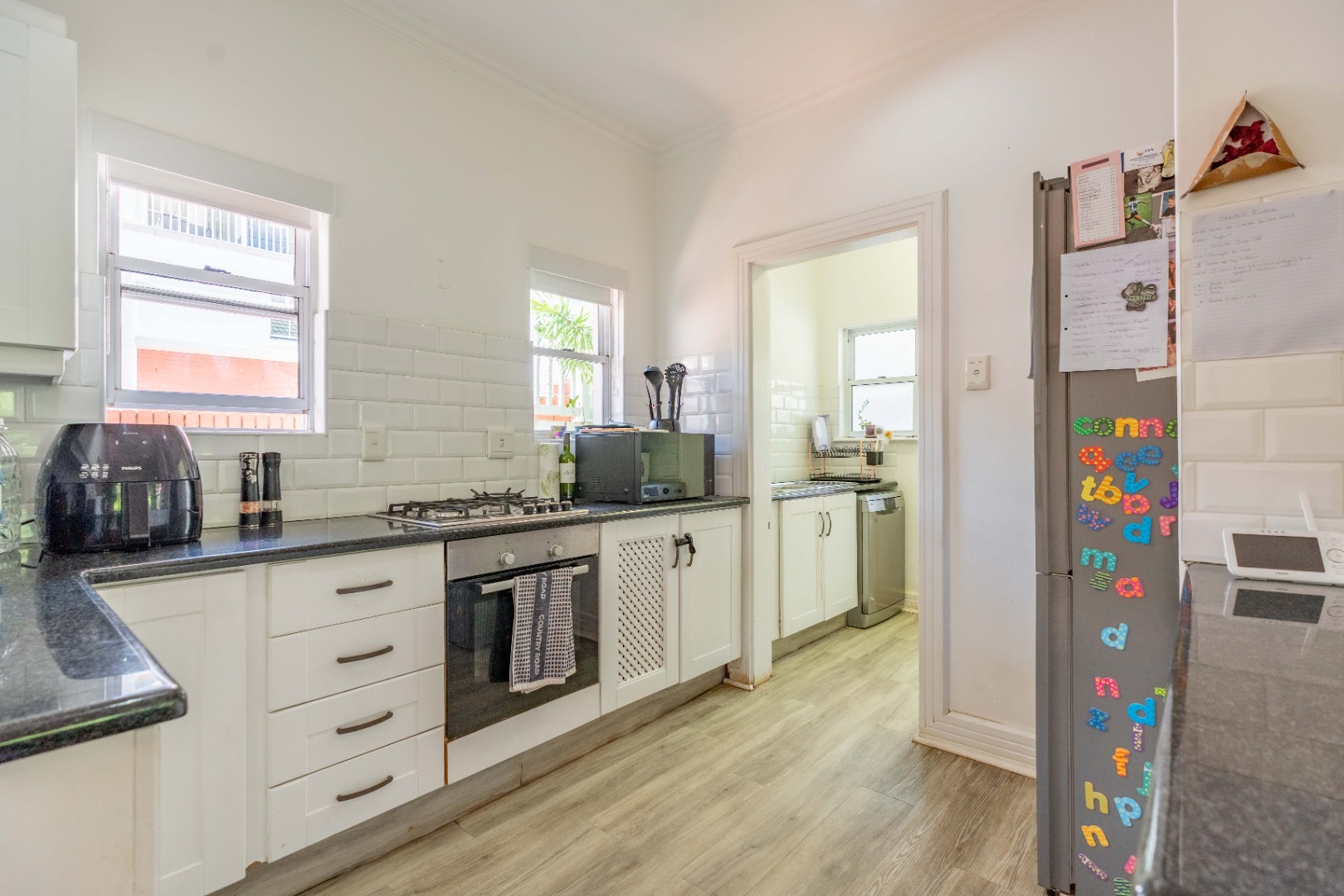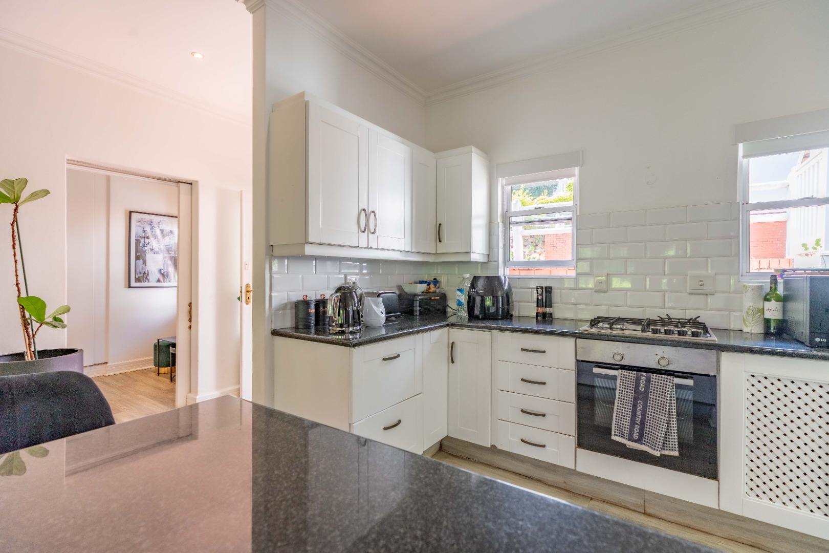 The kitchen is tastefully finished with granite countertops, ample cabinetry, and a casual dining counter. A separate scullery and laundry area ensure daily convenience remains discreetly out of view.