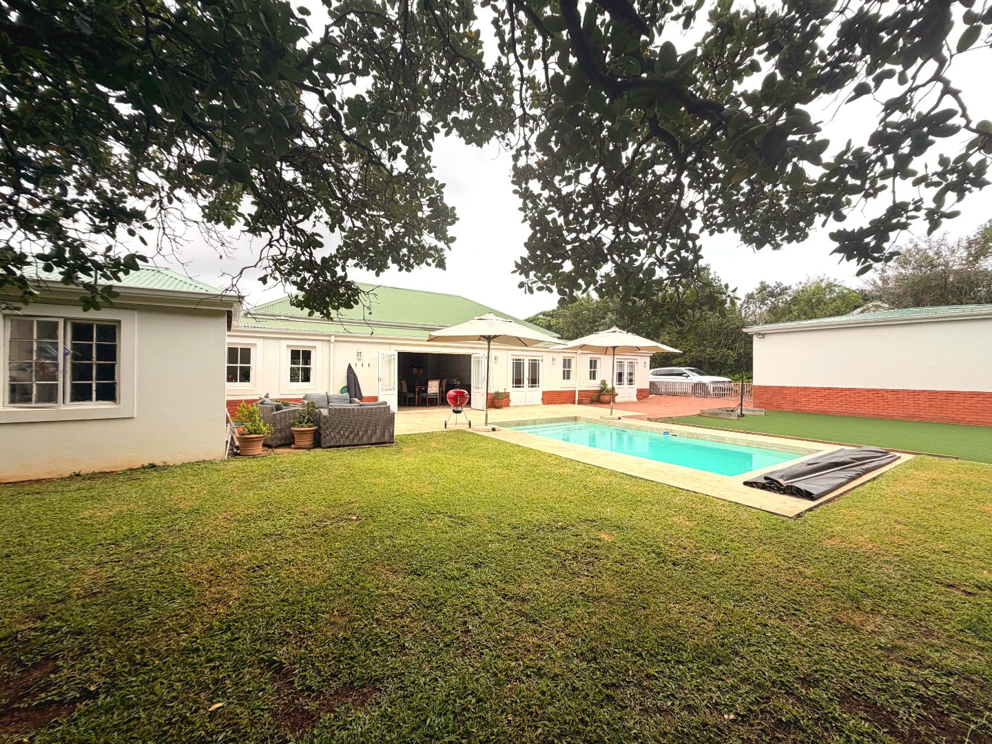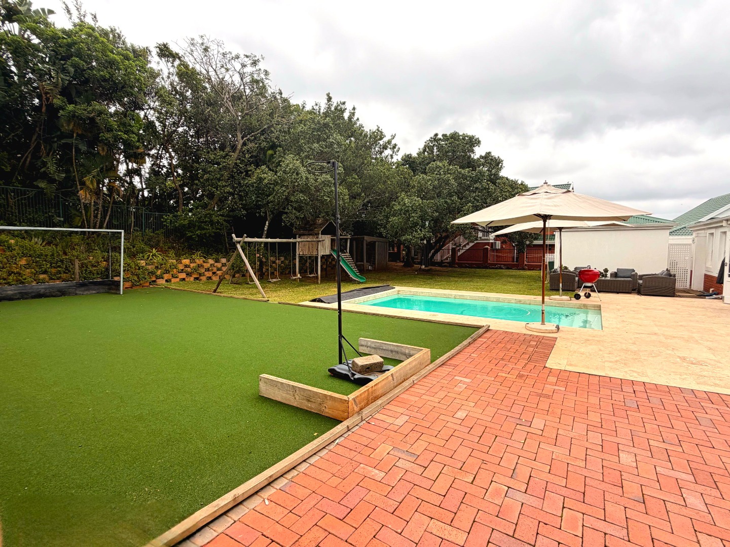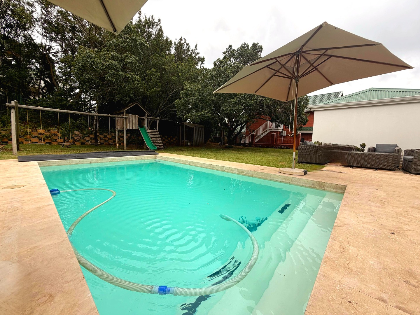 The property extends to a generous 1489.00 sqm erf, featuring a private garden and a sparkling swimming pool, astro turf hockey practice area and jungle gym, perfect for outdoor enjoyment. A welcoming patio and balcony provide ideal spots for alfresco dining or simply taking in the scenic views. With two garages and additional parking space, vehicle accommodation is well catered for, and pets are welcome.