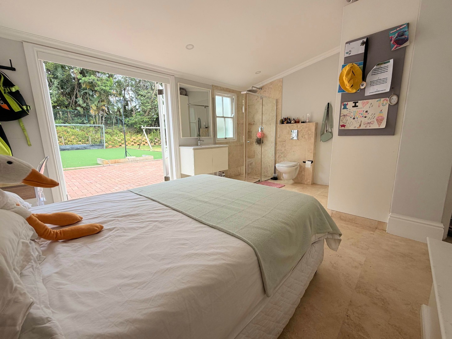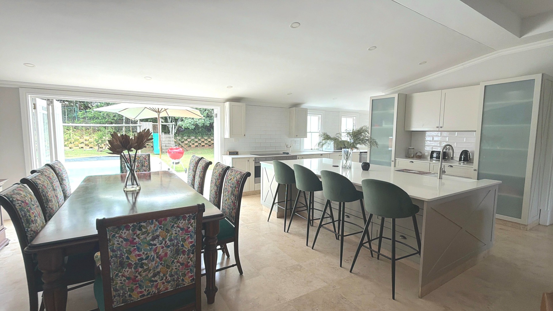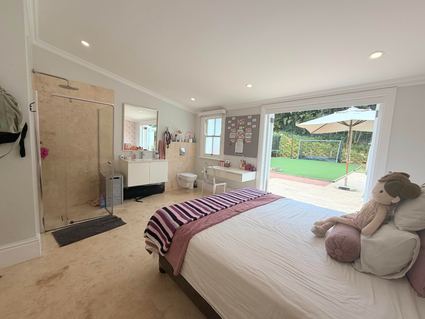 The property extends to a generous 1489.00 sqm erf, featuring a private garden and a sparkling swimming pool, astro turf hockey practice area and jungle gym, perfect for outdoor enjoyment. A welcoming patio and balcony provide ideal spots for alfresco dining or simply taking in the scenic views. With two garages and additional parking space, vehicle accommodation is well catered for, and pets are welcome.