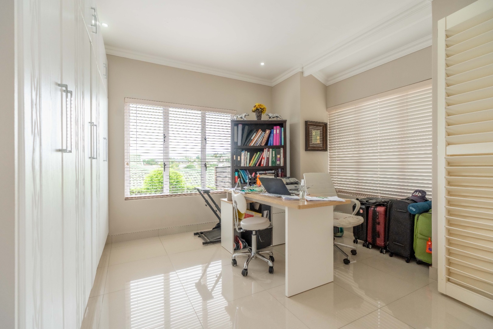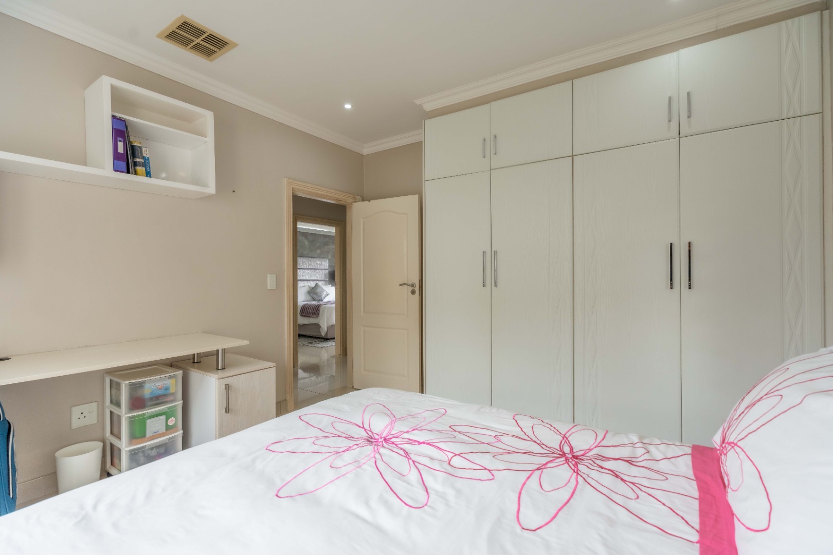 The home offers four versatile bedrooms, or three plus a study, depending on your needs. All bedrooms down the hallway feature built-in cupboards and air conditioning. The spacious main bedroom is east-facing and includes a luxurious his-and-hers walk-in closet and a large en-suite bathroom with a double vanity and a generous shower.