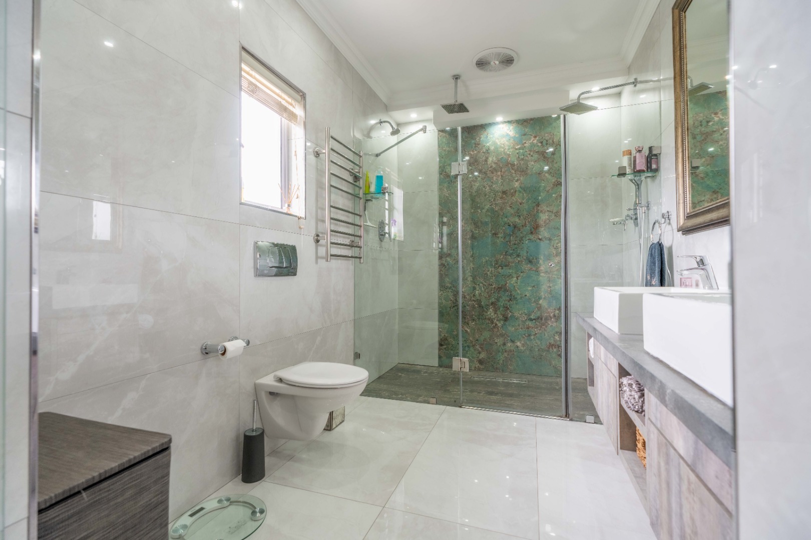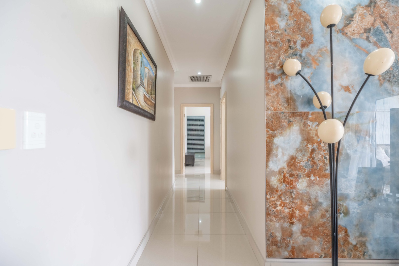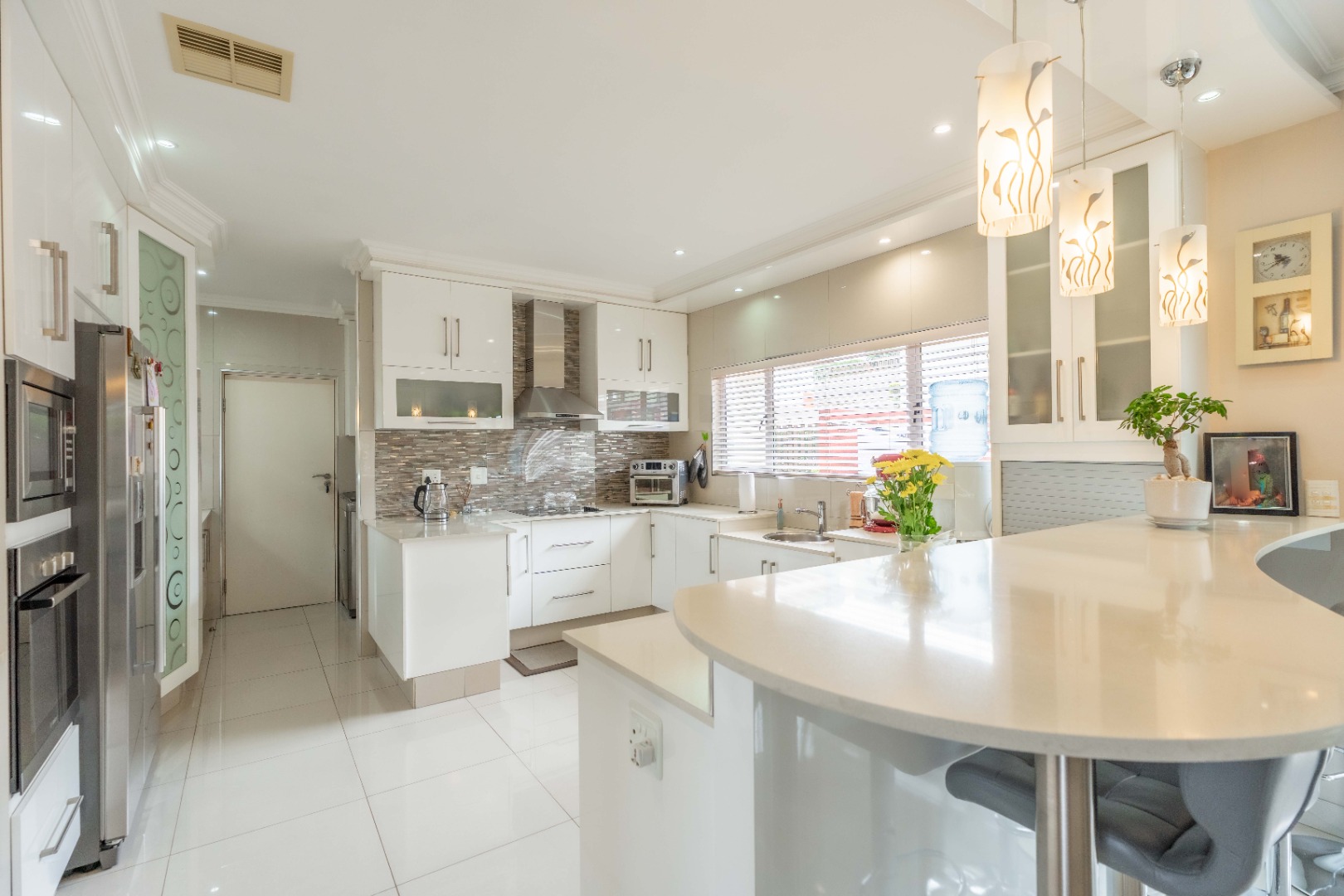 As you enter through the grand double-volume front door, you’re welcomed into a spacious entrance hall that flows seamlessly into an open-plan living area. The modern kitchen, designed for both functionality and style, boasts granite countertops, a built-in oven, a double-door fridge, a 2-plate gas hob, ample cupboard space, and a generous walk-in pantry. A separate scullery is fully plumbed for a washing machine and dishwasher and includes a double sink.