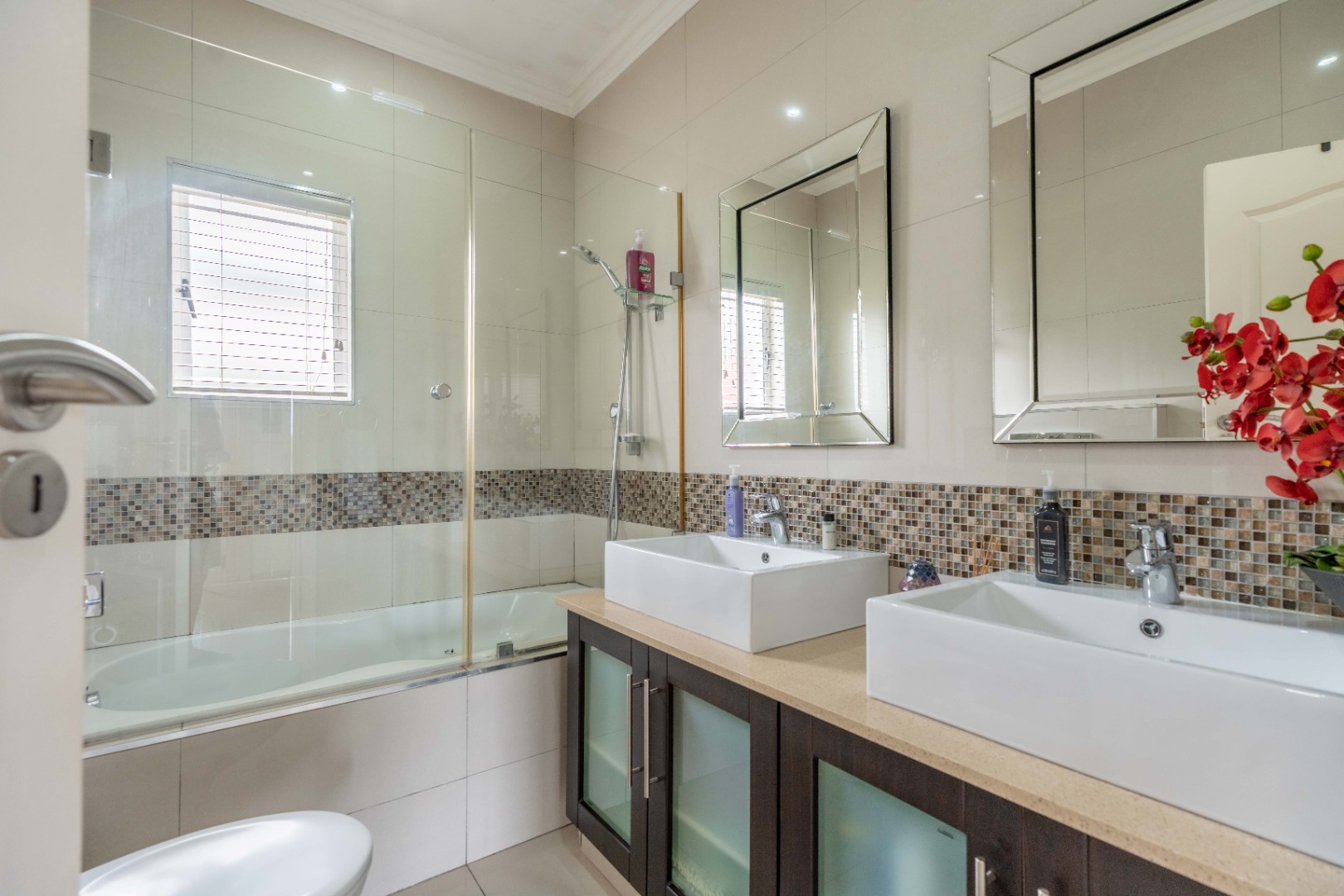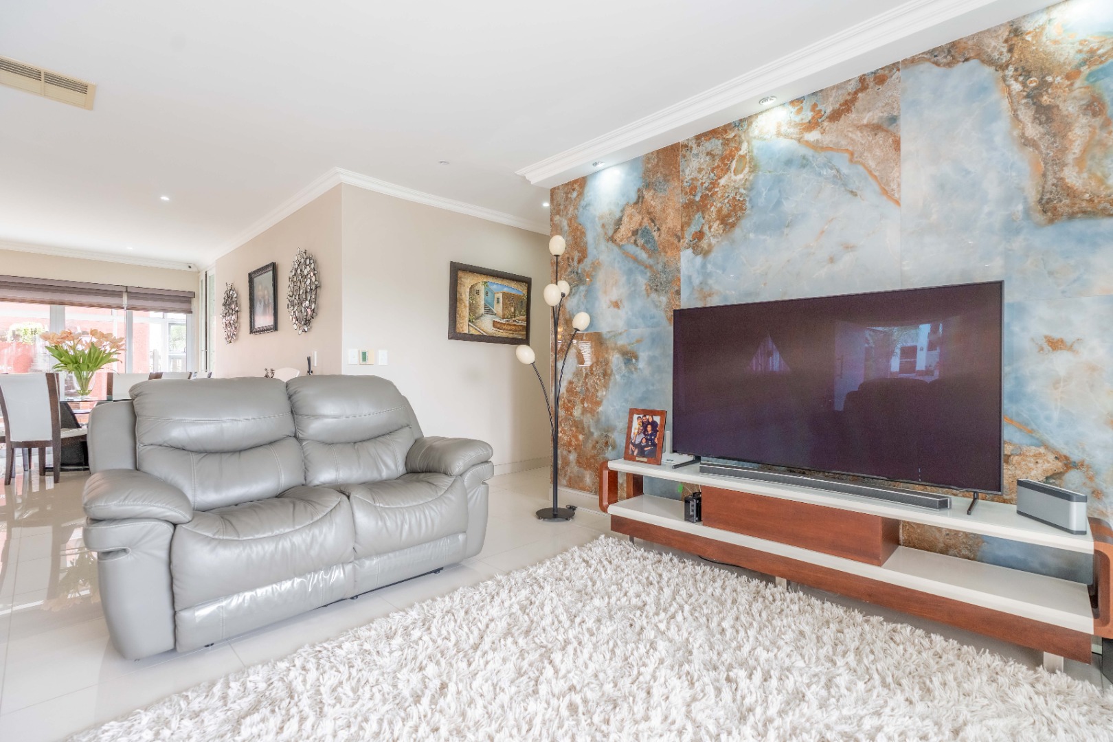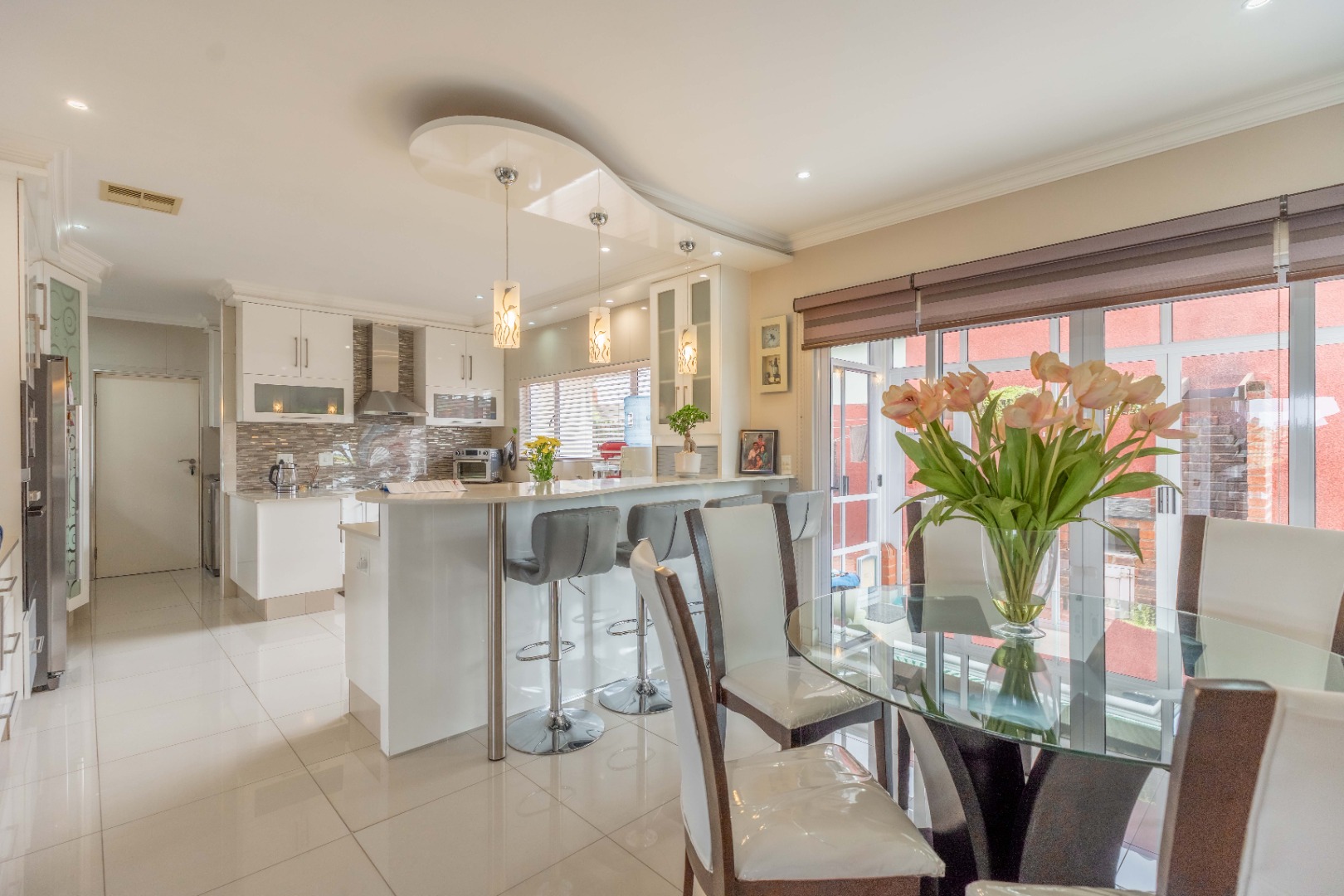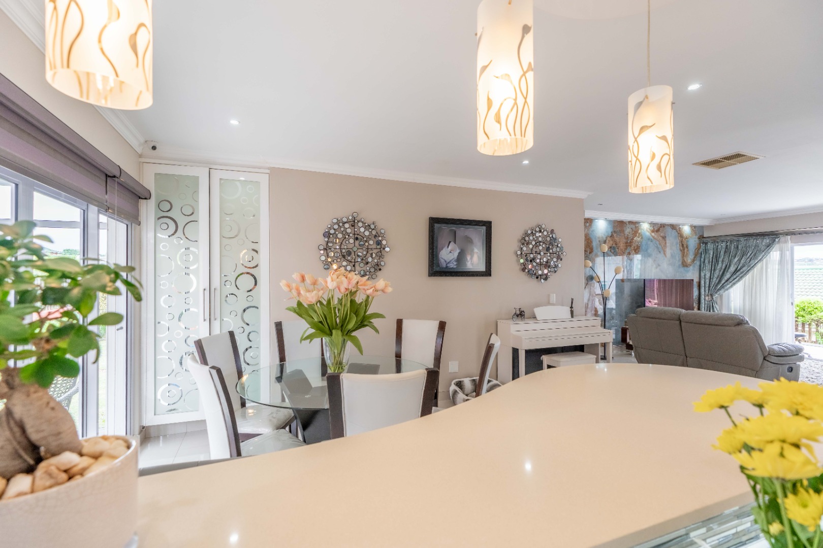 Glass doors from the dining area open onto a bright glass-enclosed sunroom that leads to a built-in braai area—perfect for entertaining. This outdoor space is equipped with a prep sink and lighting, making it ideal for weekend gatherings. The lounge extends to another sunroom that overlooks the sparkling swimming pool, a perfect setting for morning coffee or relaxing evenings.