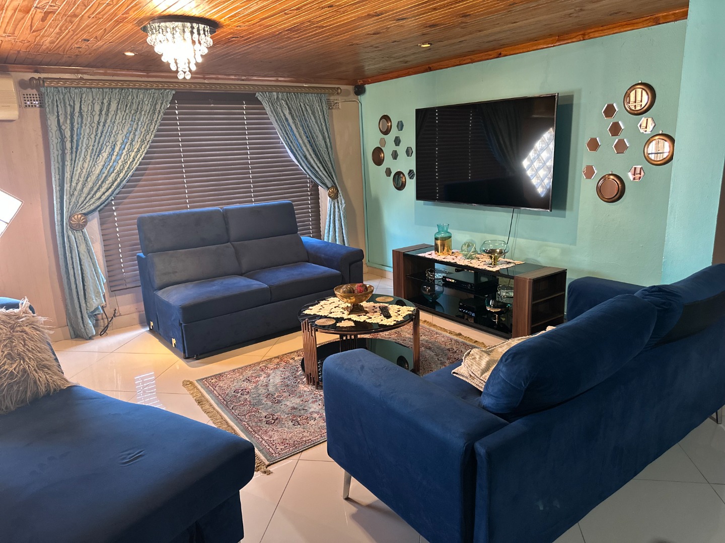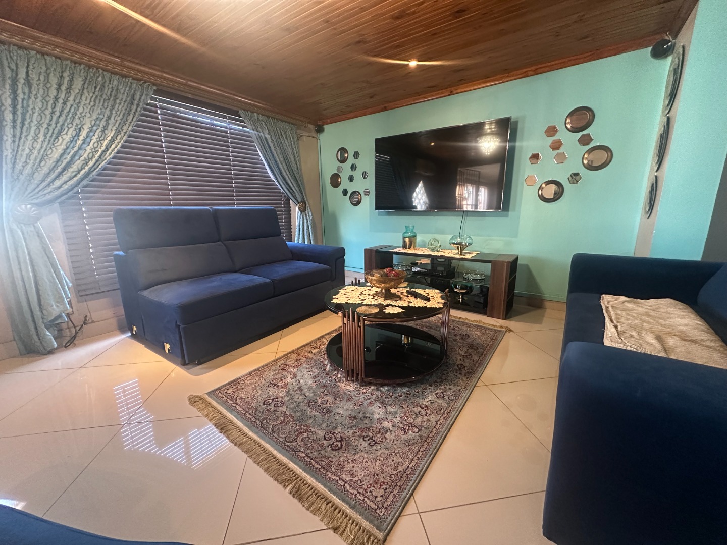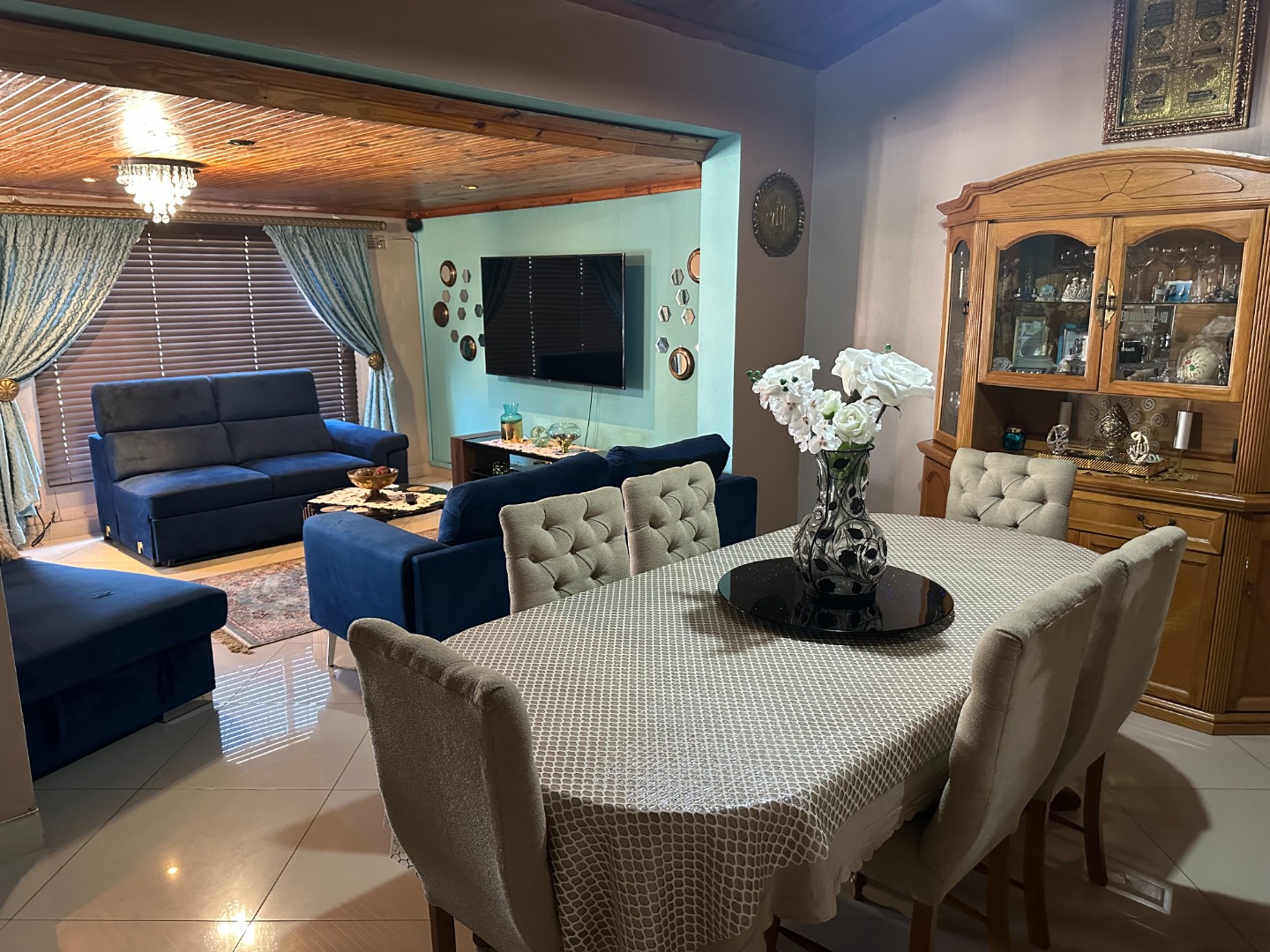 The home flows into a gorgeous lounge and dining room. The kitchen is fully fitted with built in cupboards and there’s a scullery fitted with gas stove and space for a double fridge