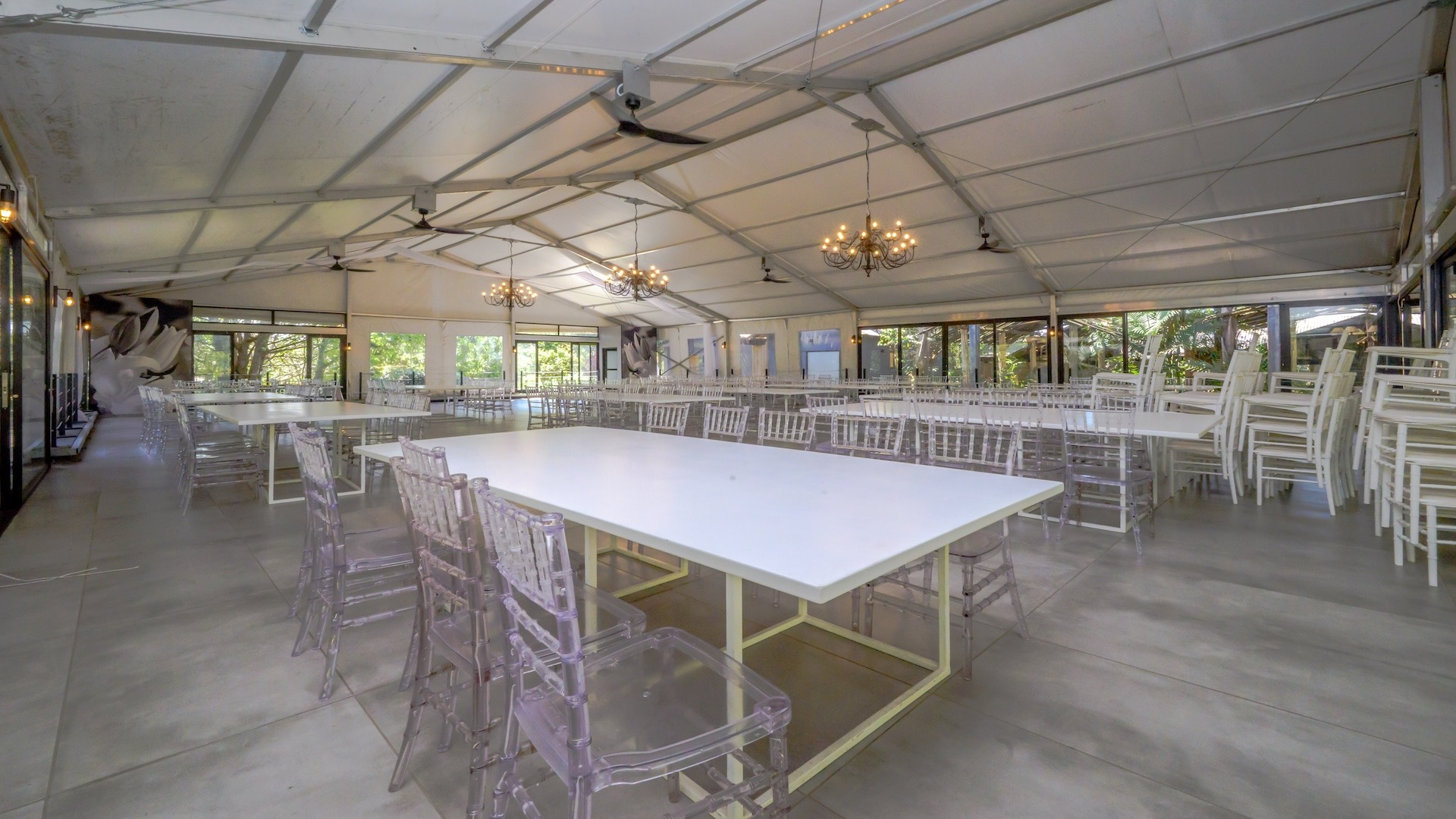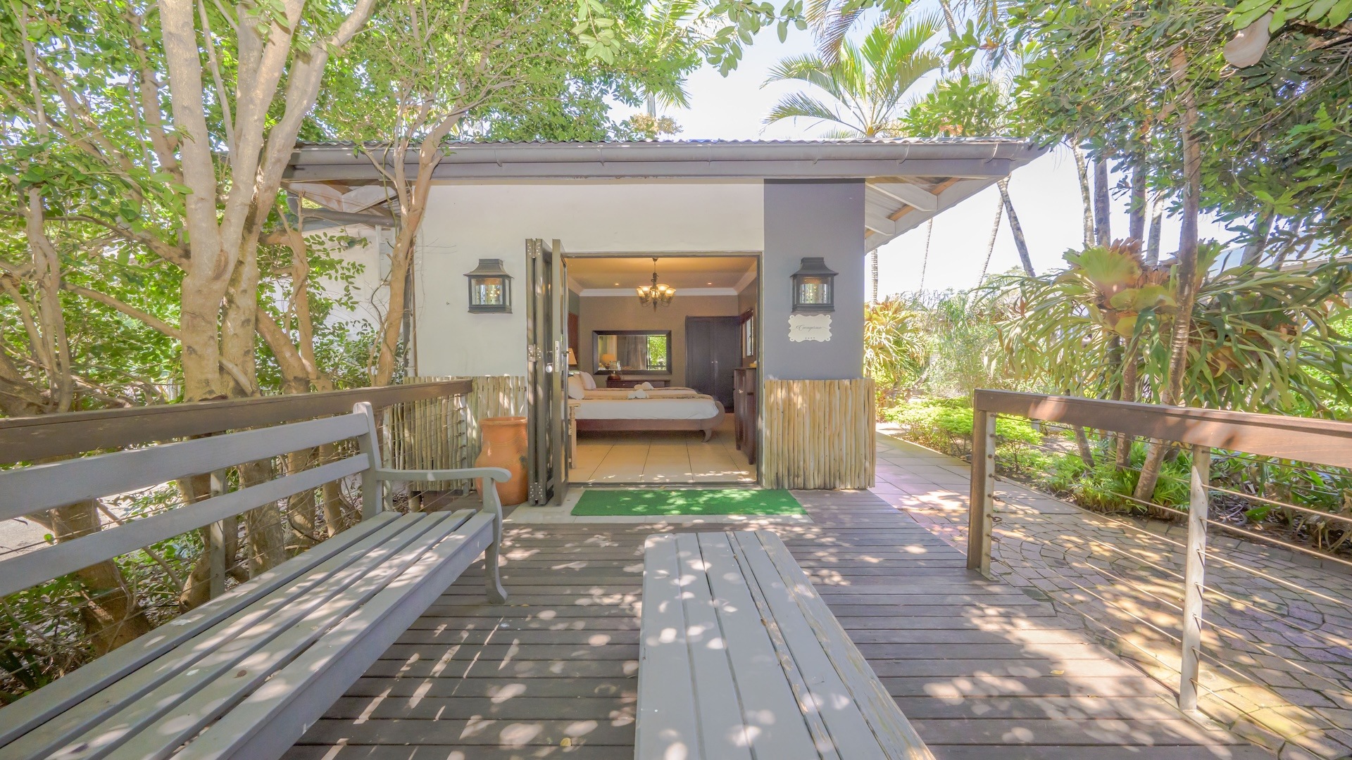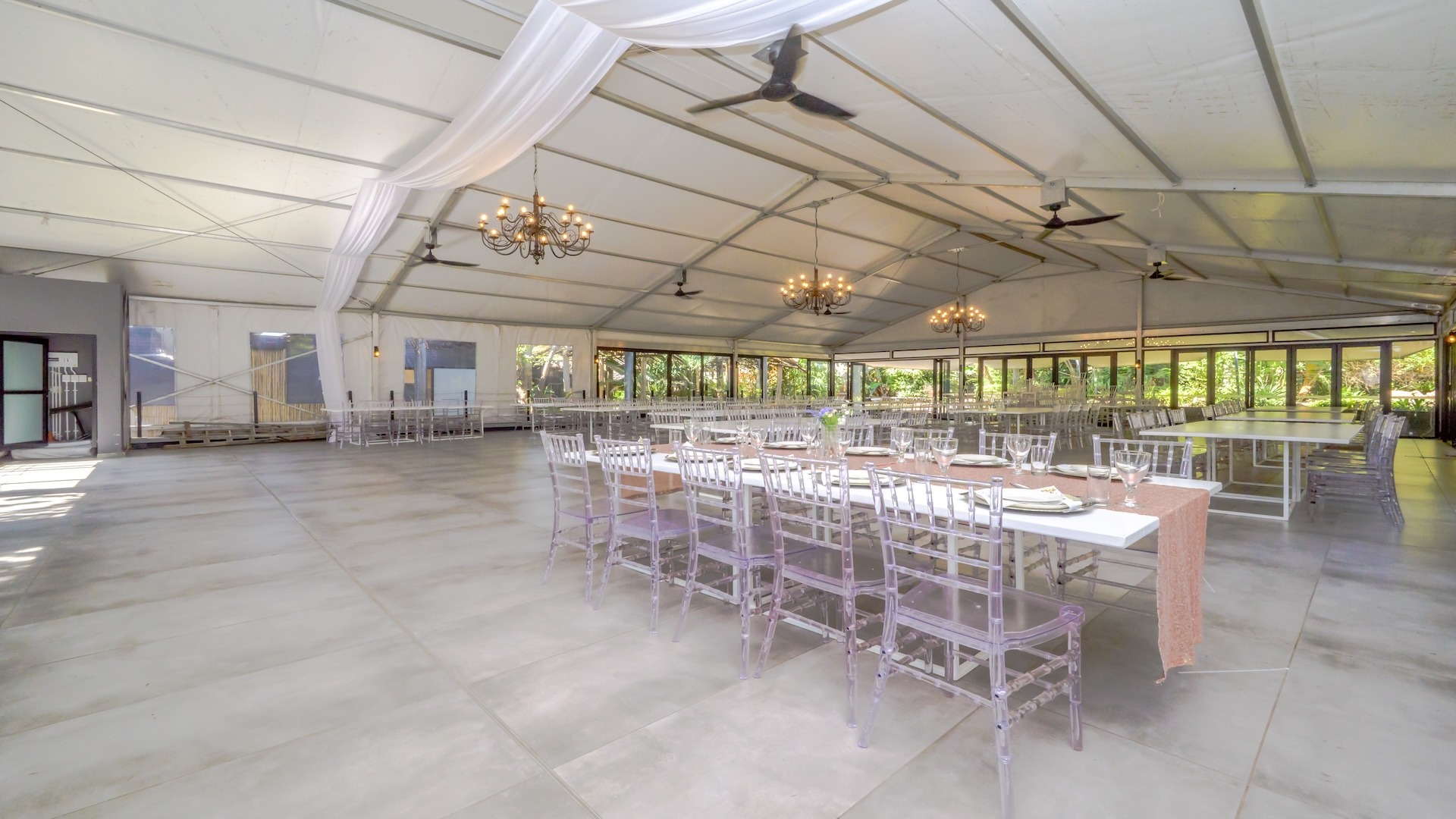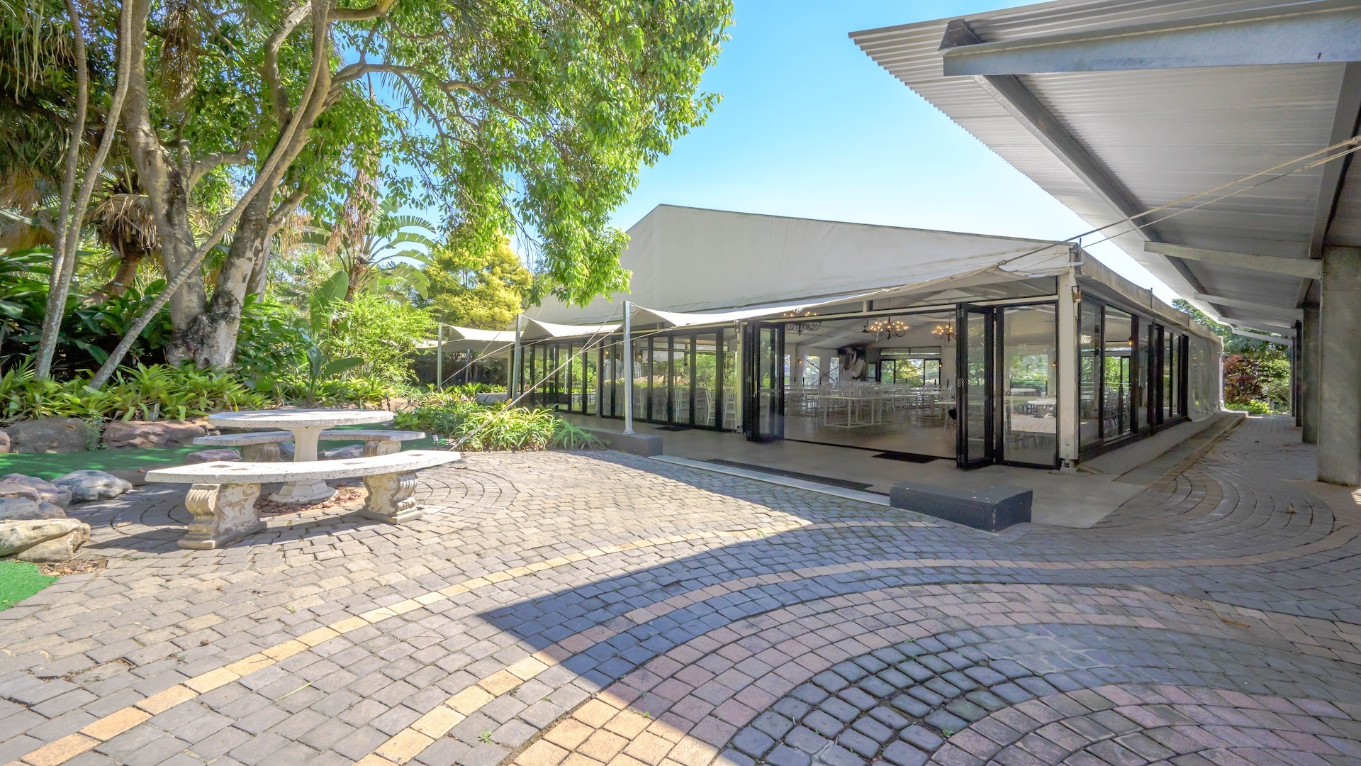 There are 16 en-suite B&B rooms nestled amongst the foliage, leading onto private courtyards. The wedding venue comprises a massive glass marquee spilling onto covered entertainment areas amongst palm trees and lush greenery. There are separate toilet facilities for men and women plus two kitchens and a bar.