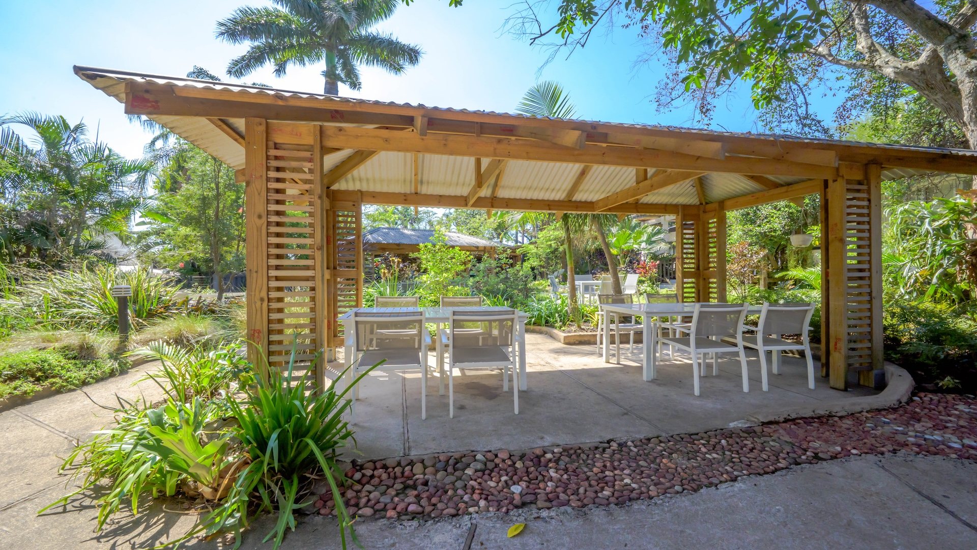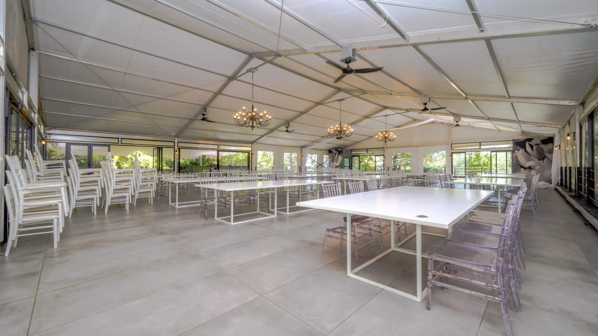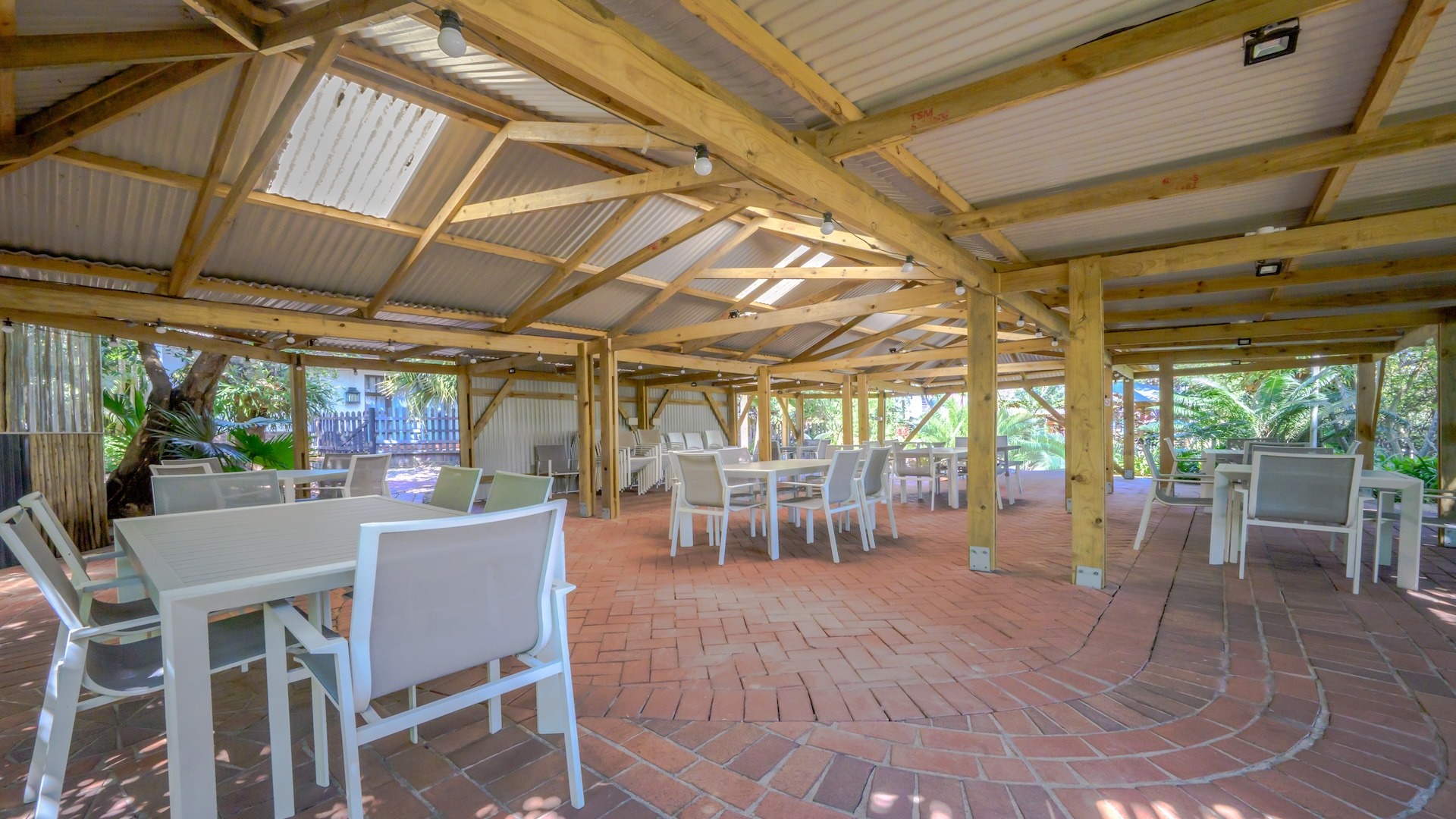 There are 16 en-suite B&B rooms nestled amongst the foliage, leading onto private courtyards. The wedding venue comprises a massive glass marquee spilling onto covered entertainment areas amongst palm trees and lush greenery. There are separate toilet facilities for men and women plus two kitchens and a bar.