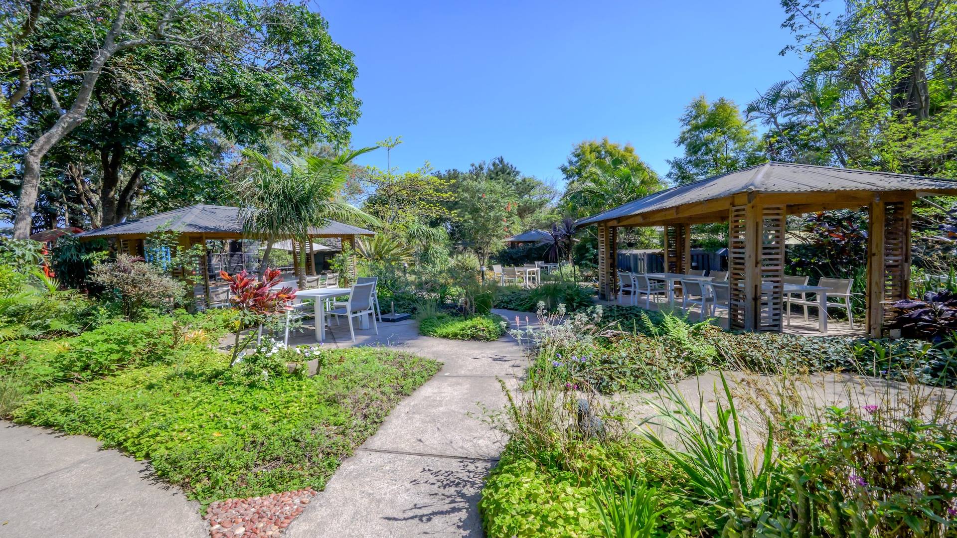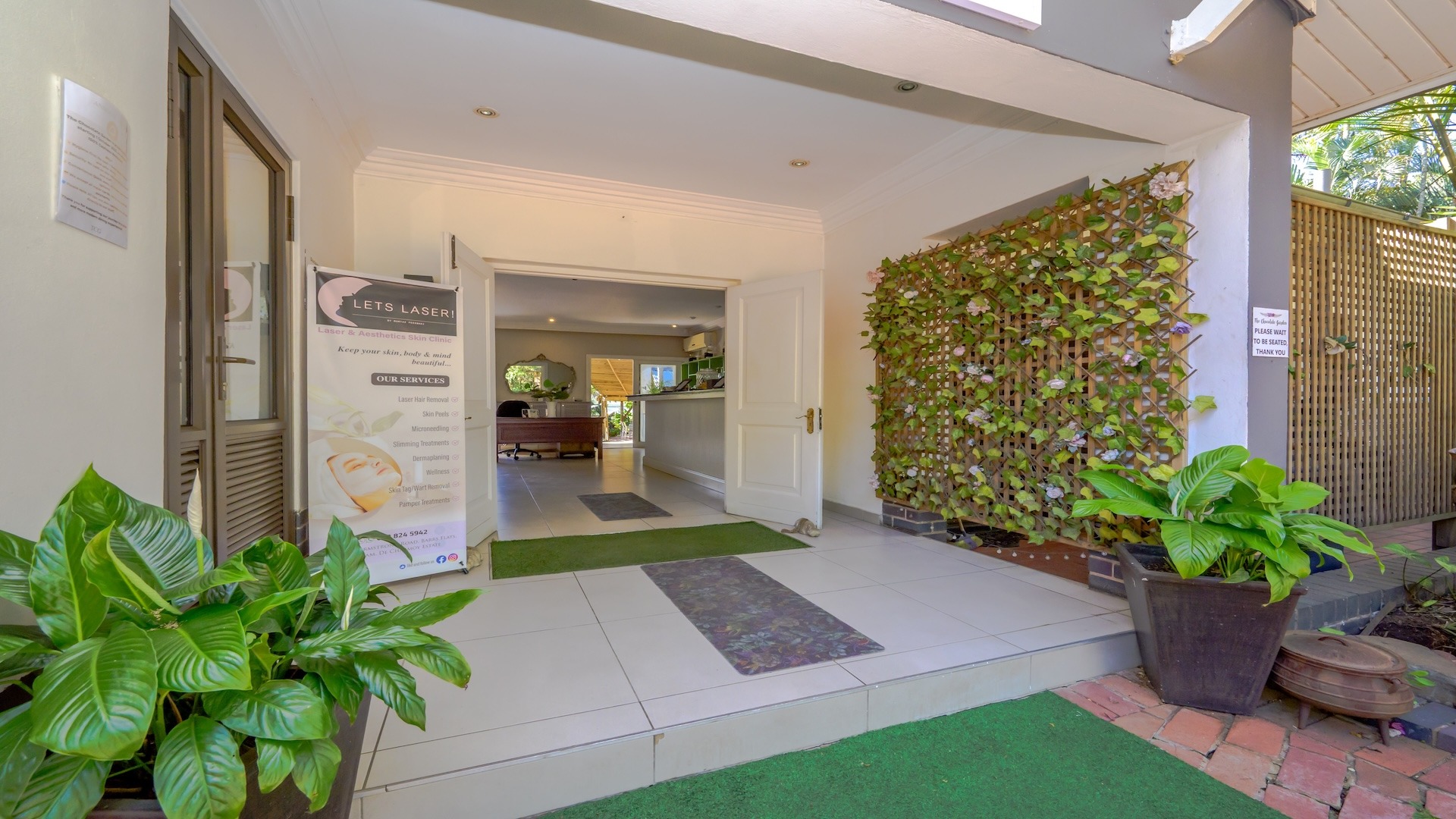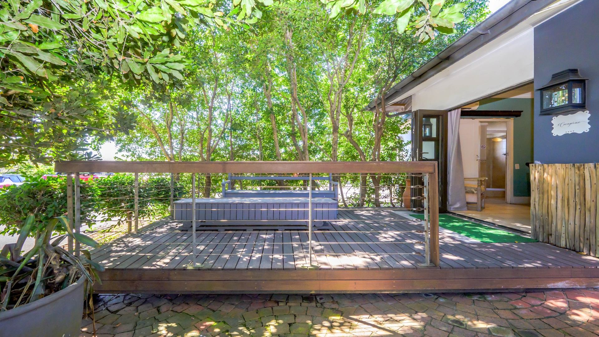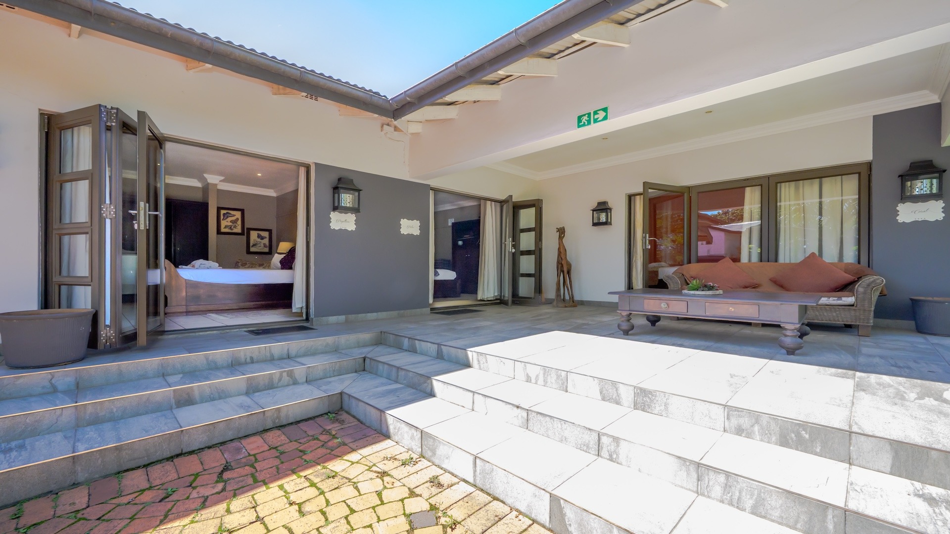 There are 16 en-suite B&B rooms nestled amongst the foliage, leading onto private courtyards. The wedding venue comprises a massive glass marquee spilling onto covered entertainment areas amongst palm trees and lush greenery. There are separate toilet facilities for men and women plus two kitchens and a bar.