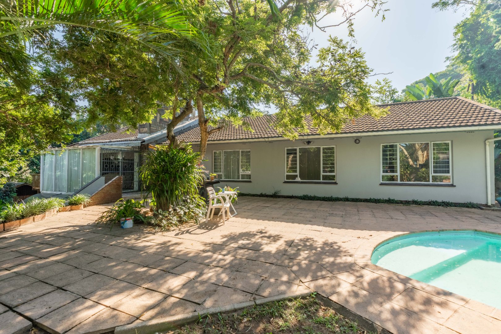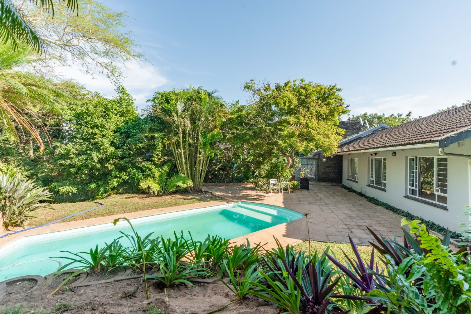 Inside, you will find an open-plan living area designed for modern living, seamlessly integrating a lounge, dining room and study space. The spacious kitchen is perfect for home chefs, offering ample room for cooking and entertaining. The main bedroom boasts an en-suite bathroom, while the remaining three bedrooms share a bathroom with a separate toilet – ideal for busy households. Step outside to enjoy a sparling pool, large garden space, and plenty of room for outdoor entertaining.