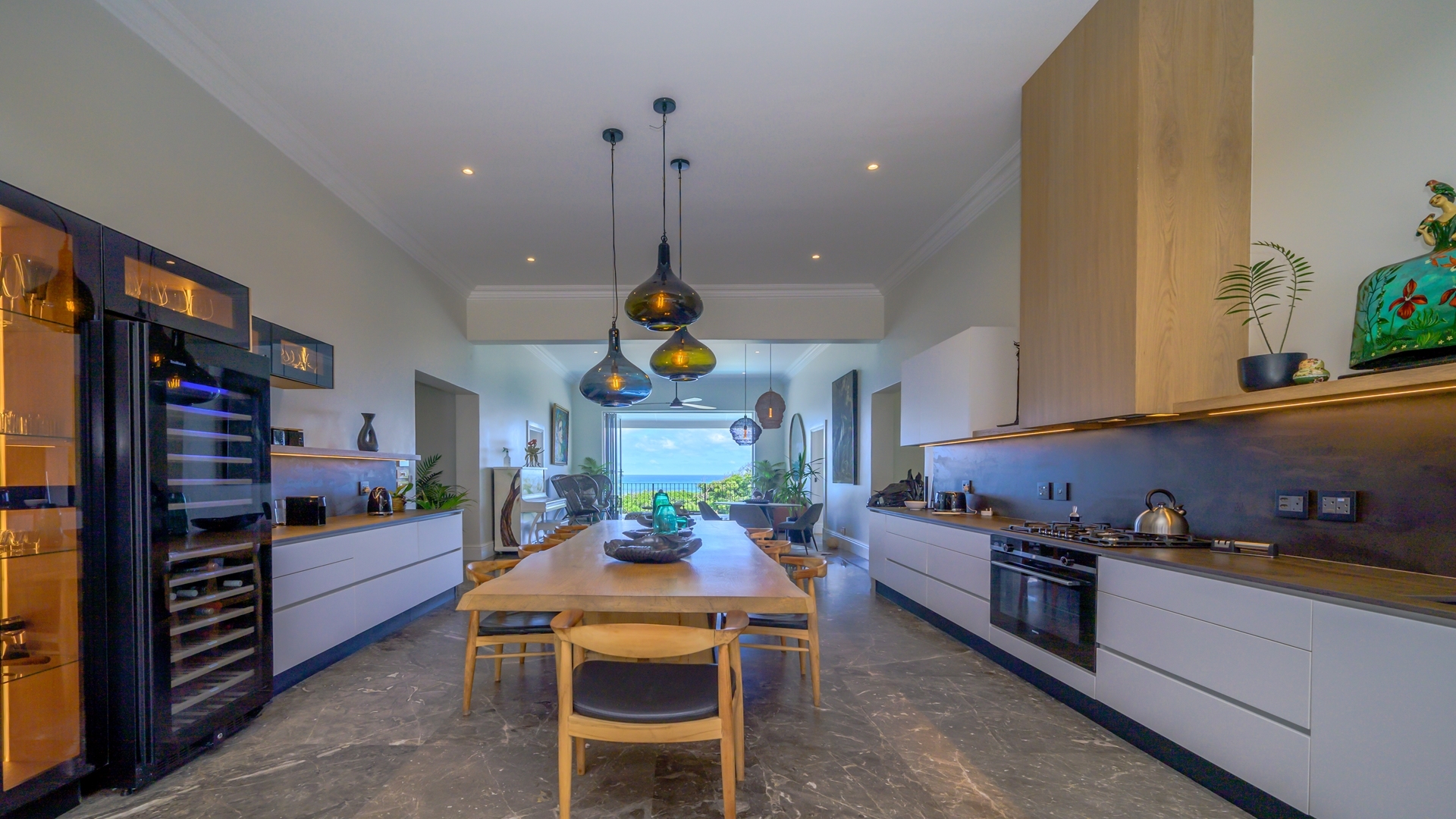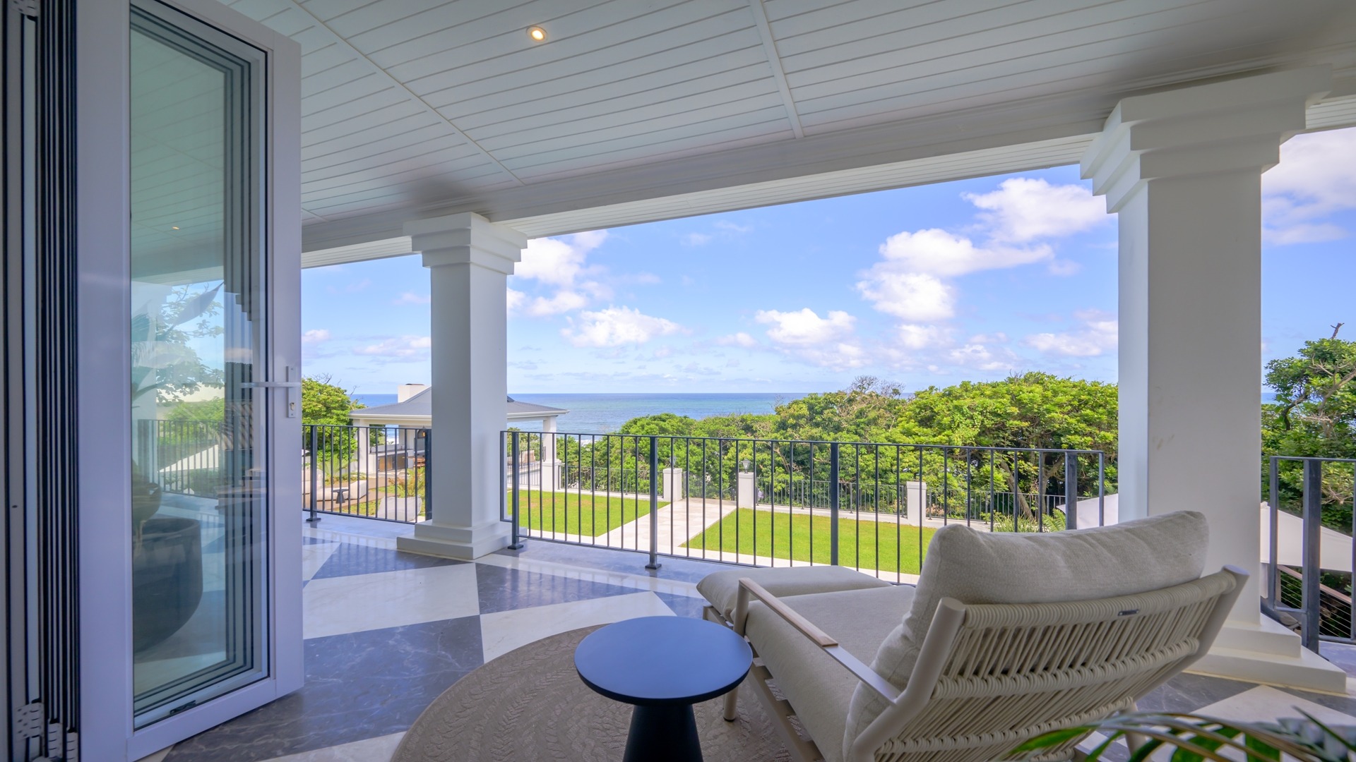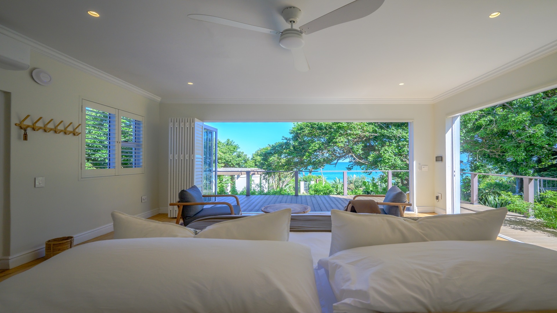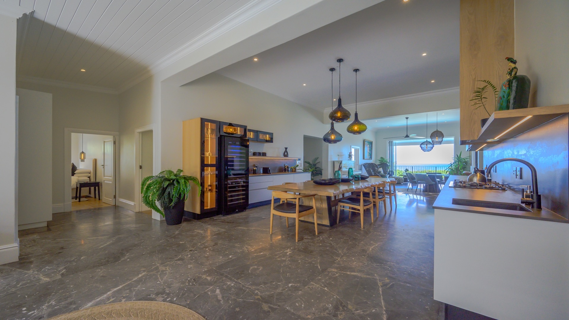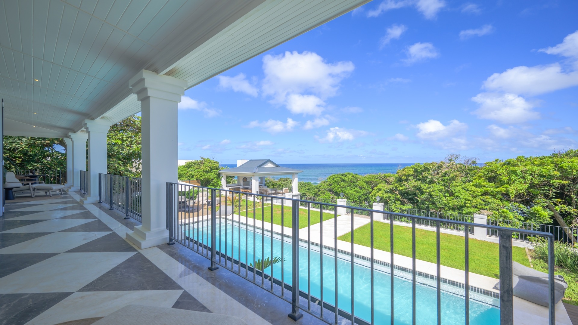 The open plan kitchen, lounge and dining room flow onto the spacious verandah overlooking the ocean and sprawling garden. All five en-suite bedrooms lead onto private patios or the verandah, with sea views.