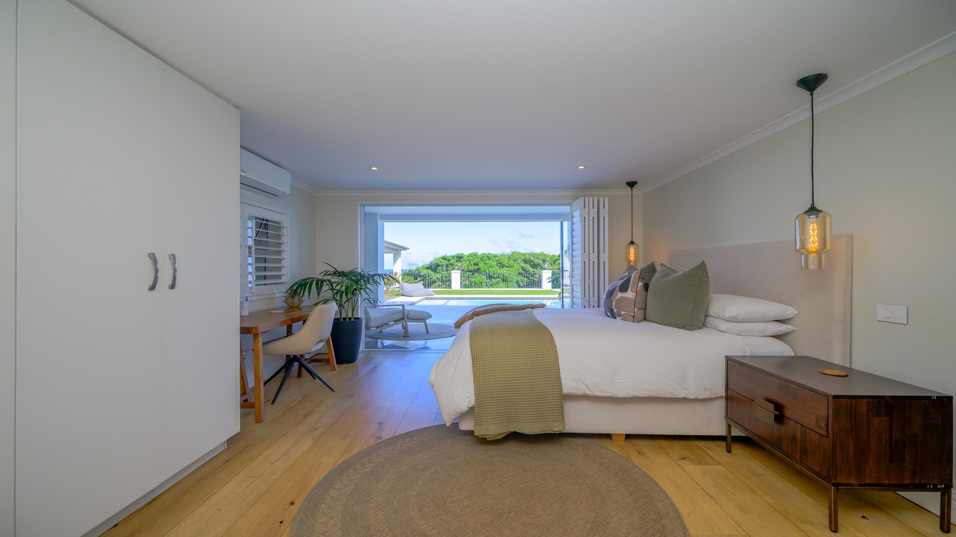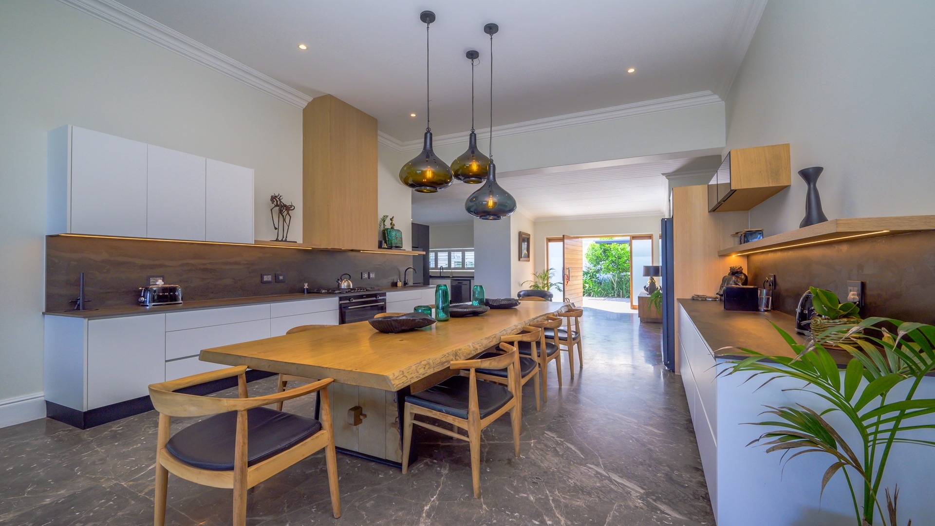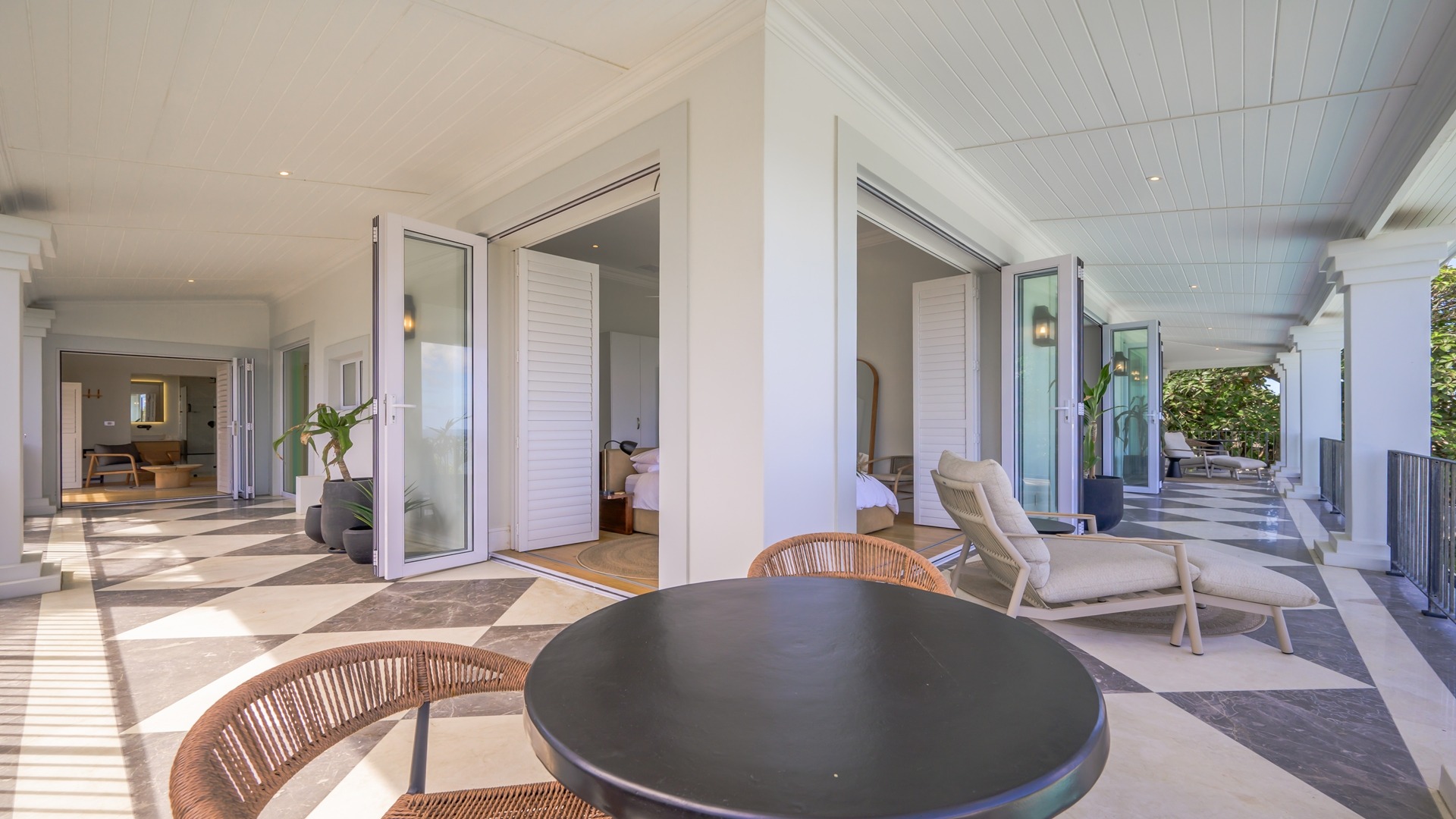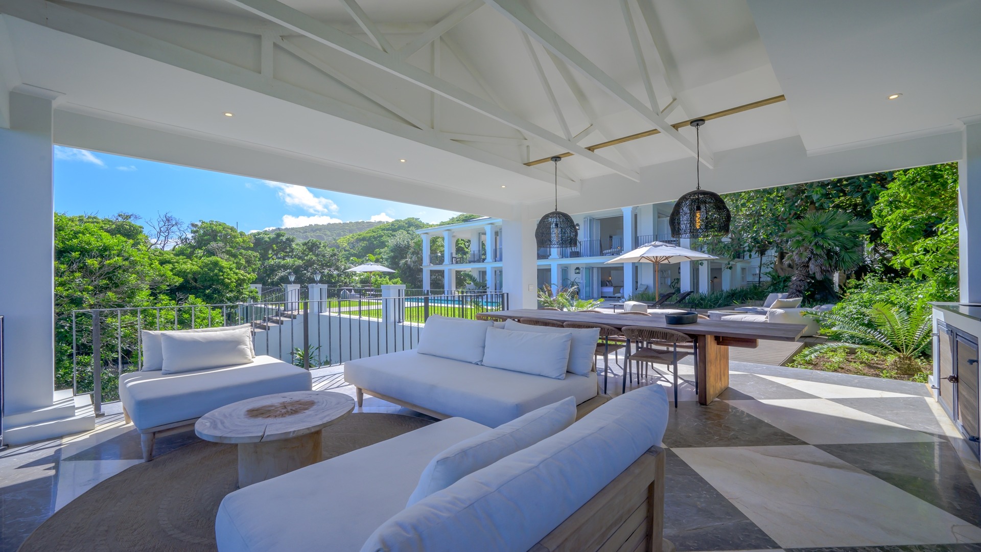 The open plan kitchen, lounge and dining room flow onto the spacious verandah overlooking the ocean and sprawling garden. All five en-suite bedrooms lead onto private patios or the verandah, with sea views.