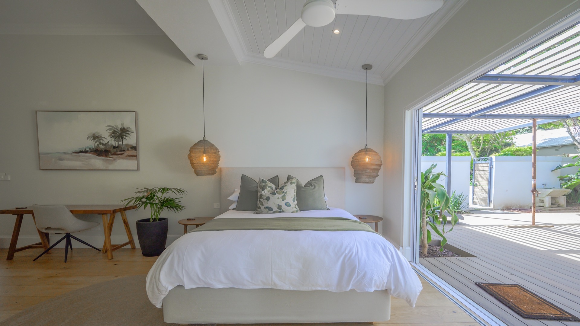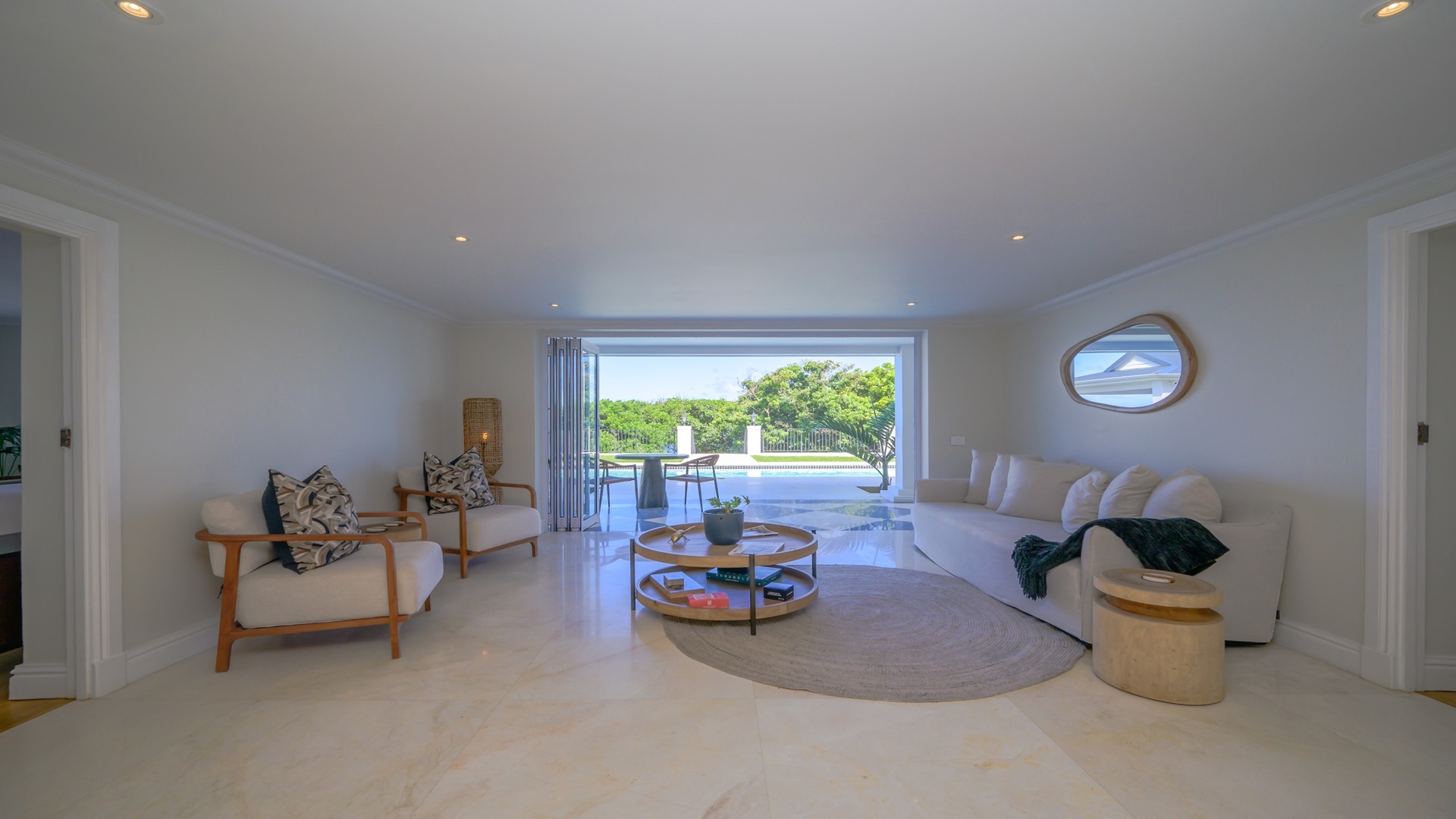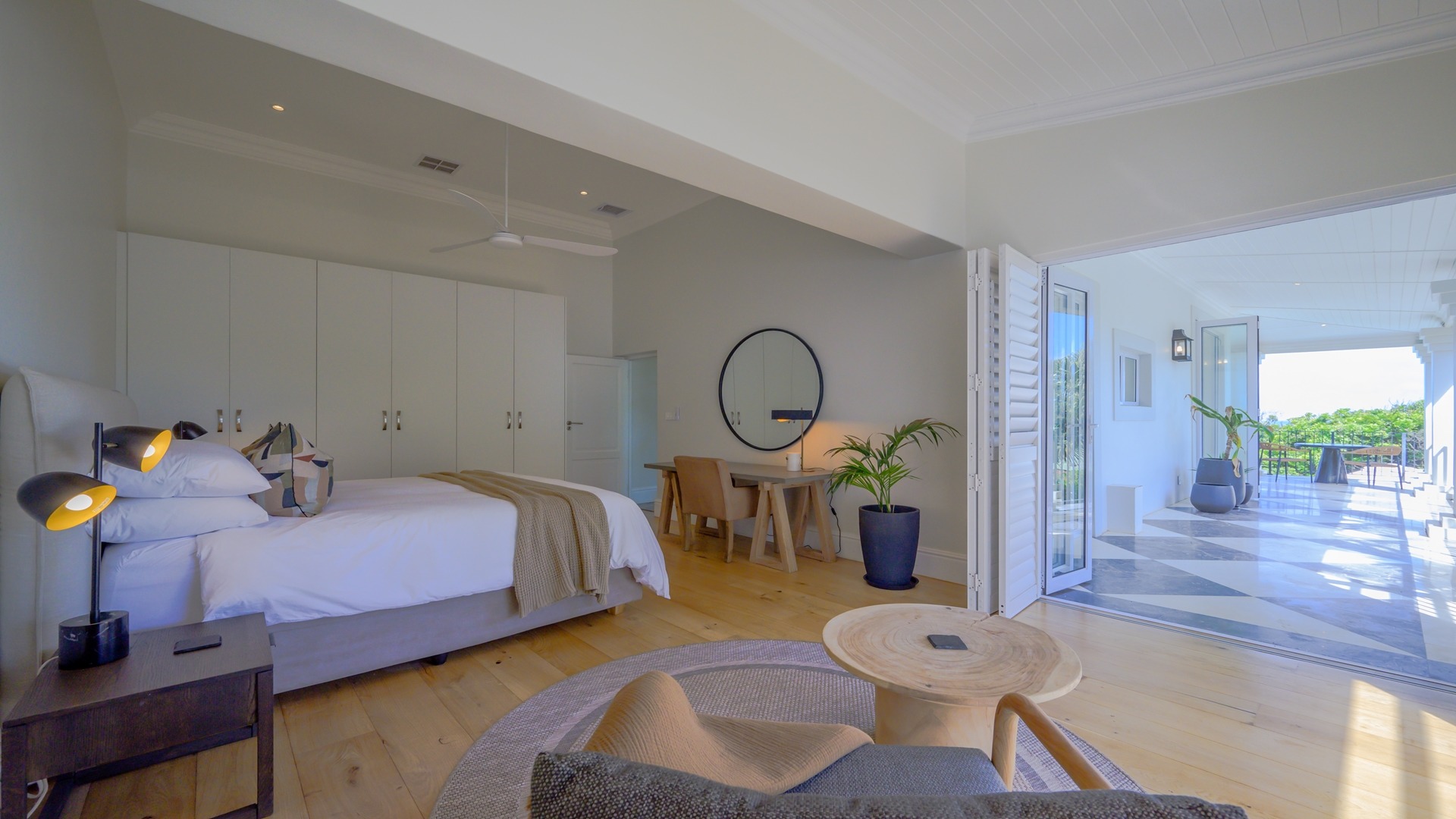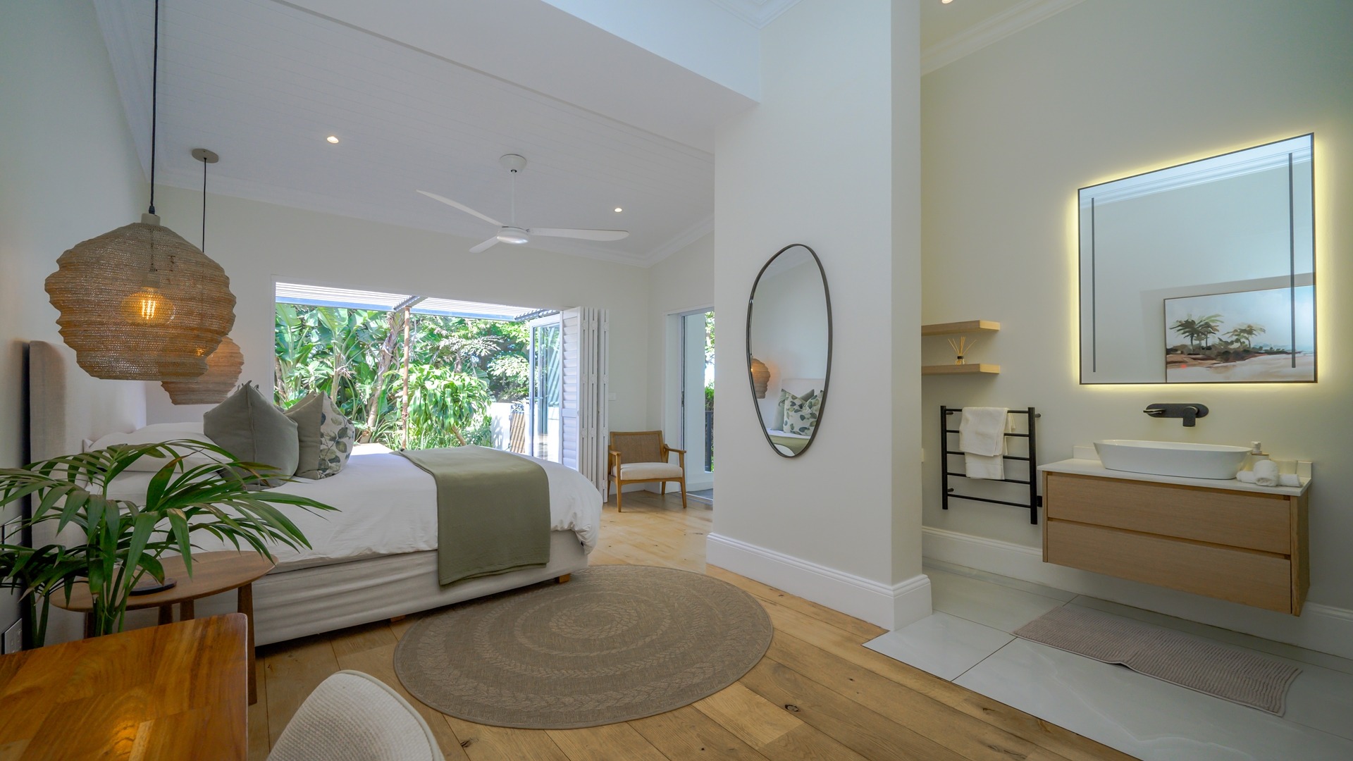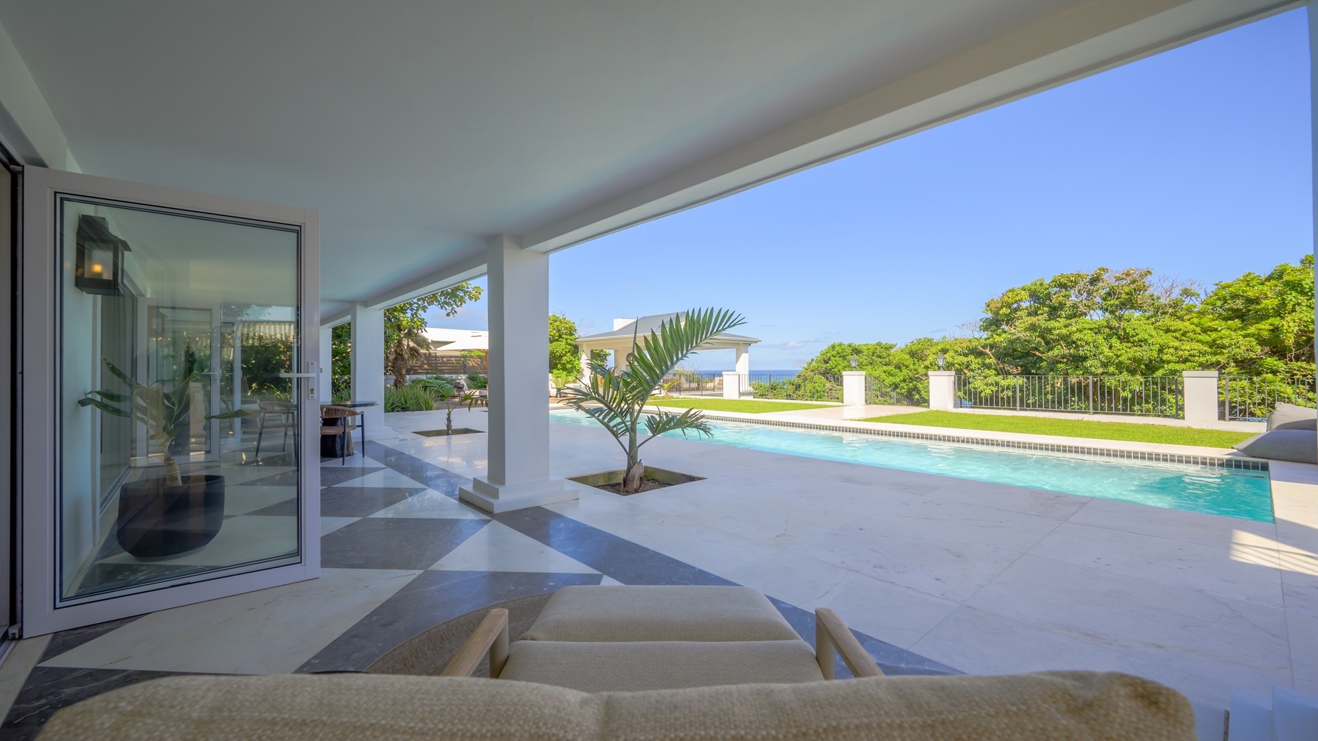 The open plan kitchen, lounge and dining room flow onto the spacious verandah overlooking the ocean and sprawling garden. All five en-suite bedrooms lead onto private patios or the verandah, with sea views.