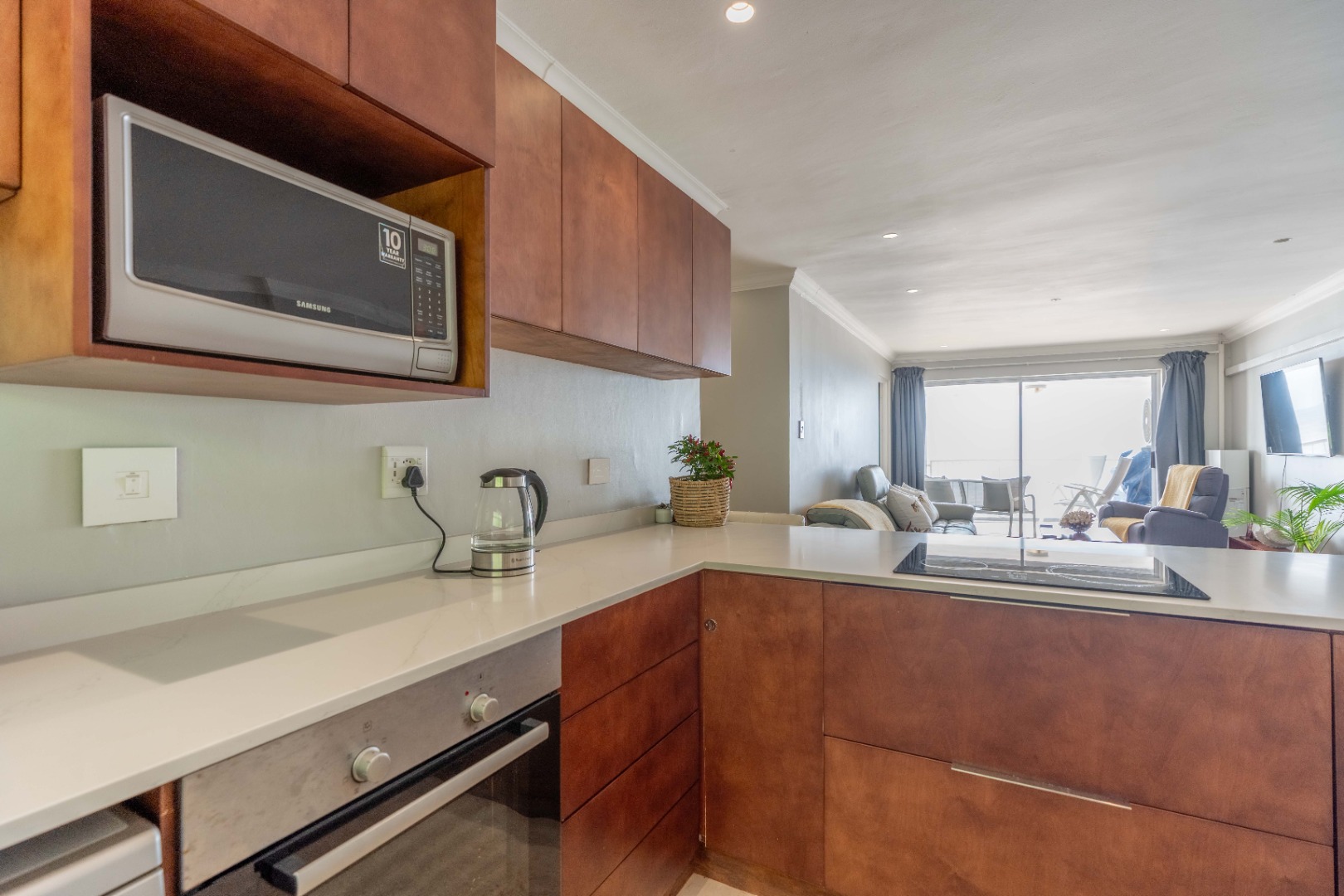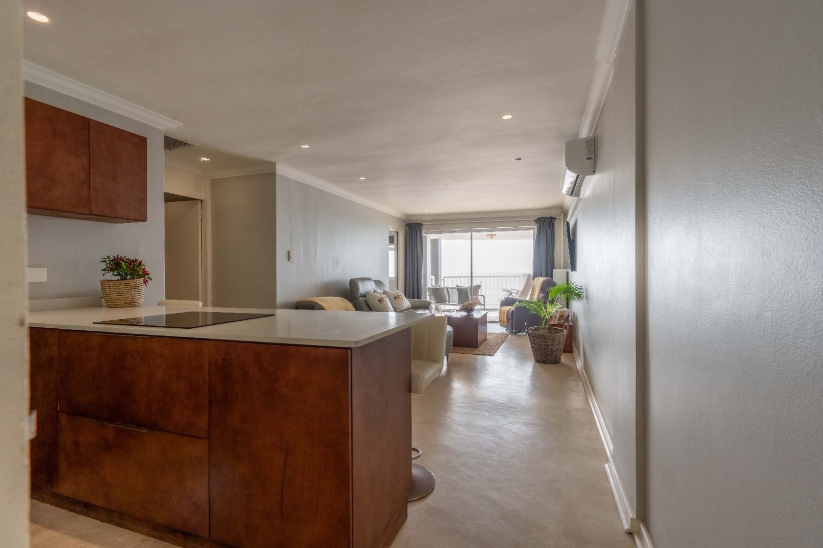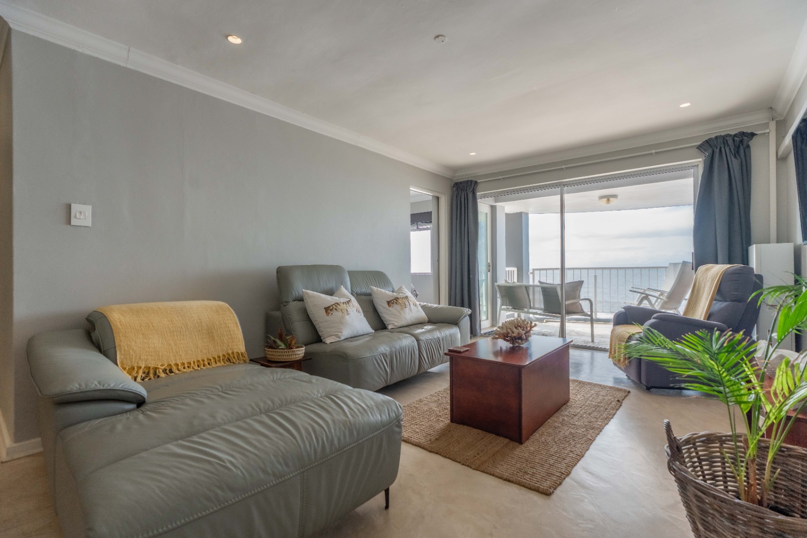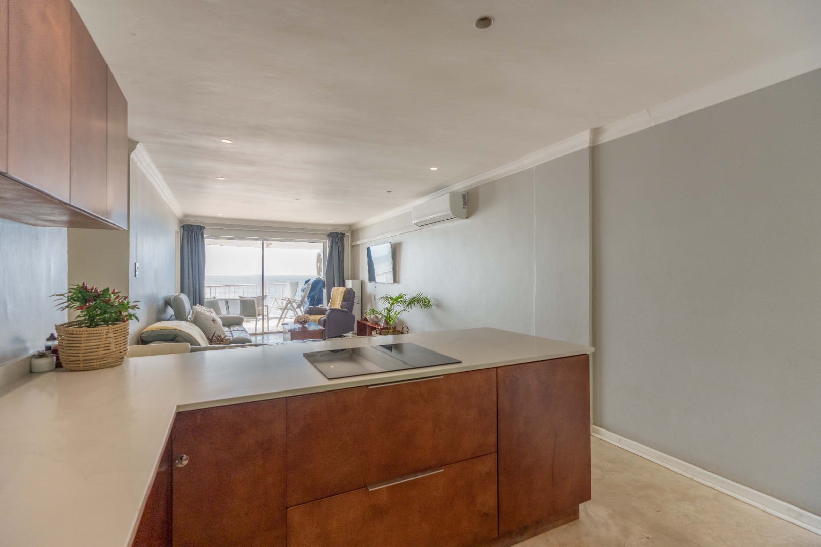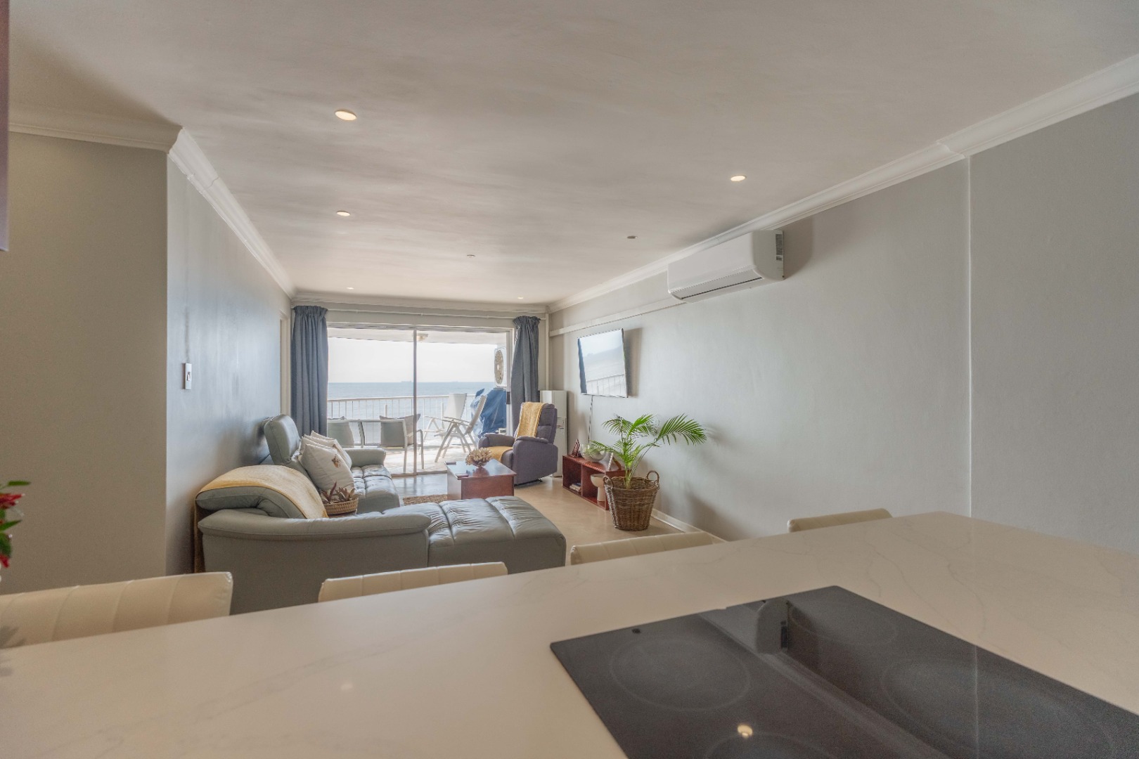 The open plan living area with spectacular ocean views, creates a seamless flow between the lounge, dinning space, and the ultra-modern kitchen, which boasts top-of-the-line finishes and sleek cabinetry.