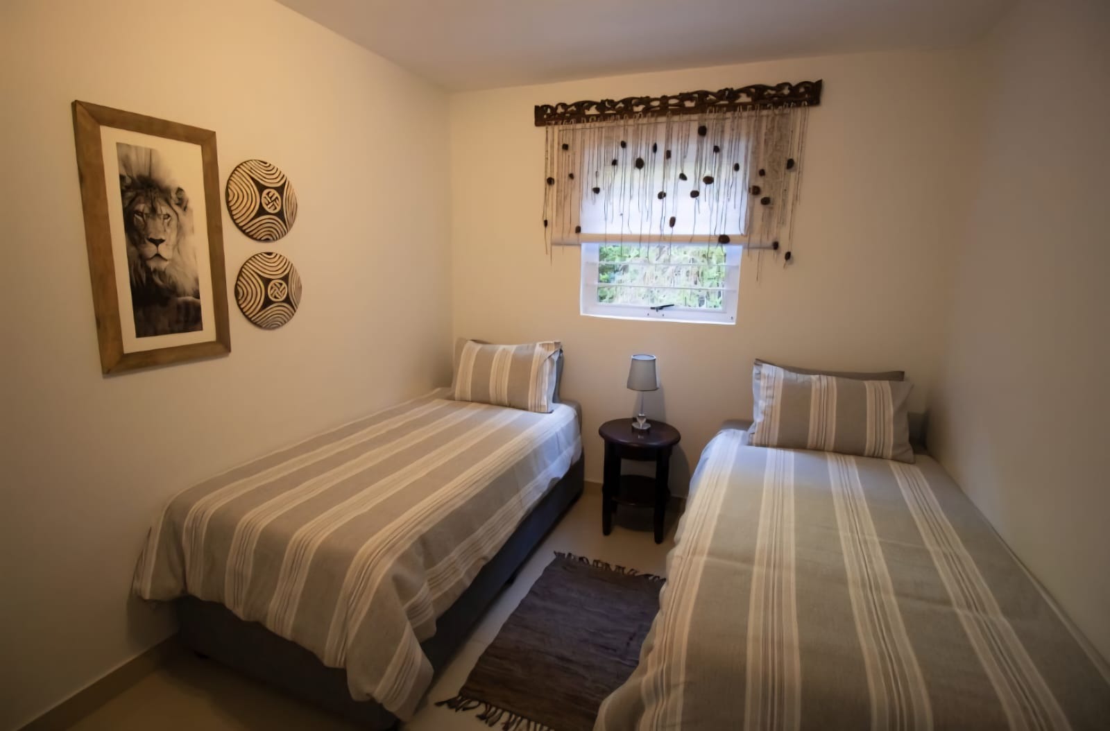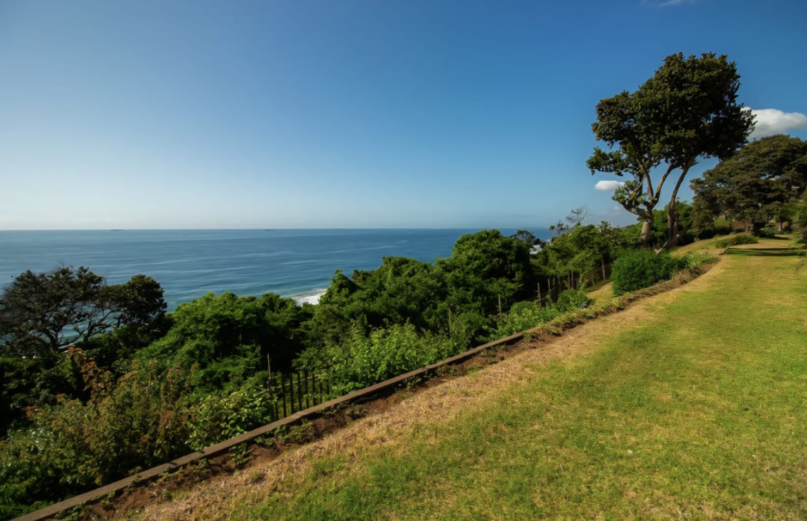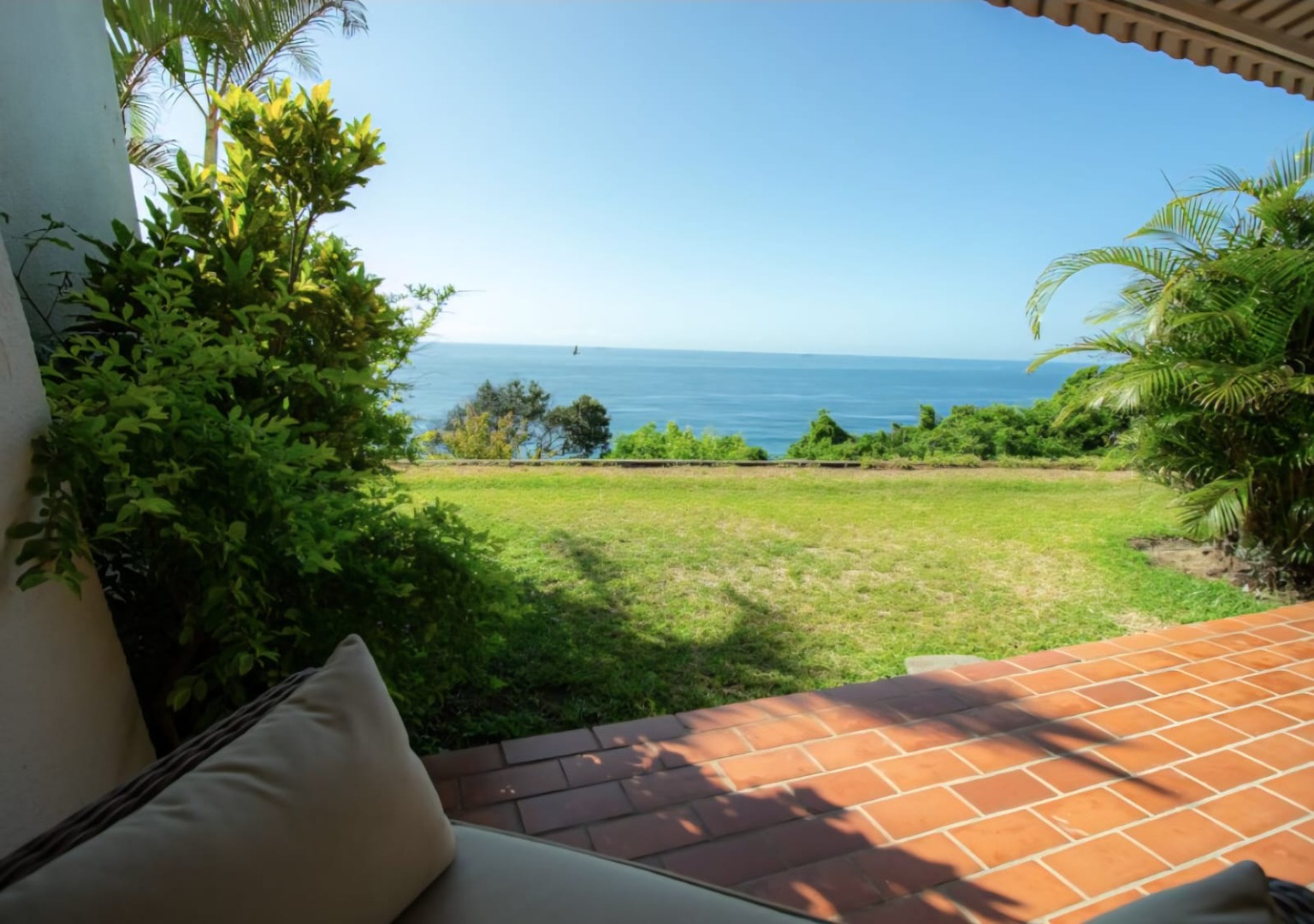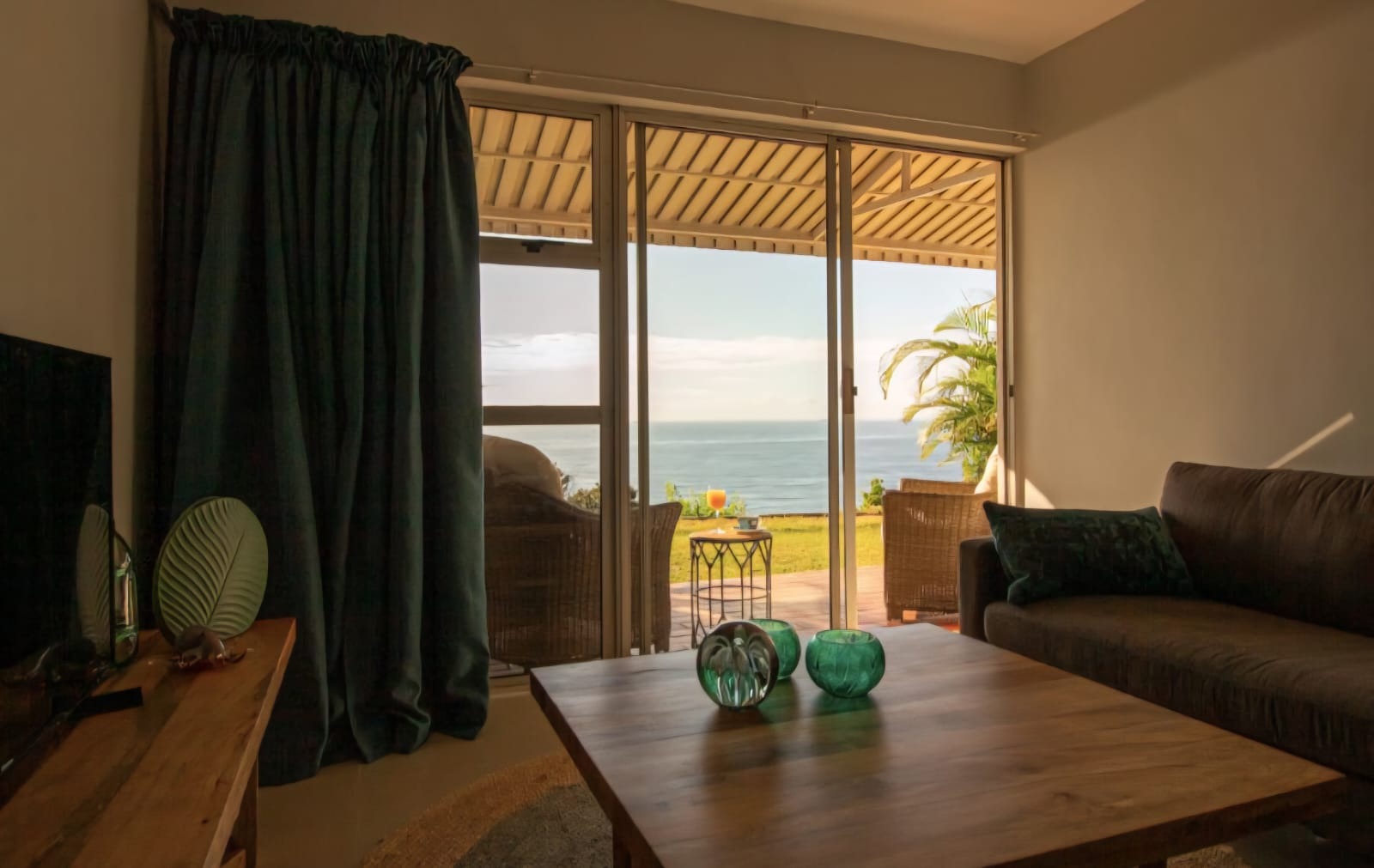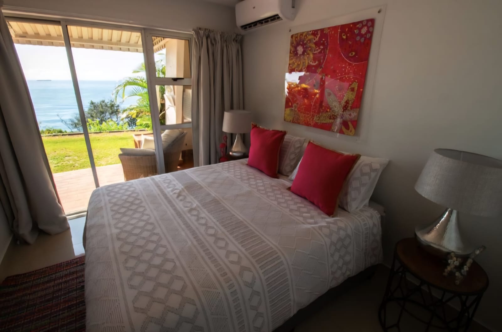 Situated on the ground-floor, this apartment boasts an open-plan kitchen, dining, and lounge area. Sliding doors open onto a patio, lush green lawn and uninterrupted ocean views. This fully renovated apartment’s kitchen features a gas stove, under-counter oven and dishwasher connection. A storage or washing-machine area is conveniently tucked away. The main bedroom with en-suite bathroom opens directly onto the patio and garden, while the second bedroom is serviced by a separate bathroom. Both bedrooms and the living area are fitted with split air-conditioning for year-round comfort.